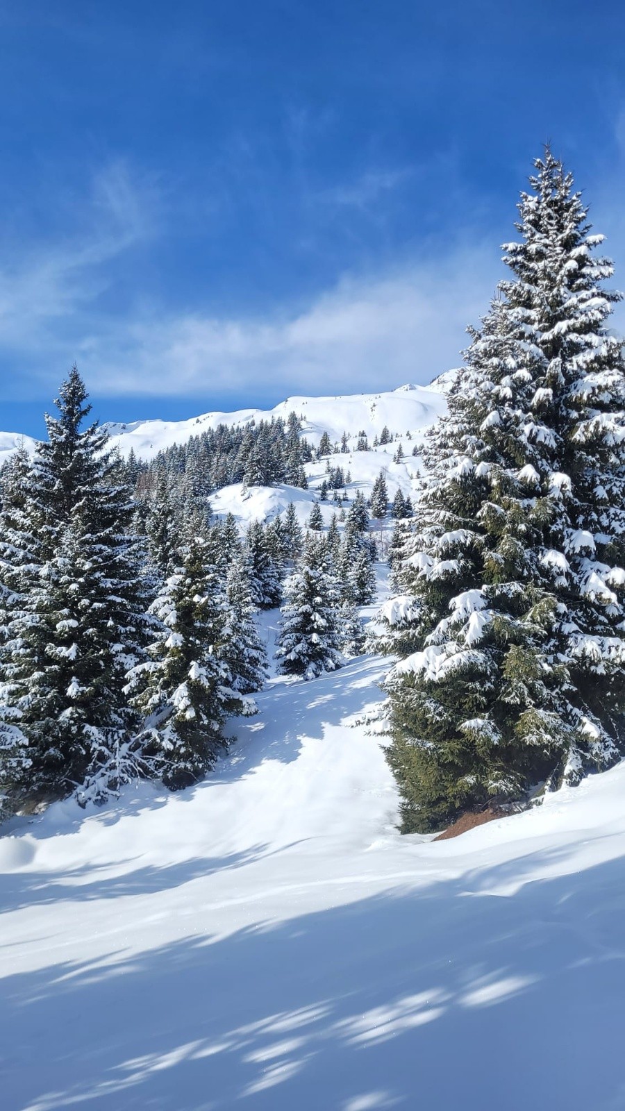 Conditions pour le ski : Le bas forestier est inégal, il faut viser les coupes et zones un peu ouvertes car sous le couvert dense des épicéas, c'est beaucoup plus sec. Dès les clairières et sur tout le haut, c'est poudre sur fond dense, très bon à skier. D'où une bonne skiabilité au total.