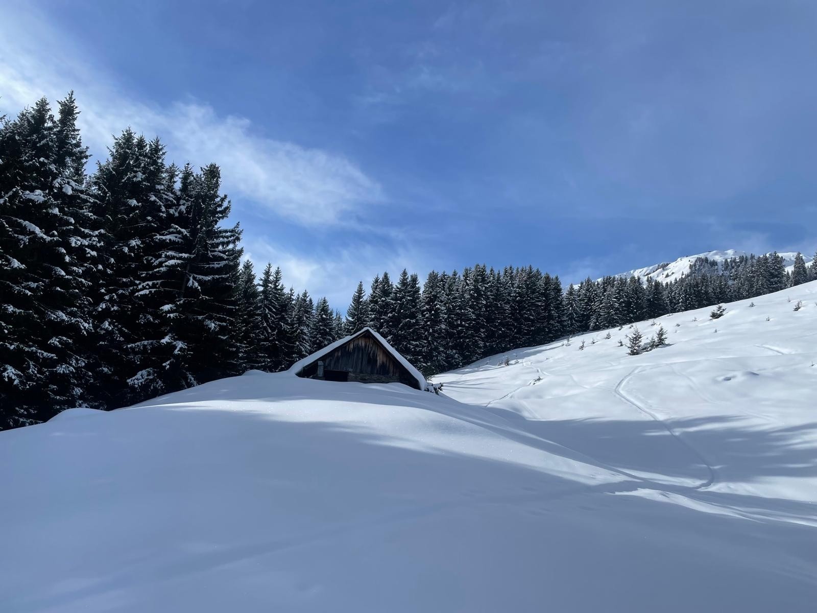Le versant est sauvage, la forêt dense laisse un peu de place à une route, quelques chalets nous accueillent au gré de notre progression vers de larges clairières puis le versant s'ouvre et il faut choisir quelles pentes rayer (temporairement) de nos arabesques.