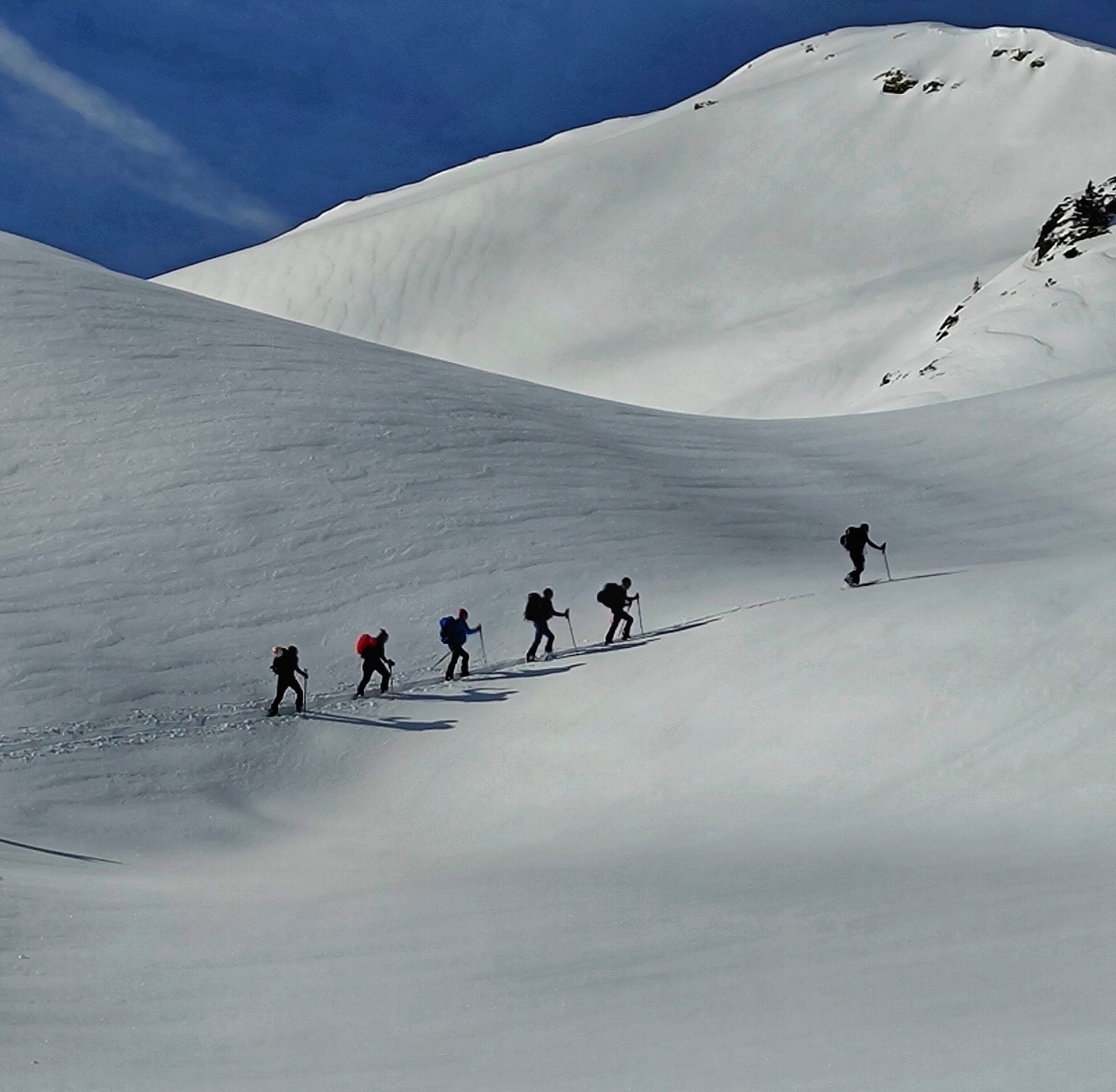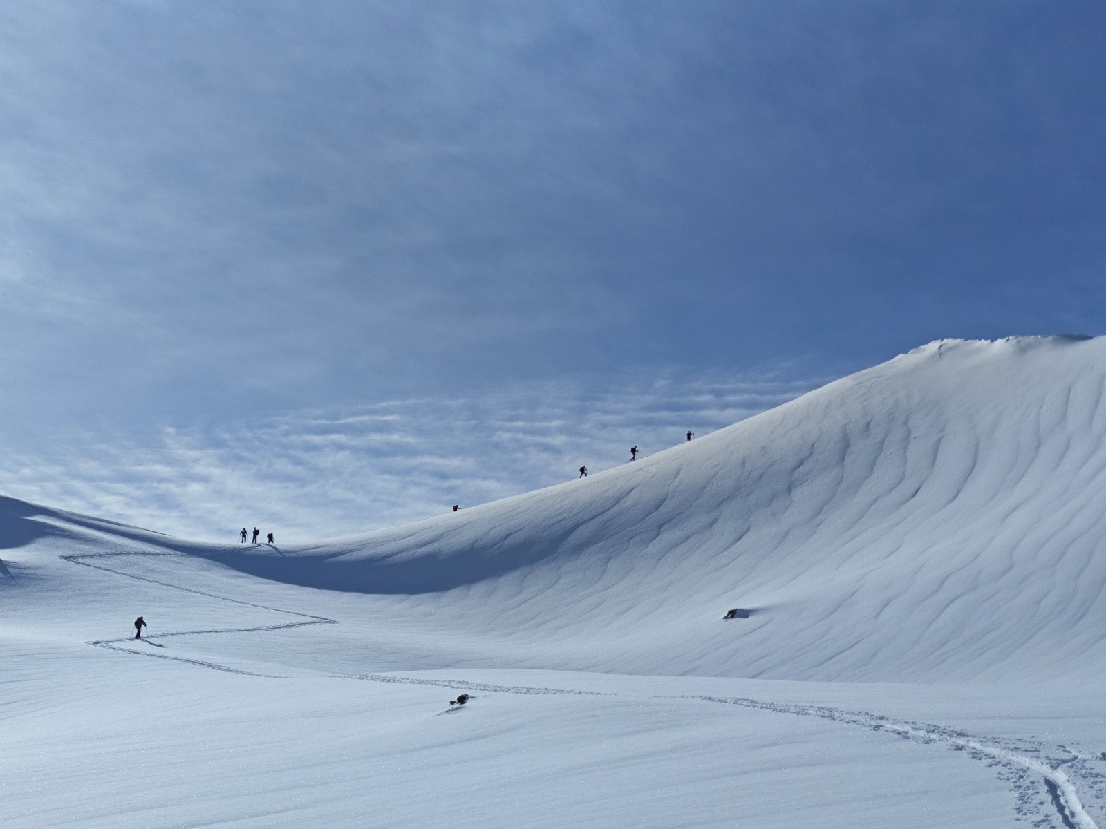 La Dent du Corbeau en boucle était le plan A mais on ne se voyait pas se jeter sereinement dans la pente NE à 9. Dans la même orientation mais plus raisonnable, les pentes au sud du col de Charvan nous attirent l'oeil. On file donc dabord jusqu'à La Thuile pour contempler le panorama - et cocher un sommet "mythique" pour Hélène -, puis on remonte un peu pour cette seconde petite pente bien sympathique. Trop facile dans cette bonne neige. La suite est tout aussi plaisante. Didier enchaîne quand même ses légendaires cabrioles.