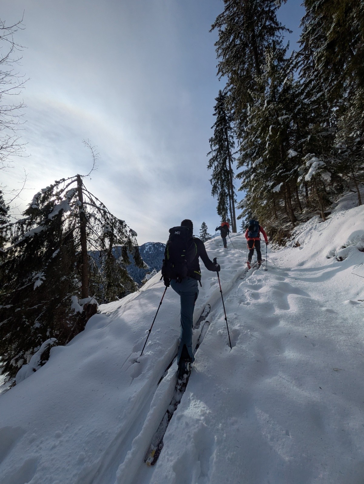 Conditions nivo et activité avalancheuse : Pas d'activité sur l'itinéraire. Pas de coulée ou avalanche visible. Neige froide sur tout l'itinéraire, à peine réchauffée dans le bas au retour. Poudreuse bien skiante au-dessus de 1400.