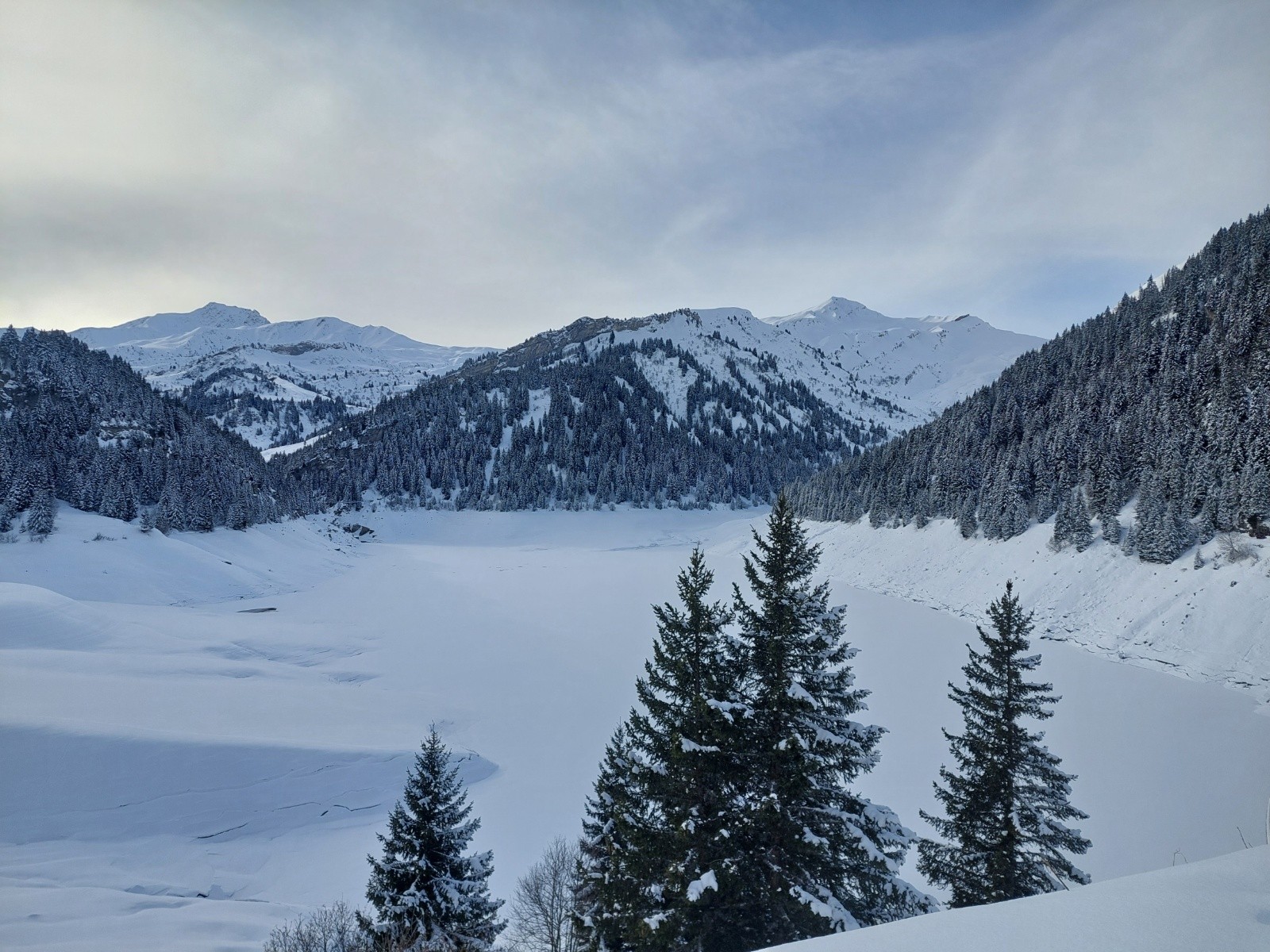 Itinéraire suivi : monté par les thuiles et chalet du riondet . Ça chauffe vite. Une vingtaine de cm de neige poudreuse dans ces pentes sud est . Redescente par la combes nord est. Neige froide sur 30/40 cm . Une fois retrouvé le vallon de la louze on retrouve des traces de skieur hors piste de la station jusqu'au lac de Saint guerin.