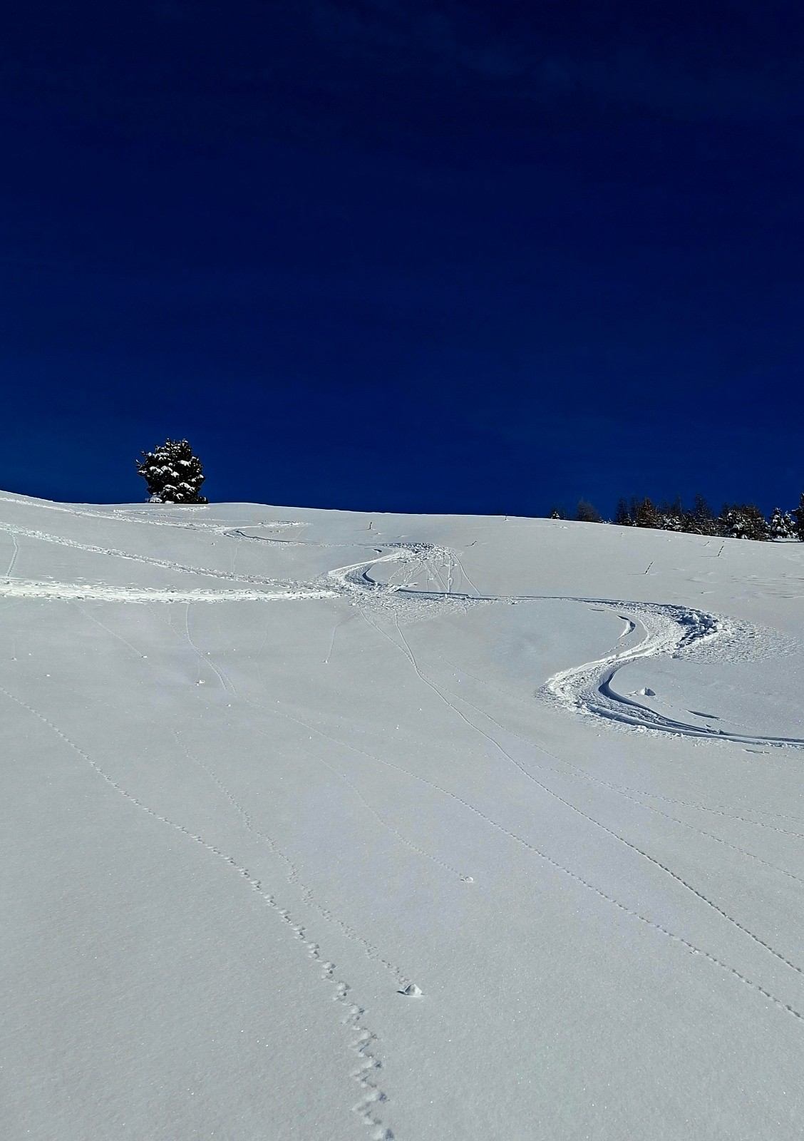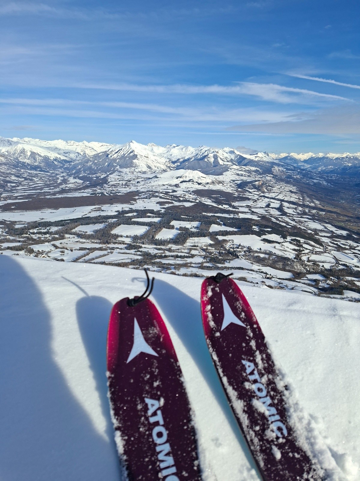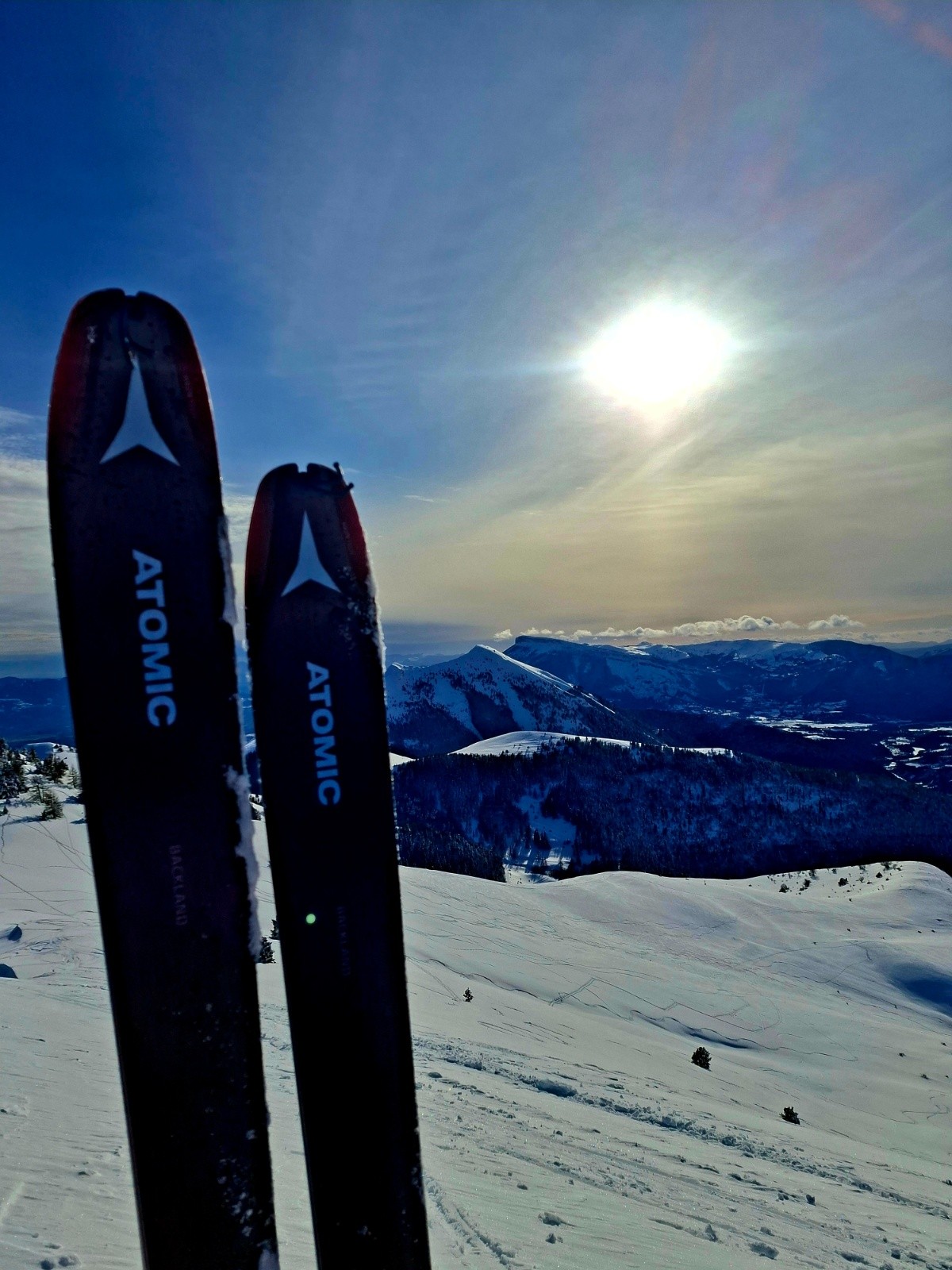 Ça chauffe fort sur l'itinéraire avec le soleil de l'après-midi. Entre le sommet et 1600, la neige est encore poudreuse et légère dans les contre-pentes les moins exposées. Elle commence a bien transformer là où ça prend le soleil.