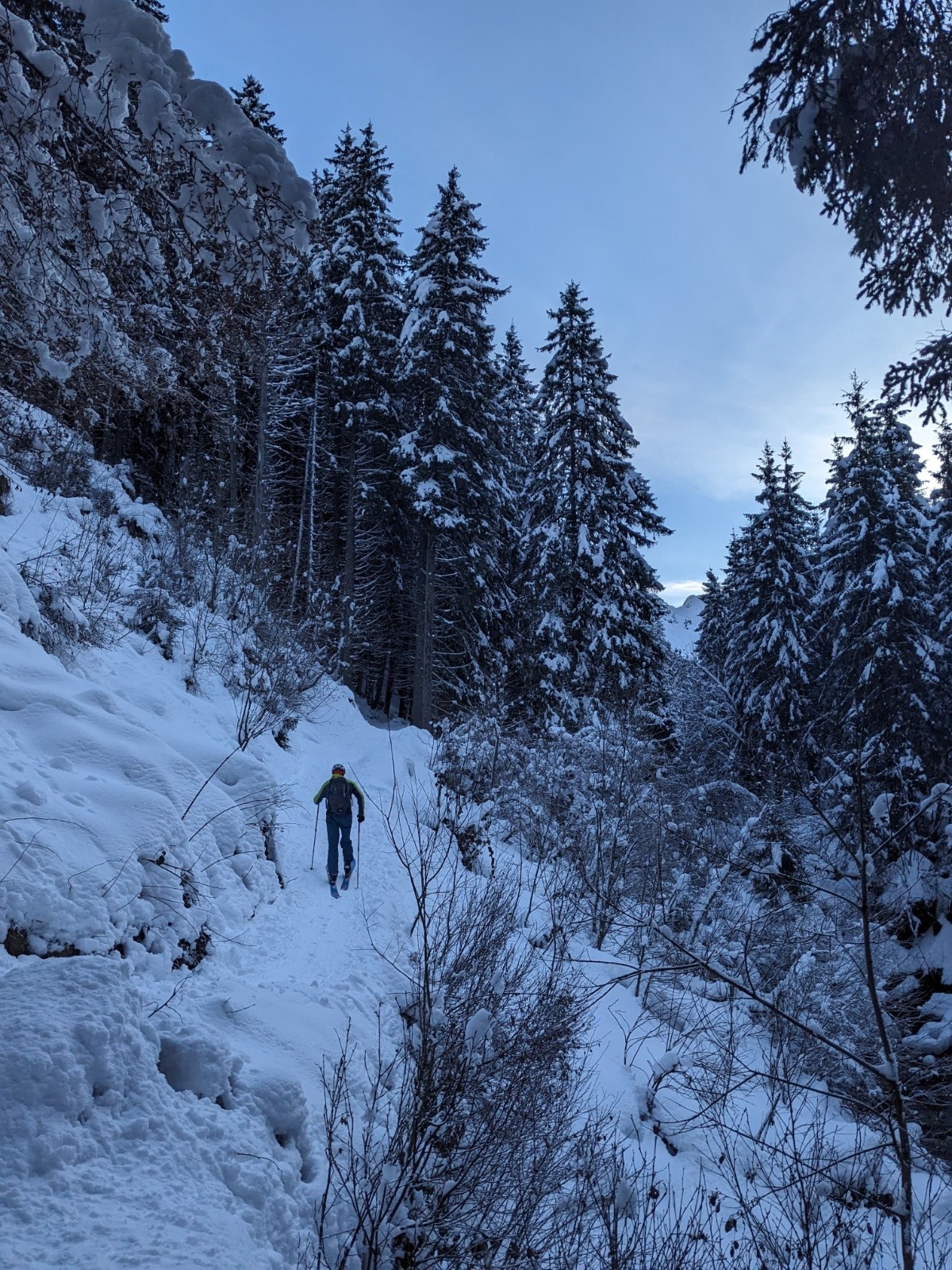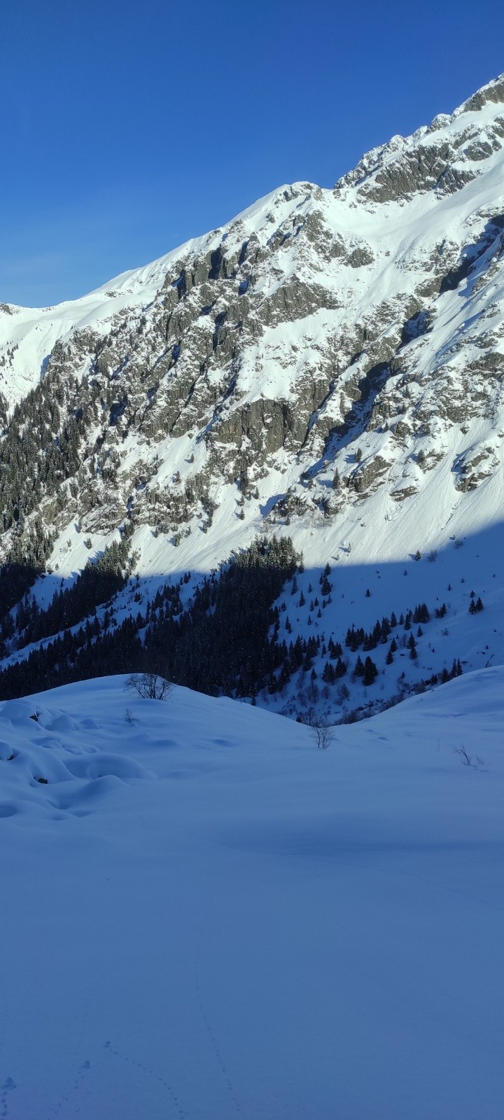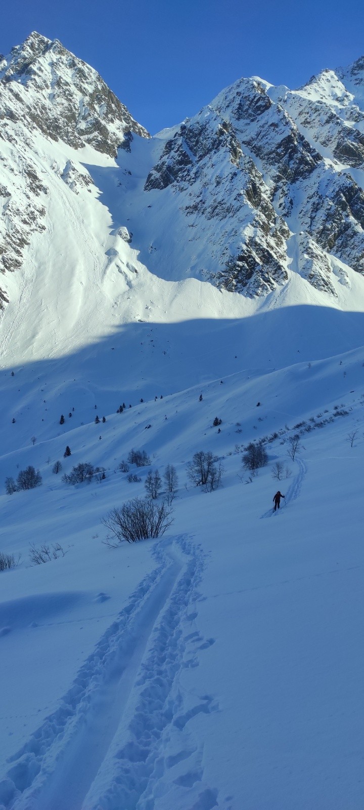 Comme il est est tombé de la neige bas, on s'est dit que c'était l'occasion d'aller de nouveau explorer le vallon de Combe Madame sans trop porter les skis dans la forêt. En effet, on pouvait chausser depuis le parking mais comme il est interdit de skier sur la route (panneau) on a chaussé à l'entrée de la forêt qui passe bien tout du long. On a préféré couper et tracer pour rejoindre l'itinéraire du col plutôt que de faire un détour par le refuge. L'arrivée au col, au soleil réchauffe les corps et permet un pique-nique confortable. La descente est un régal, on a tracé tout du long en veillant bien à ne pas passer dans la zone réservée aux tétras lyres. On a été joueur en cherchant à rejoindre le chemin de montée le plus bas possible....la traversée du ruisseau a été un peu sportif.