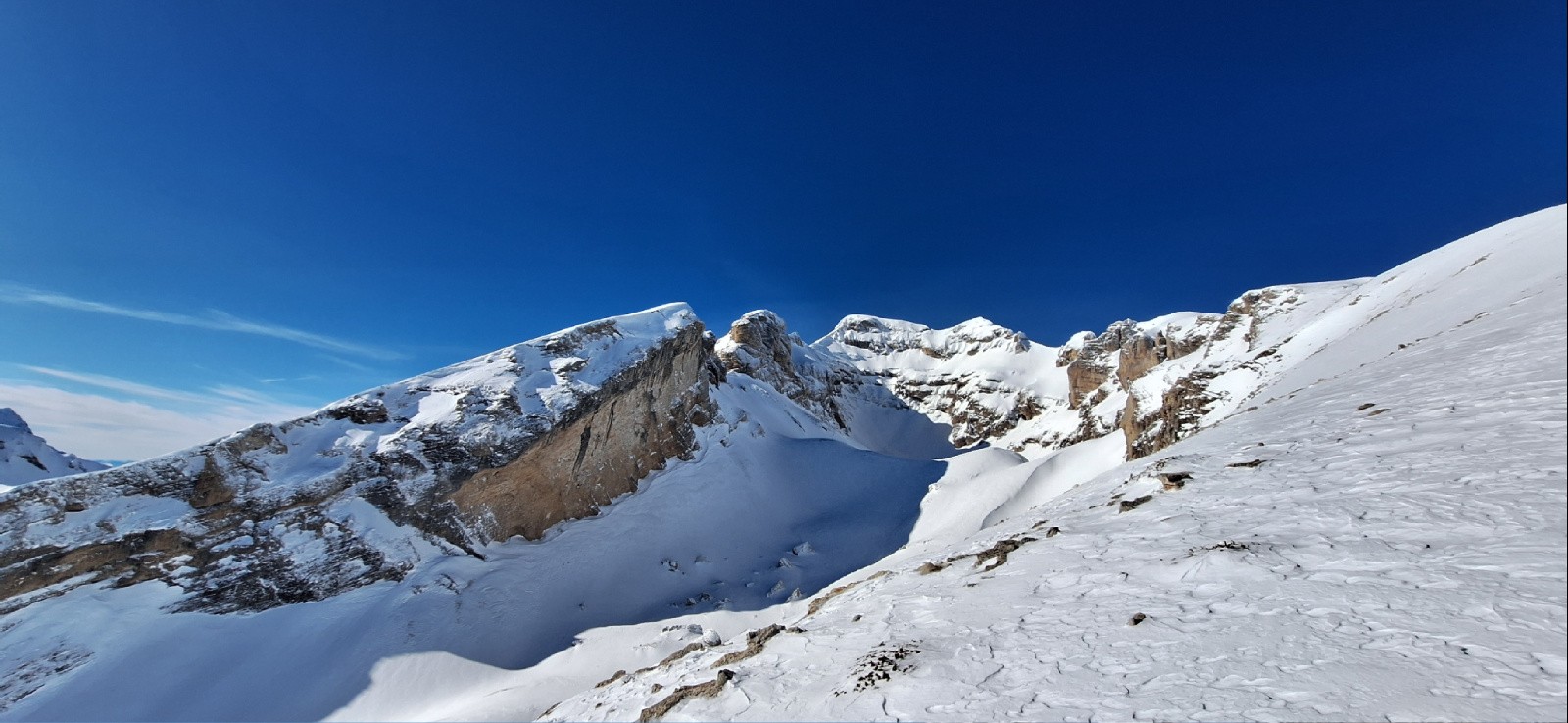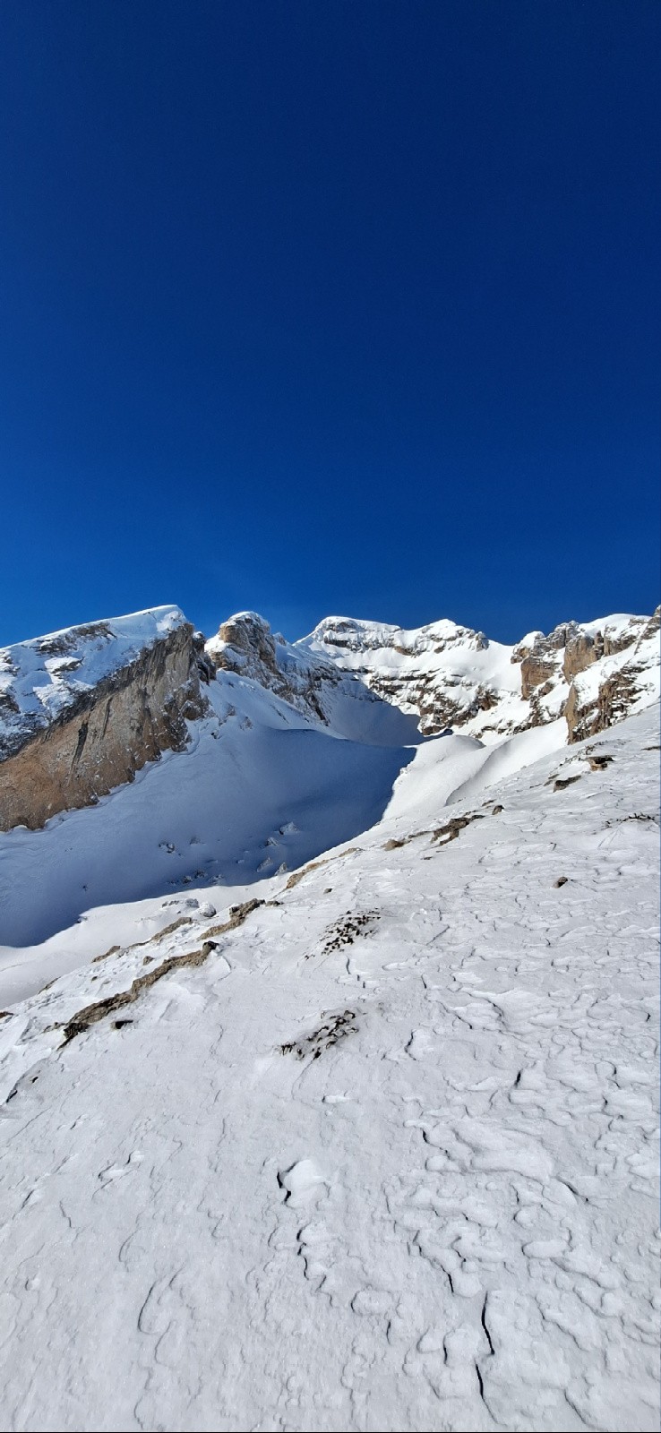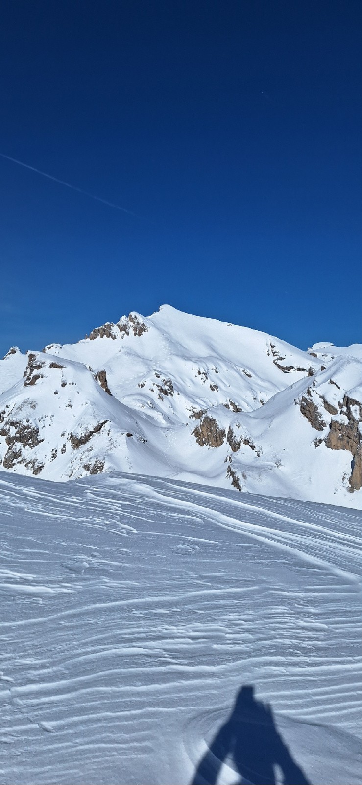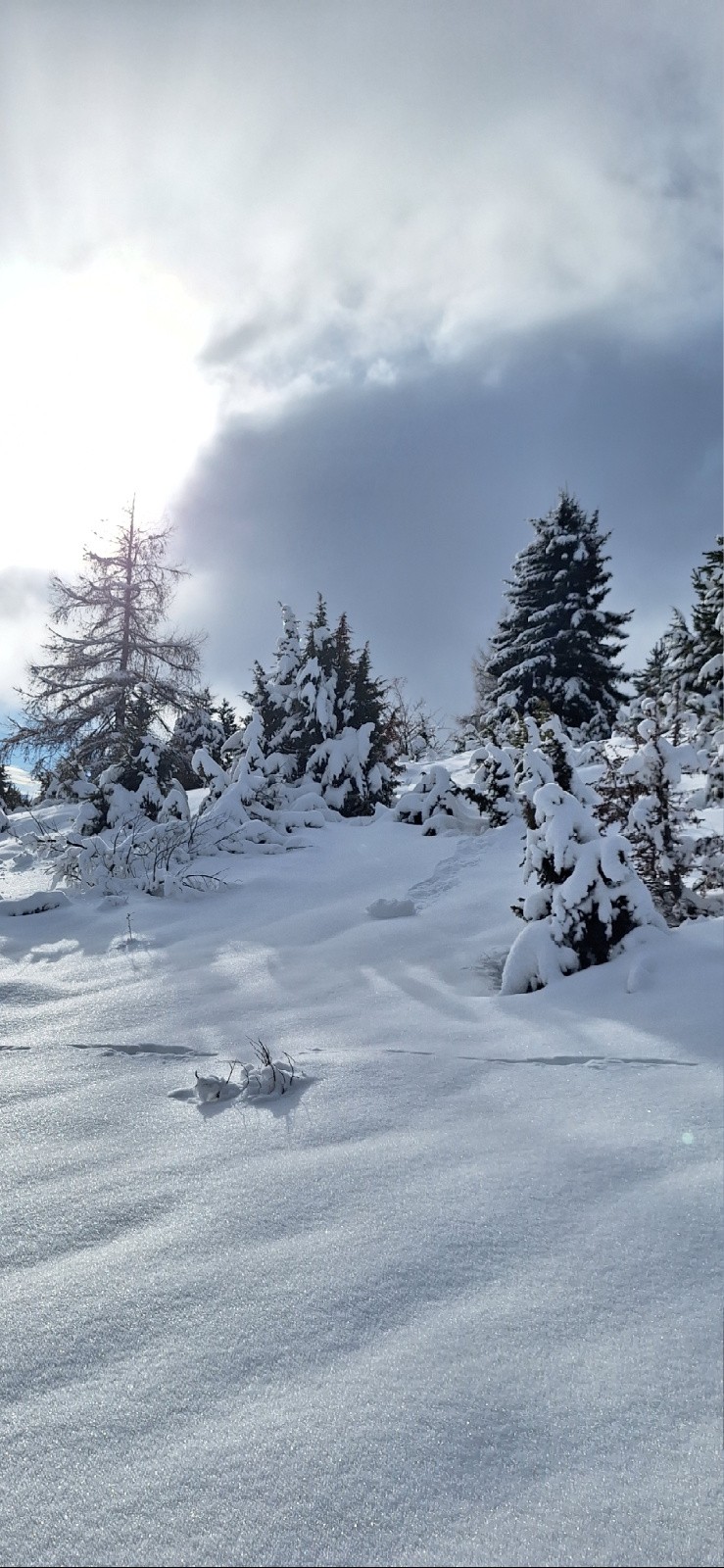 Conditions pour le ski : Neige alternant poudre et soufflée à la montée / Descente globalement poudreuse en peu tassée très agréable à skier même sur le bas avec le soleil !