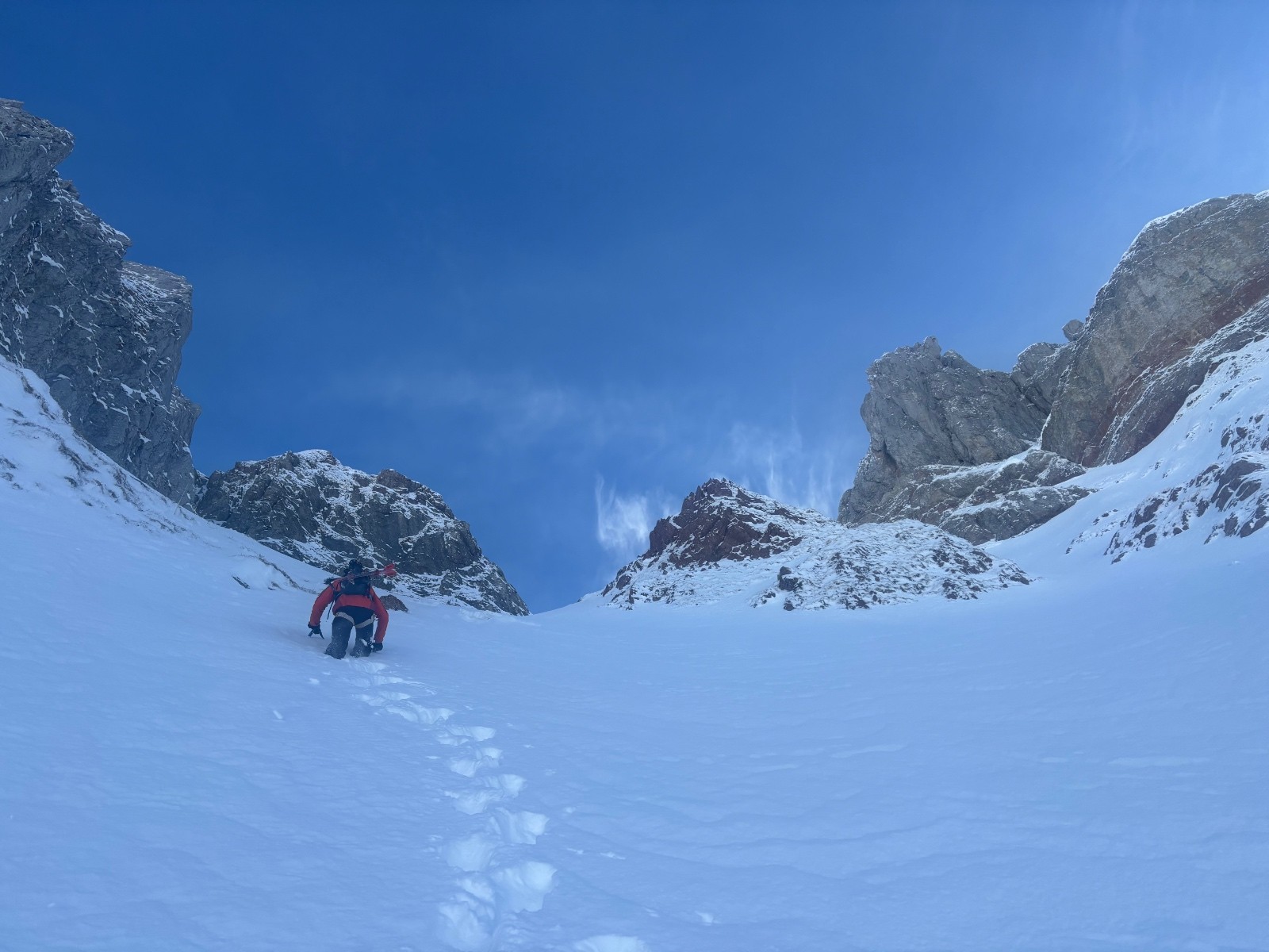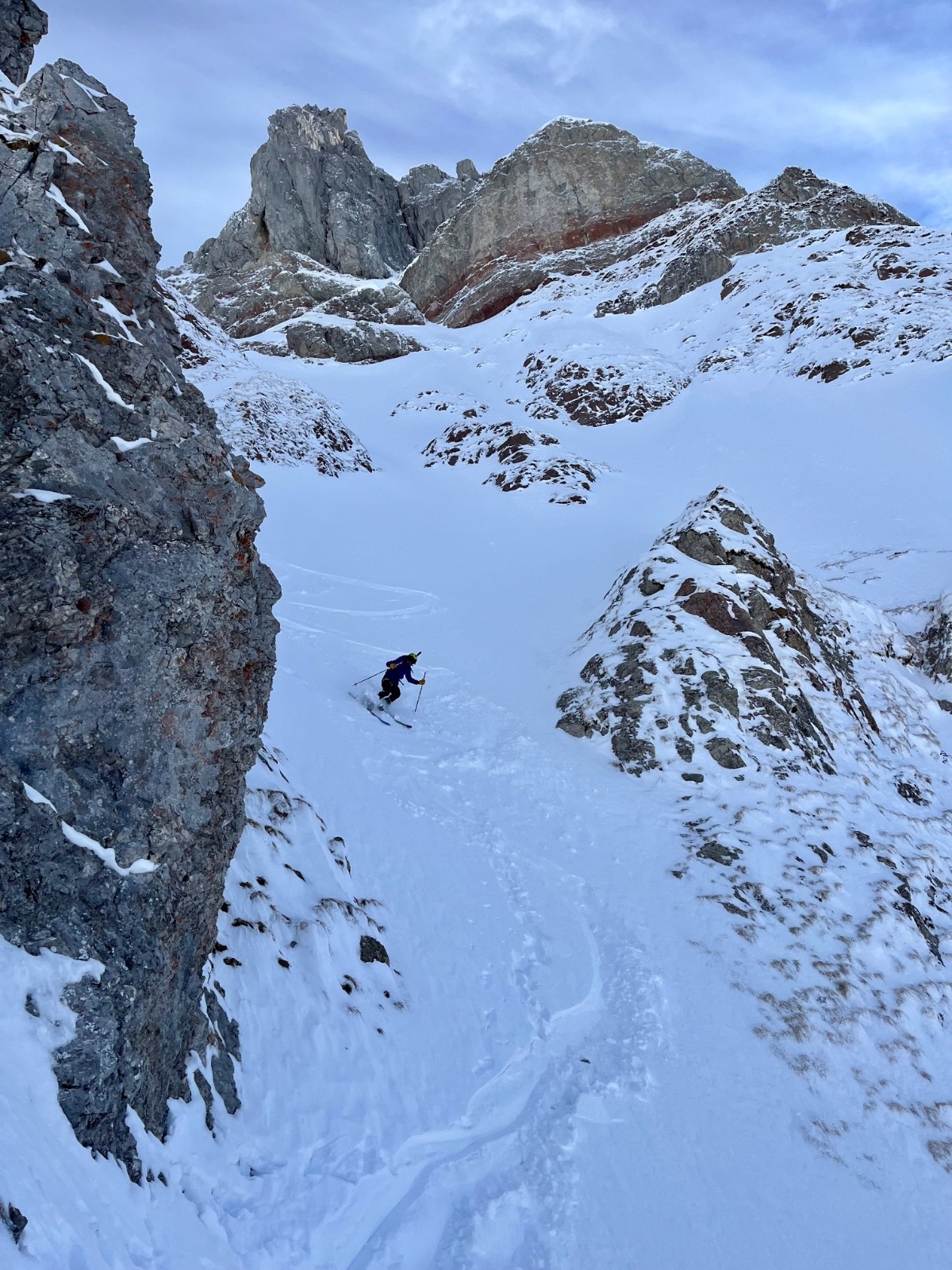 Remarques : Juste génial de skier cette face sans déchausser. Le couloir Ouest est vraiment mythique et sérieux. Merci Encelyn pour la trace toute la journée et bravo pour cette descente !