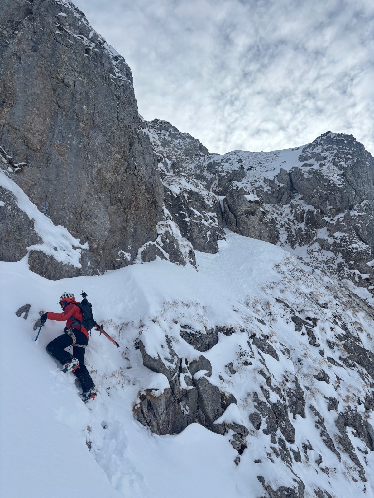 Remontée couloir Ouest : Une rampe en neige puis un système de goulotte bien sec en touffing et mixte. Ca passait à la montée mais je me voyais mal desescalader cela. Le relai est mauvais et seulement au début des difficultés. Pas possible d'en faire un plus haut. Puis gros brassage et un autre ressaut plus haut qui passe bien à la montée et que Encelyn a contourné dans les mottes à la descente.