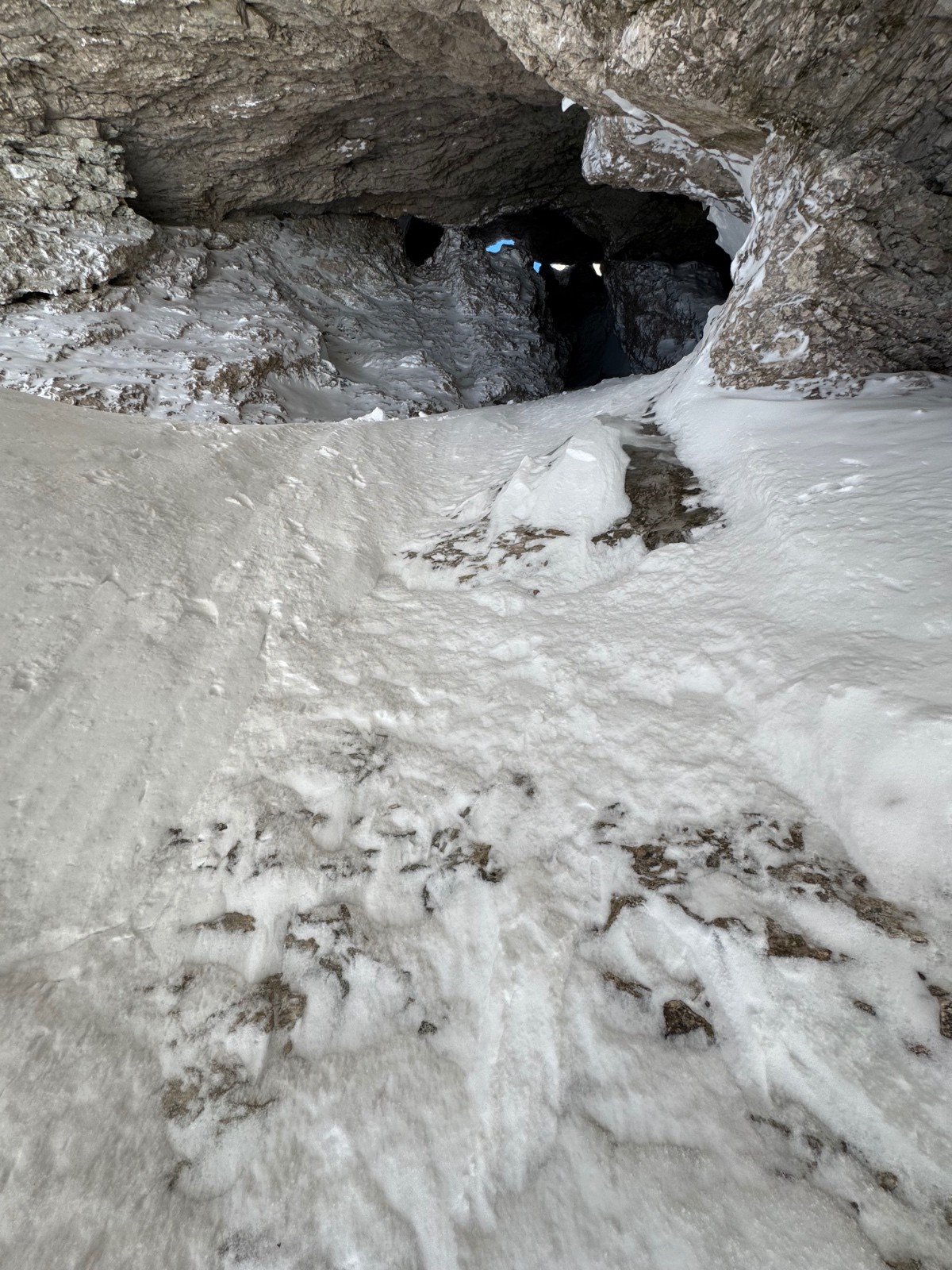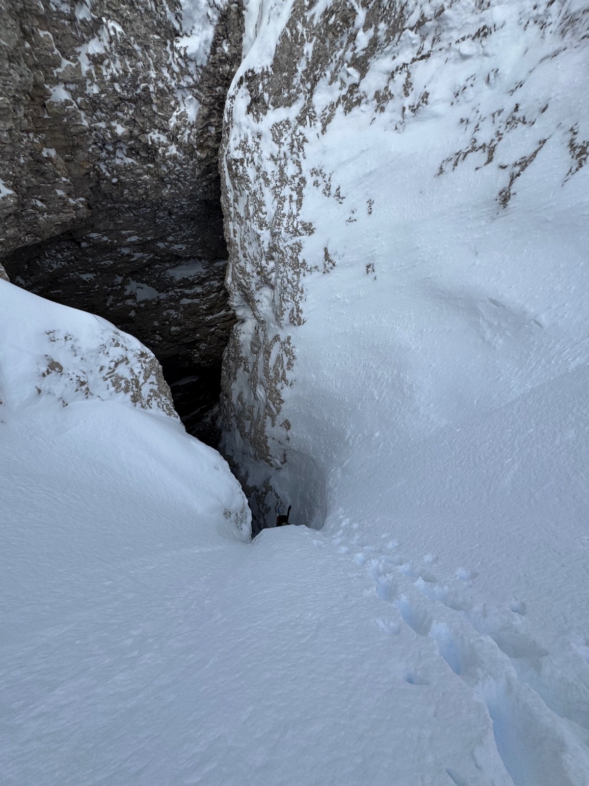 ⚠️ belle plaque partie sur le palier intermédiaire(certainement suite à la chute + vent de mardi), avec une belle épaisseur, la cassure n’a pas atteint le dessous des arches interférantes. (Est-ce qu’il en reste une partie qui demande à partir sous le 2e chorum…?) voir photos