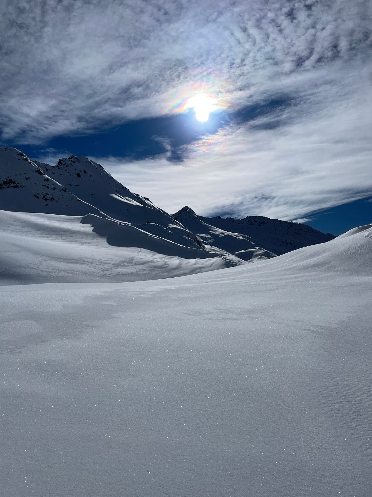 Météo/températures : Il fait bon au départ et le ciel est bleu. Le vent se lève et le froid se fait sentir vers 2000m et jusqu'au sommet. On profite du soleil sur la face après la 1ere descente et il fait très bon