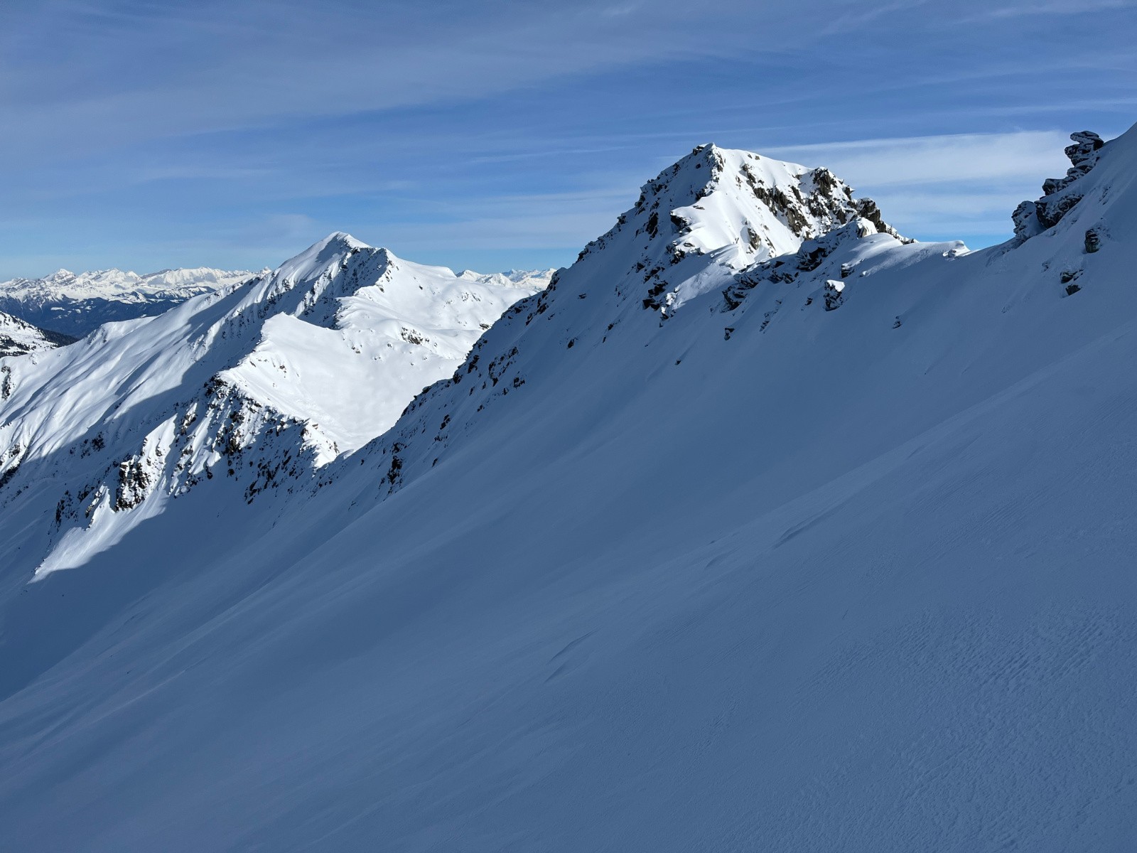 J'induis Cédric en erreur sur le chemin du départ et on se retrouve un peu trop haut pour rejoindre le ruisseau. La journée commence avec un petit slalom au milieu des arbustes... Ça nous met dans l'ambiance. La montée se fera sans encombre et dans un calme incroyable. Quand on arrive sous la pointe de la combe Bronsin, Cédric lance un : on va sortir sur la crète hein ! C'est vrai qu'on imagine déjà que la vue sera très belle. Et en plus en plein soleil ! Antony ne savait pas que la sortie était labellisée "aventure". Il est de bonne constitution mais il se décompose un peu quand il voit Cédric se lancer dans des conversions sur une pente à plus de 40... Je passe ici les précautions et l'évaluation des risques mais tout cela a été discuté. Cédric arrive sur la crête heureux et on le rejoint chacun à notre tour. Comme prévu la vue est juste incroyable. Mais que dire de cette descente sans être indécente. Si - je peux dire à Calvin (à qui je dédie ce premier CR :)) qu'il aurait pu déployer avec joie son élégance à skis mais bon ... il est pas venu, il est pas venu... tant pis pour lui!