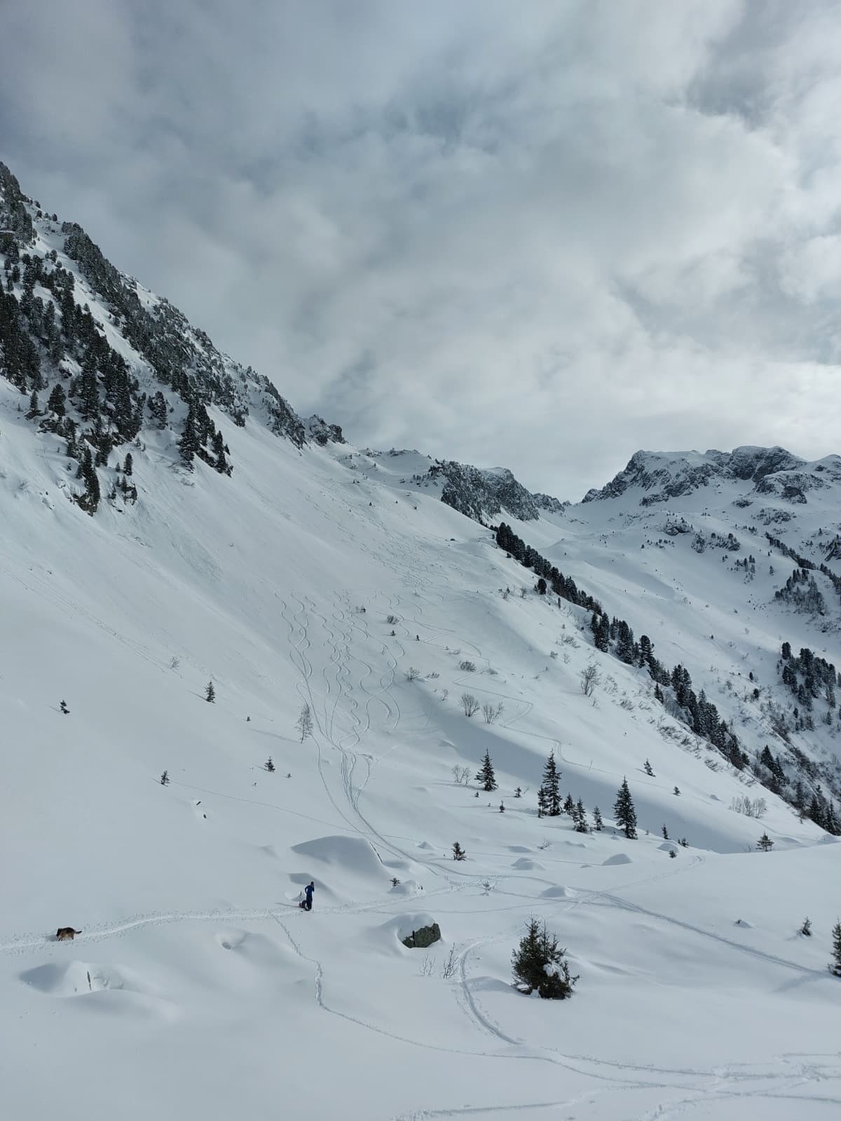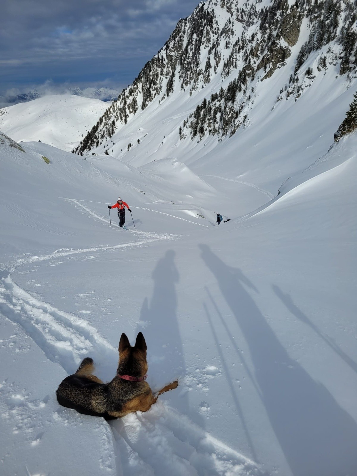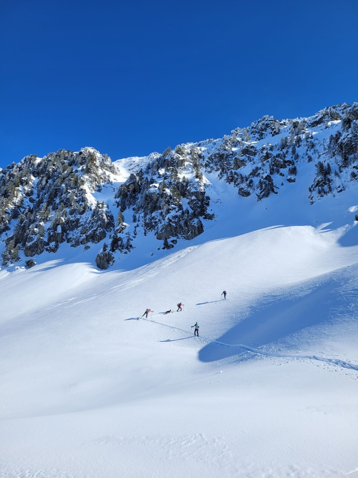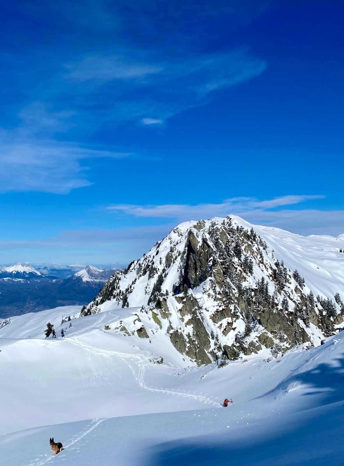 Nous commençons par suivre des traces qui s'éloignent de notre itinéraire... du coup on bifurque, on bûcheronne dans la forêt, on n'aura jamais vraiment compris où se situe la vraie trace au départ (d'ailleurs si quelqu'un a LA trace LA vraie, on est preneur) on finira par retrouver notre chemin (le talent? Le flair de la chienne? L'histoire ne le dit pas). À la montée on se rend compte que les faces exposées au soleil sont légèrement croûtées par contre en Nord une magnifique poudreuse légère nous attend. Nous montons directement jusqu'à la Grande Roche Blanche en évitant au maximum les pentes de plus de 30 degrés, malgré tout quelques passages légèrement plus raides mais très courts sont inévitables, nous nous espaçons, absolument rien ne bouge. Au sommet c'est une explosion de beauté, la vue sur les sommets est à couper le souffle, du Mont-Blanc aux Aiguilles d'Arves en passant par la Grande Casse, et la Meije au loin. Nous choisissons pour la descente de basculer dans le vallon du lac vert (celui qui monte au Fort) et après quelques virages renonçons, c'est trop raide et une belle accumulation nous dissuade de poursuivre. Très prudemment nous rebroussons chemin et descendons en suivant notre itinéraire de montée (neige incroyable!) jusqu'à trouver un passage moins raide pour ce fameux vallon (parce que renoncer c'est OK mais trouver un plan B "safe" pour profiter de la poudreuse parfois c'est possible). Nous remontons donc ce vallon tout aussi vierge que le premier pour le descendre (neige incroyable bis repetita), repeauter et retrouver notre itinéraire de descente initial.