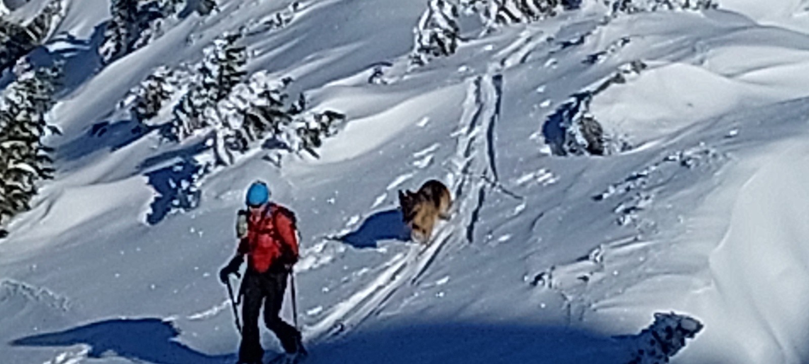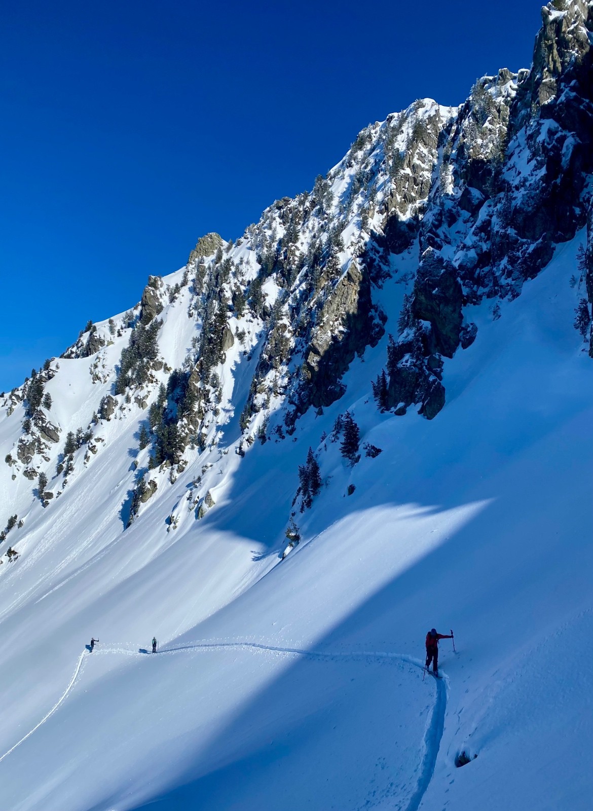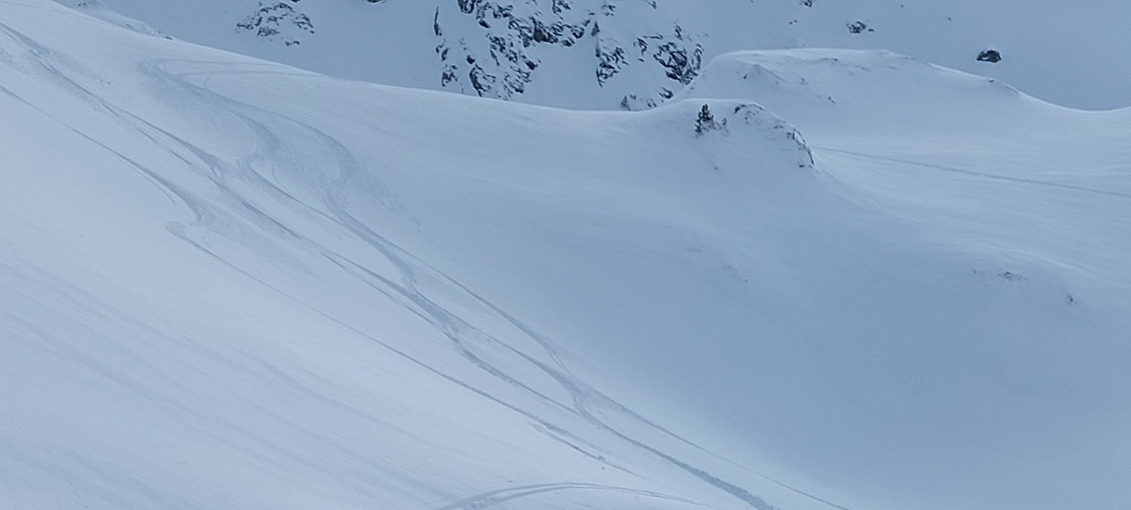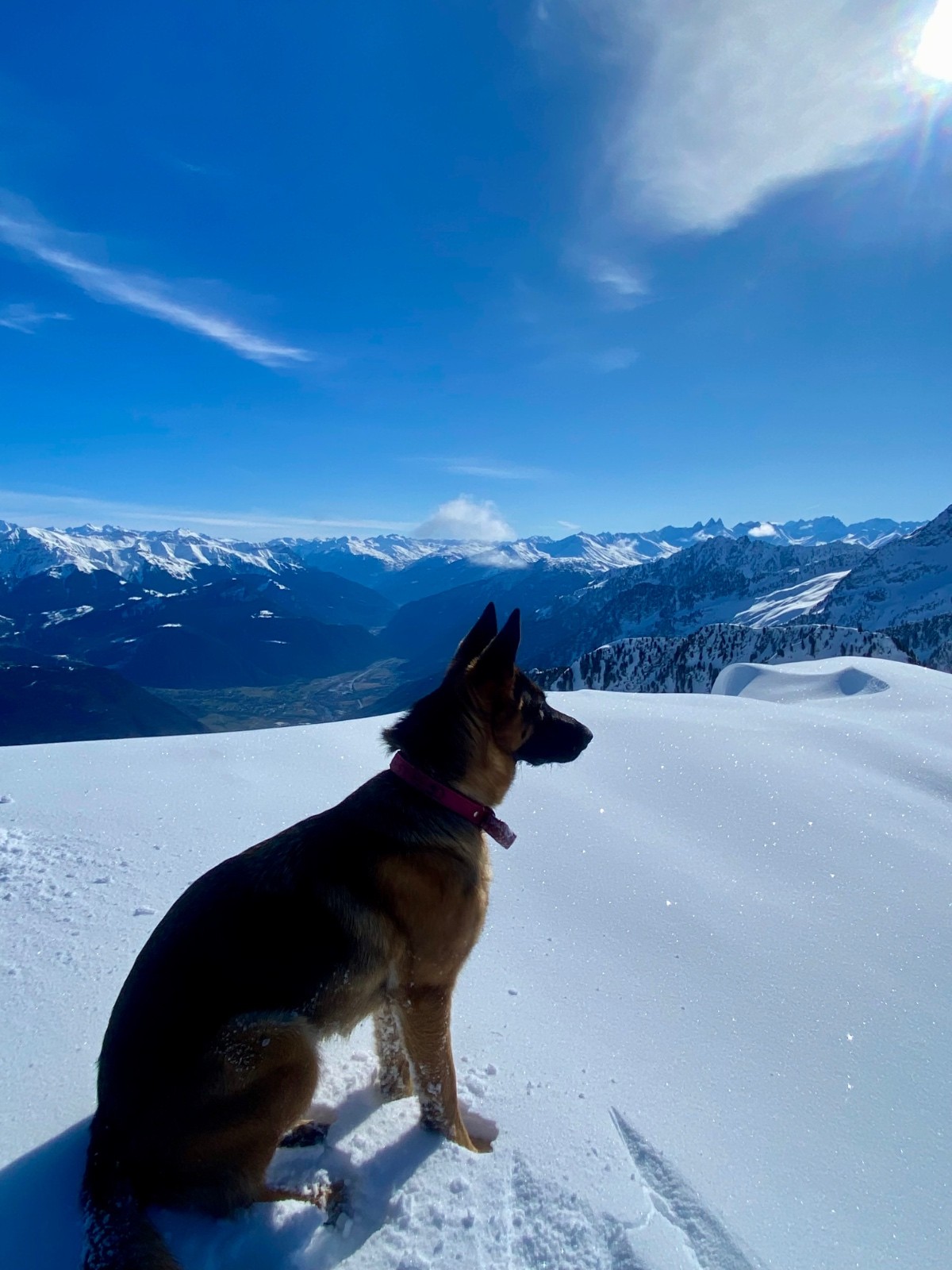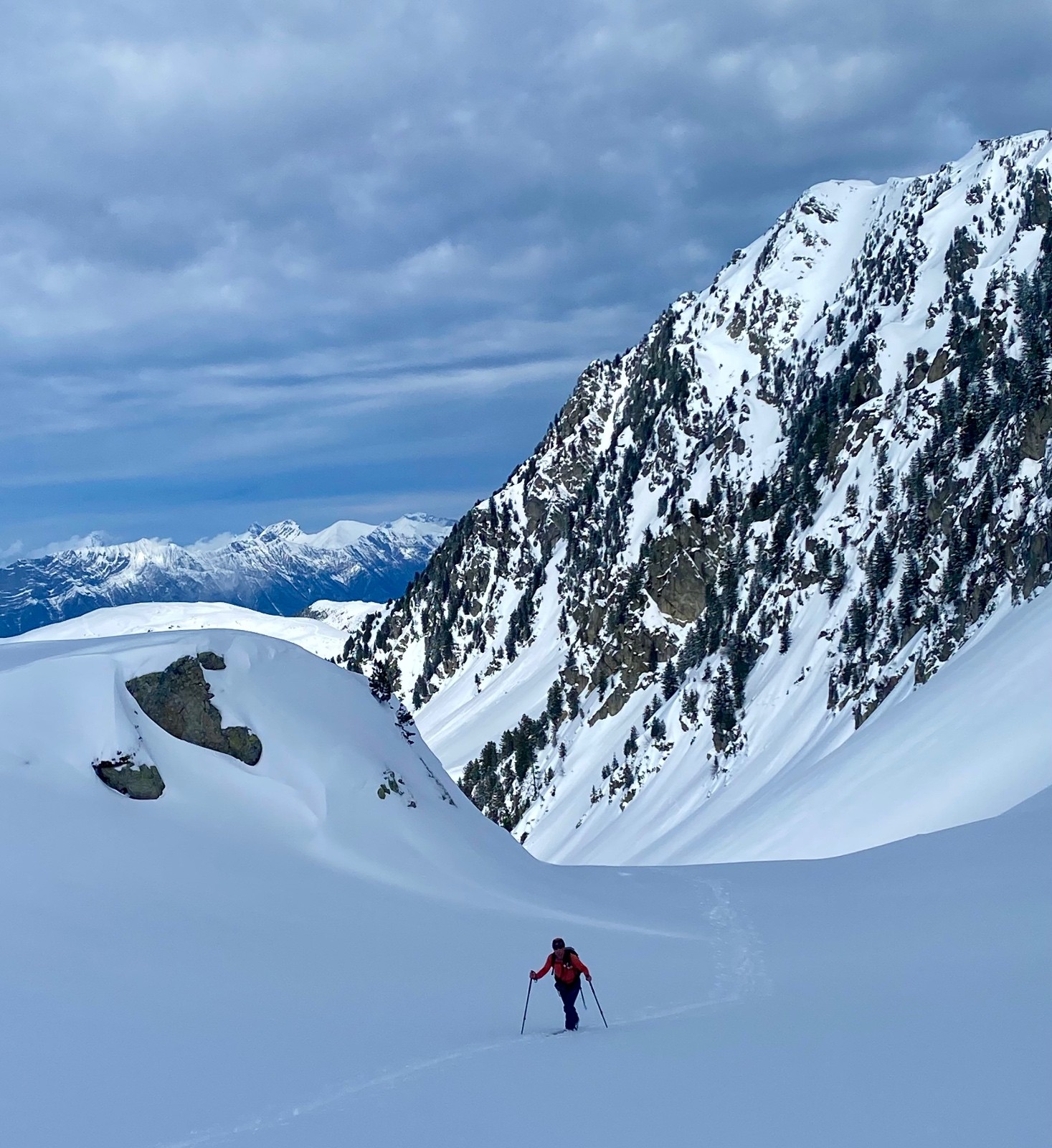 Nous commençons par suivre des traces qui s'éloignent de notre itinéraire... du coup on bifurque, on bûcheronne dans la forêt, on n'aura jamais vraiment compris où se situe la vraie trace au départ (d'ailleurs si quelqu'un a LA trace LA vraie, on est preneur) on finira par retrouver notre chemin (le talent? Le flair de la chienne? L'histoire ne le dit pas). À la montée on se rend compte que les faces exposées au soleil sont légèrement croûtées par contre en Nord une magnifique poudreuse légère nous attend. Nous montons directement jusqu'à la Grande Roche Blanche en évitant au maximum les pentes de plus de 30 degrés, malgré tout quelques passages légèrement plus raides mais très courts sont inévitables, nous nous espaçons, absolument rien ne bouge. Au sommet c'est une explosion de beauté, la vue sur les sommets est à couper le souffle, du Mont-Blanc aux Aiguilles d'Arves en passant par la Grande Casse, et la Meije au loin. Nous choisissons pour la descente de basculer dans le vallon du lac vert (celui qui monte au Fort) et après quelques virages renonçons, c'est trop raide et une belle accumulation nous dissuade de poursuivre. Très prudemment nous rebroussons chemin et descendons en suivant notre itinéraire de montée (neige incroyable!) jusqu'à trouver un passage moins raide pour ce fameux vallon (parce que renoncer c'est OK mais trouver un plan B "safe" pour profiter de la poudreuse parfois c'est possible). Nous remontons donc ce vallon tout aussi vierge que le premier pour le descendre (neige incroyable bis repetita), repeauter et retrouver notre itinéraire de descente initial.