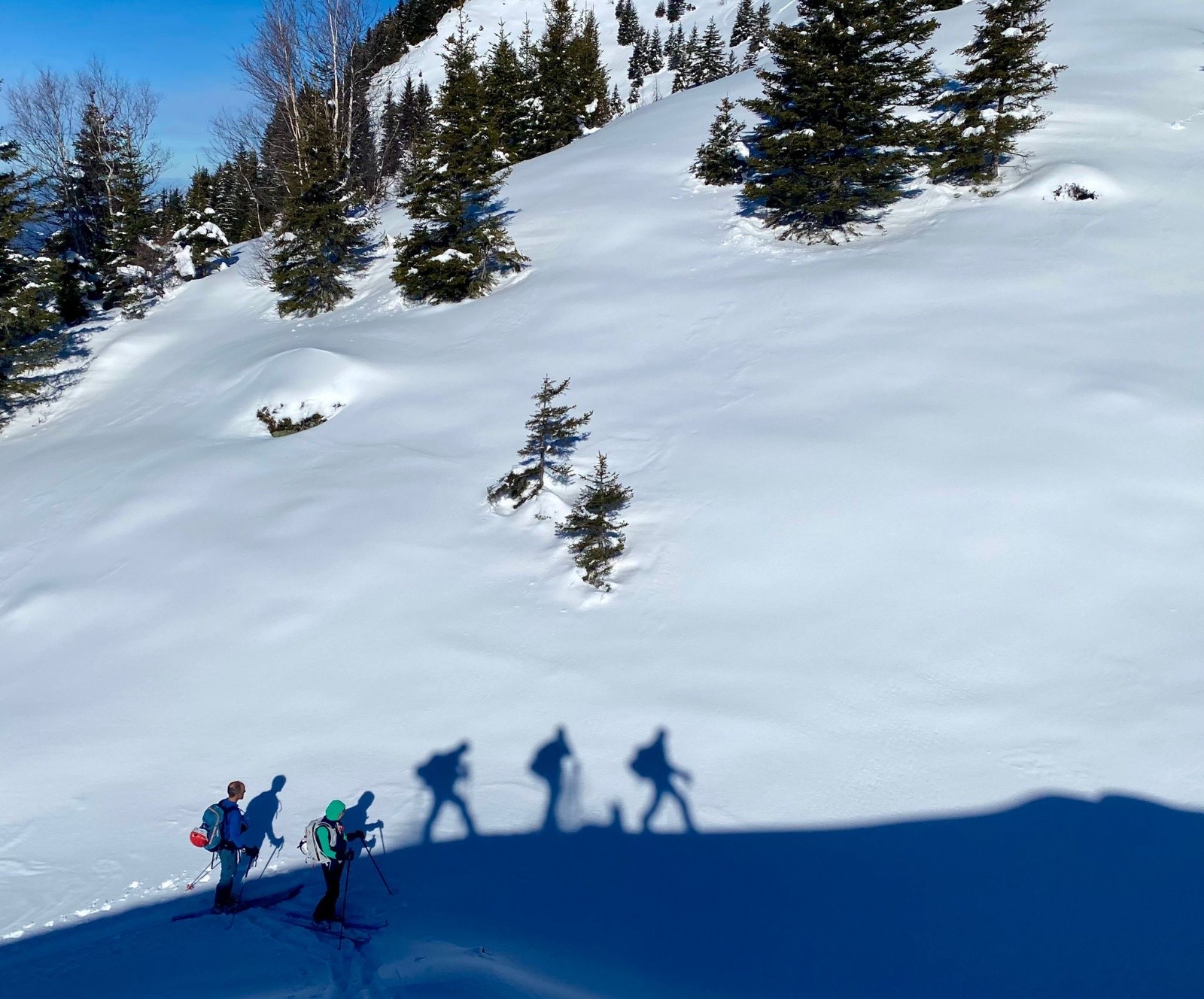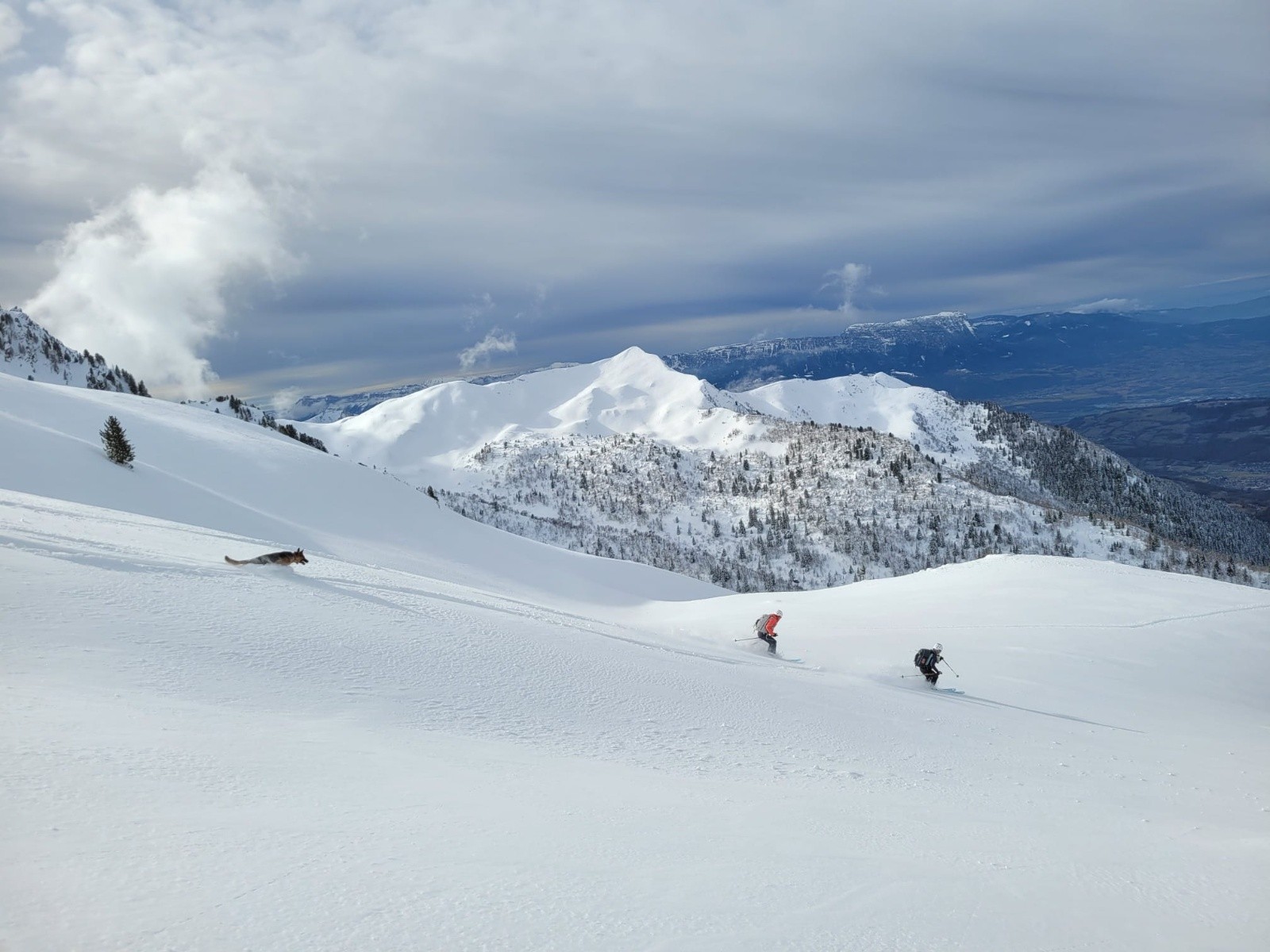 Nico envisage de redescendre directement à la voiture, le reste du groupe préférerait éviter une descente éprouvante en forêt (Et oui ici ce n'est pas le pays du Méléze!) et décide de monter à Chapotet par le col de la Perche pour redescendre par ses crêtes Nord Ouest. C'est Tunduk qui tranchera en refusant obstinément de diviser son troupeau (quel leadership elle a cette bergère allemande!), on continue donc tous ensemble! Et c'est le choix gagnant, encore de la poudreuse en redescendant du Chapotet puis la piste forestière sera bien enneigée jusqu'à la voiture.