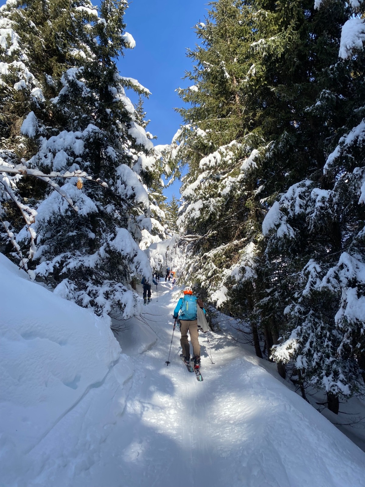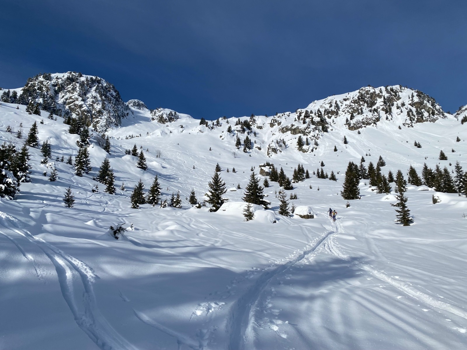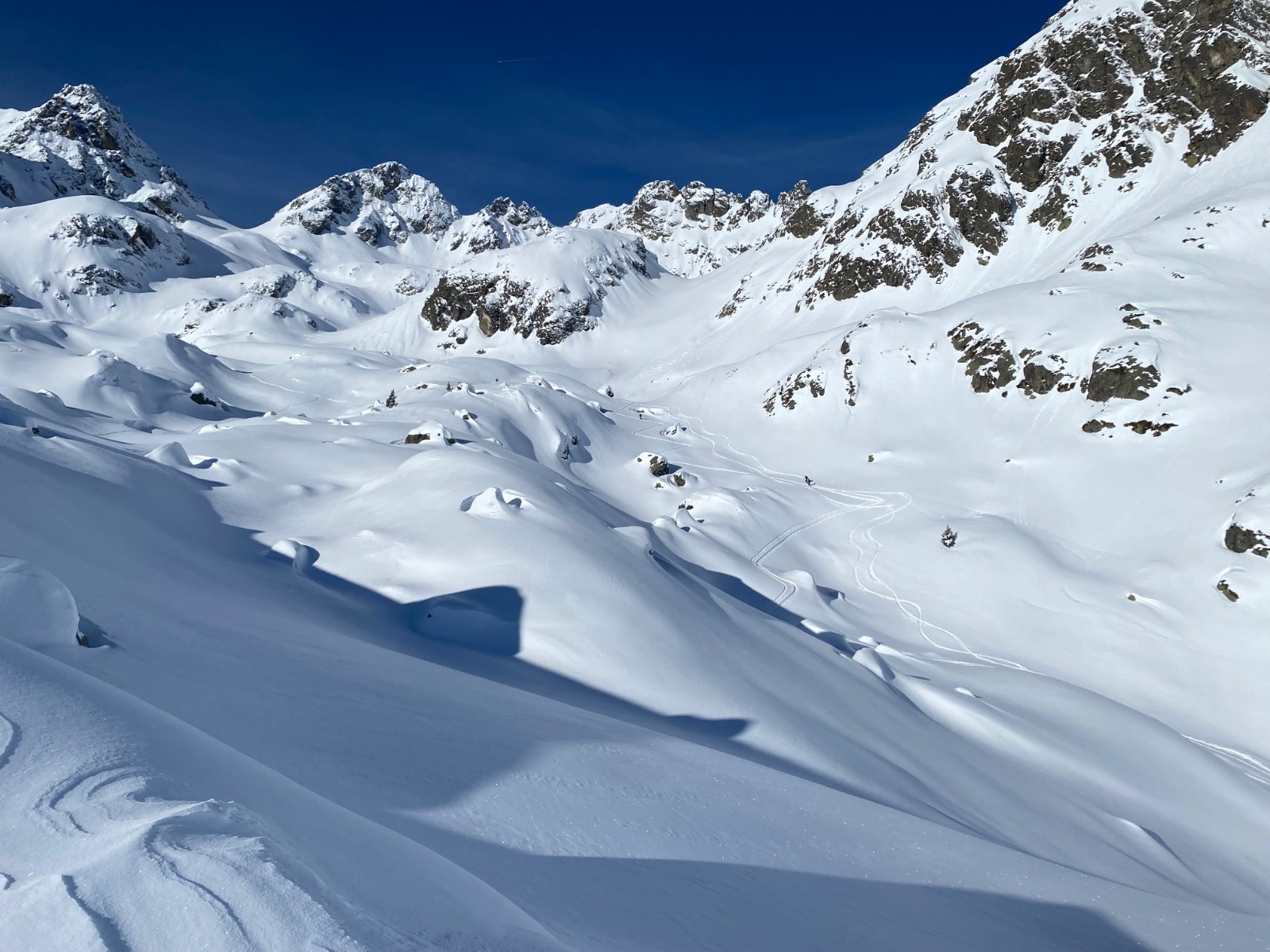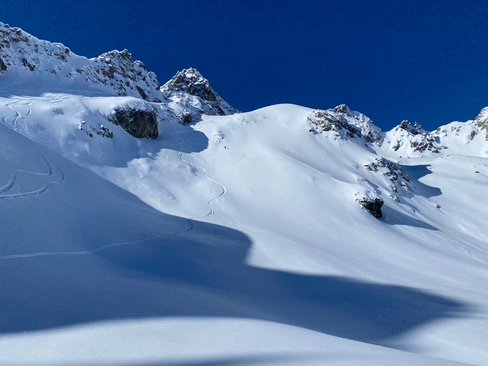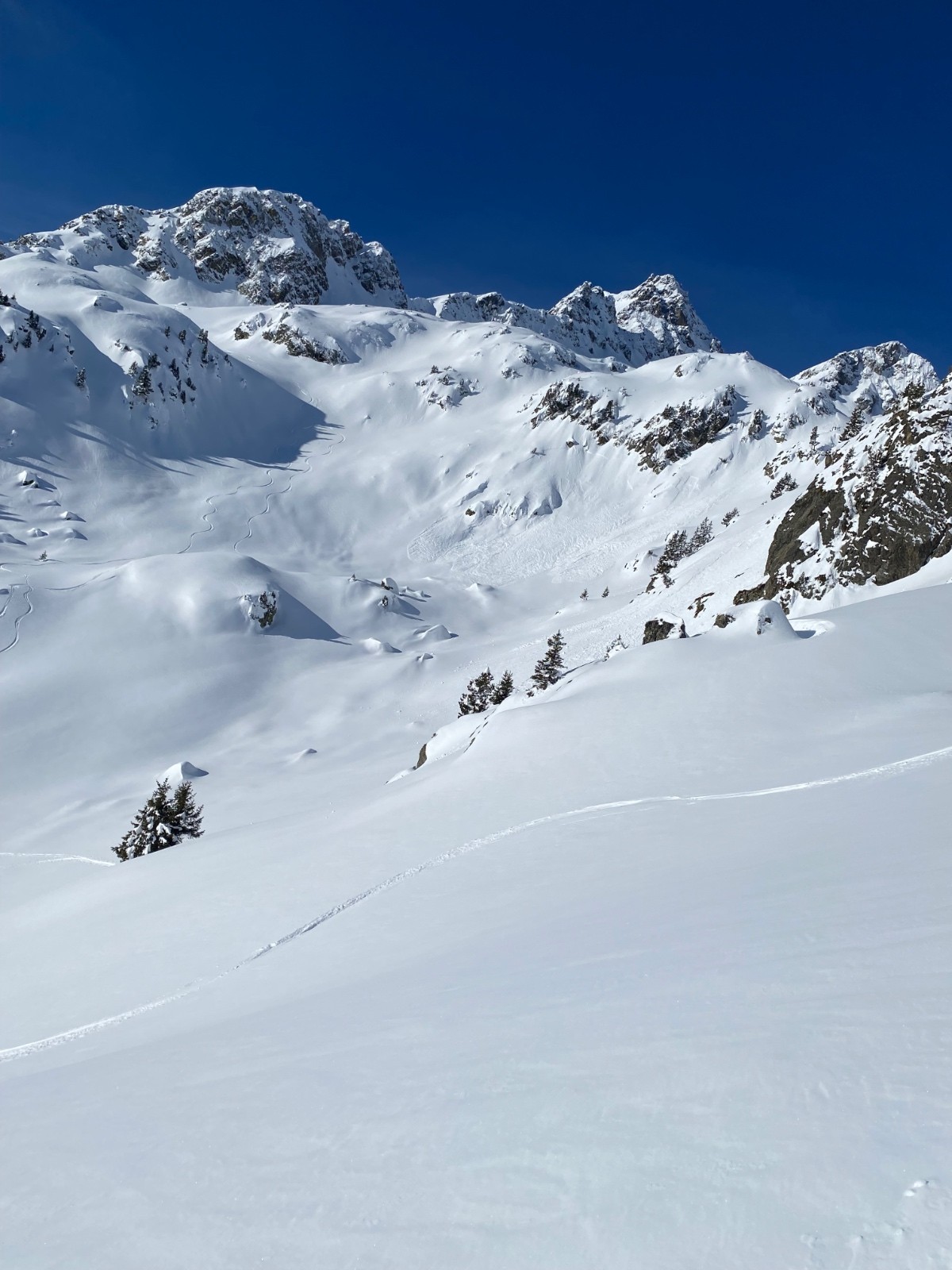 Conditions nivo et activité avalancheuse : qq très rares et légères coulées en pentes raides d’Est. J’ai pris qq pentes localement bien raides et c’est stable. Même deux trois passages dans des goulets sans sluff.