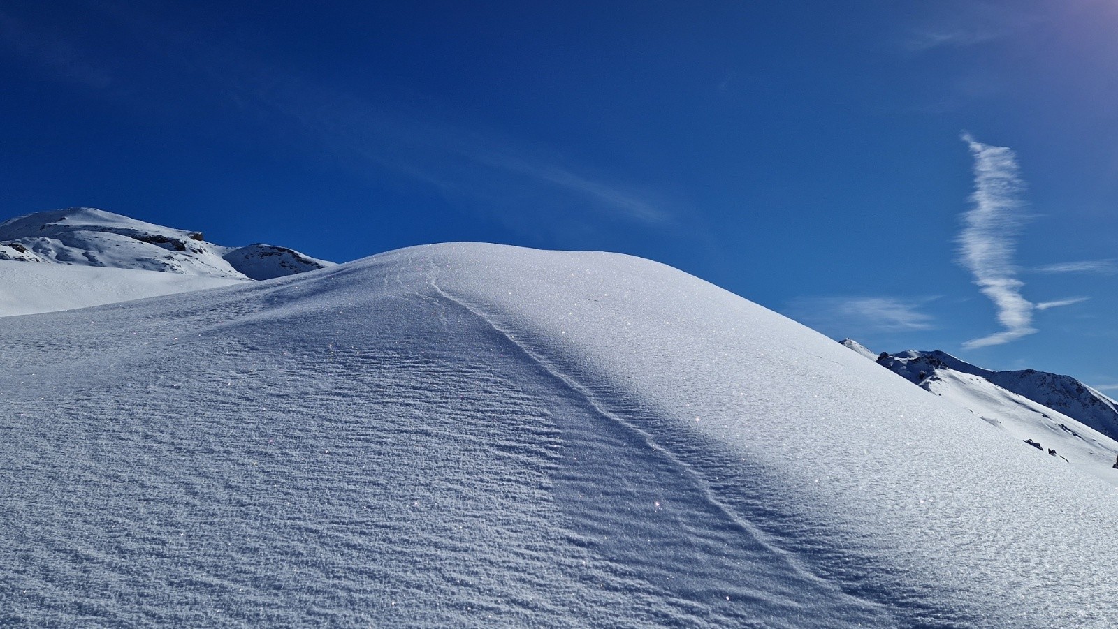 Je décide tout de même de rejoindre la crête par le sentier d'été, qui reste en pente "douce", en suivant la trace du randonneur qui nous a précédés. Superbe vue du sommet, de la Mortice aux Ecrins, les voiles nuageux embellissent le cadre.