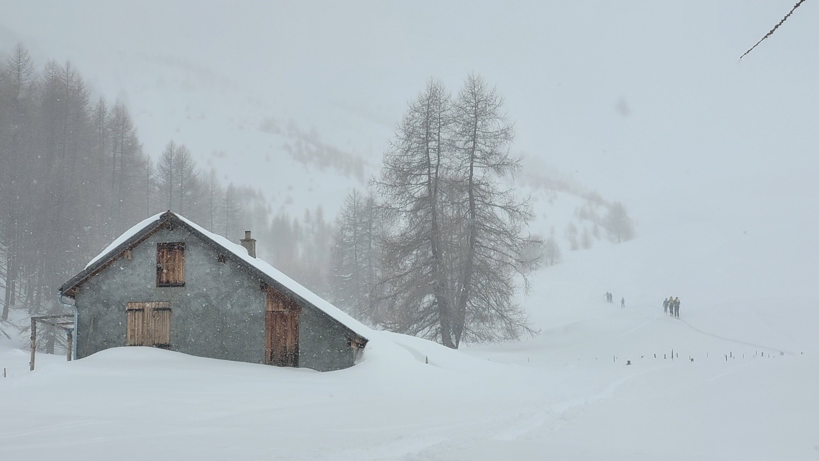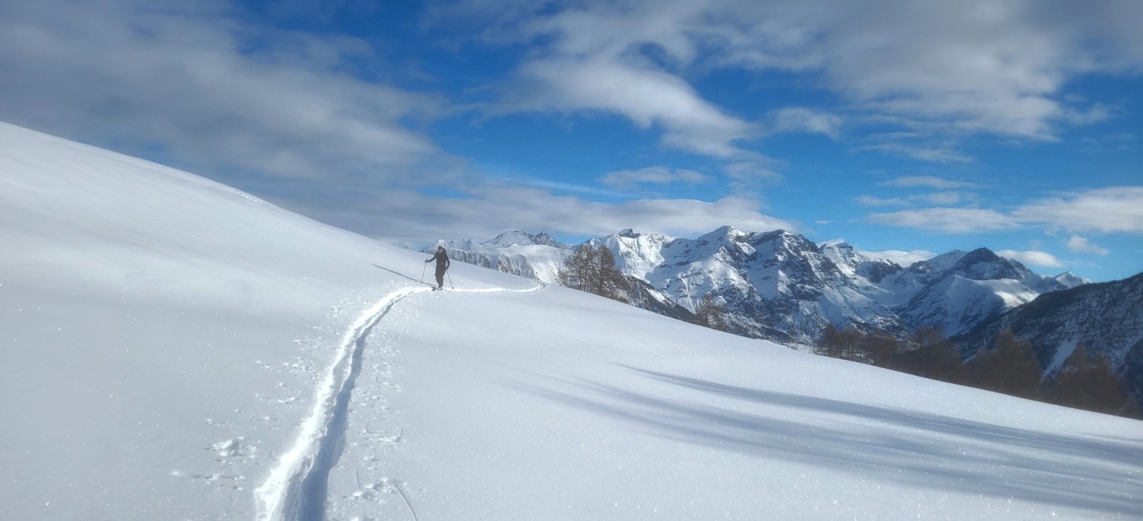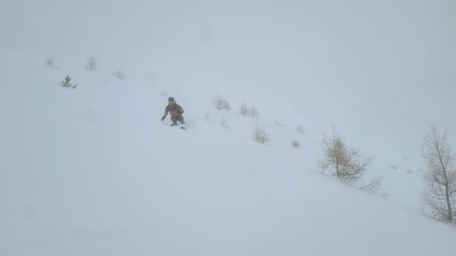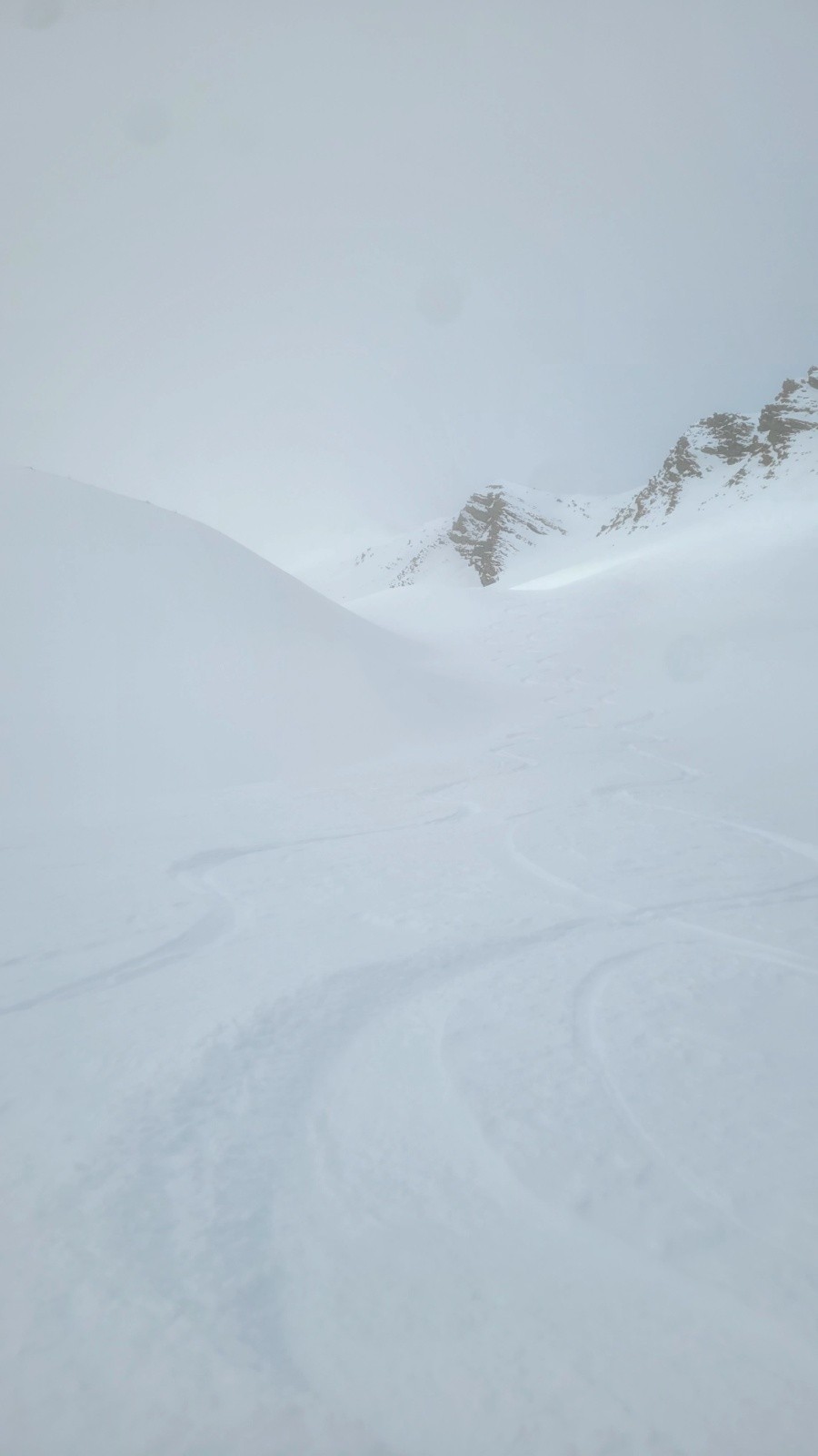 Itinéraire suivi : montée à une bosse à 2500, sur l'itinéraire de la tête de Crouès. On stoppe à cause de la mauvaise visibilité au dessus. Descente poudreuse jusqu'à 2280 environ. Repeautage direction le Brec Aneline. Stop 80m en dessous, à la limite des quelques mélèzes, après un wouf devant nous, et la visi qui se dégrade.