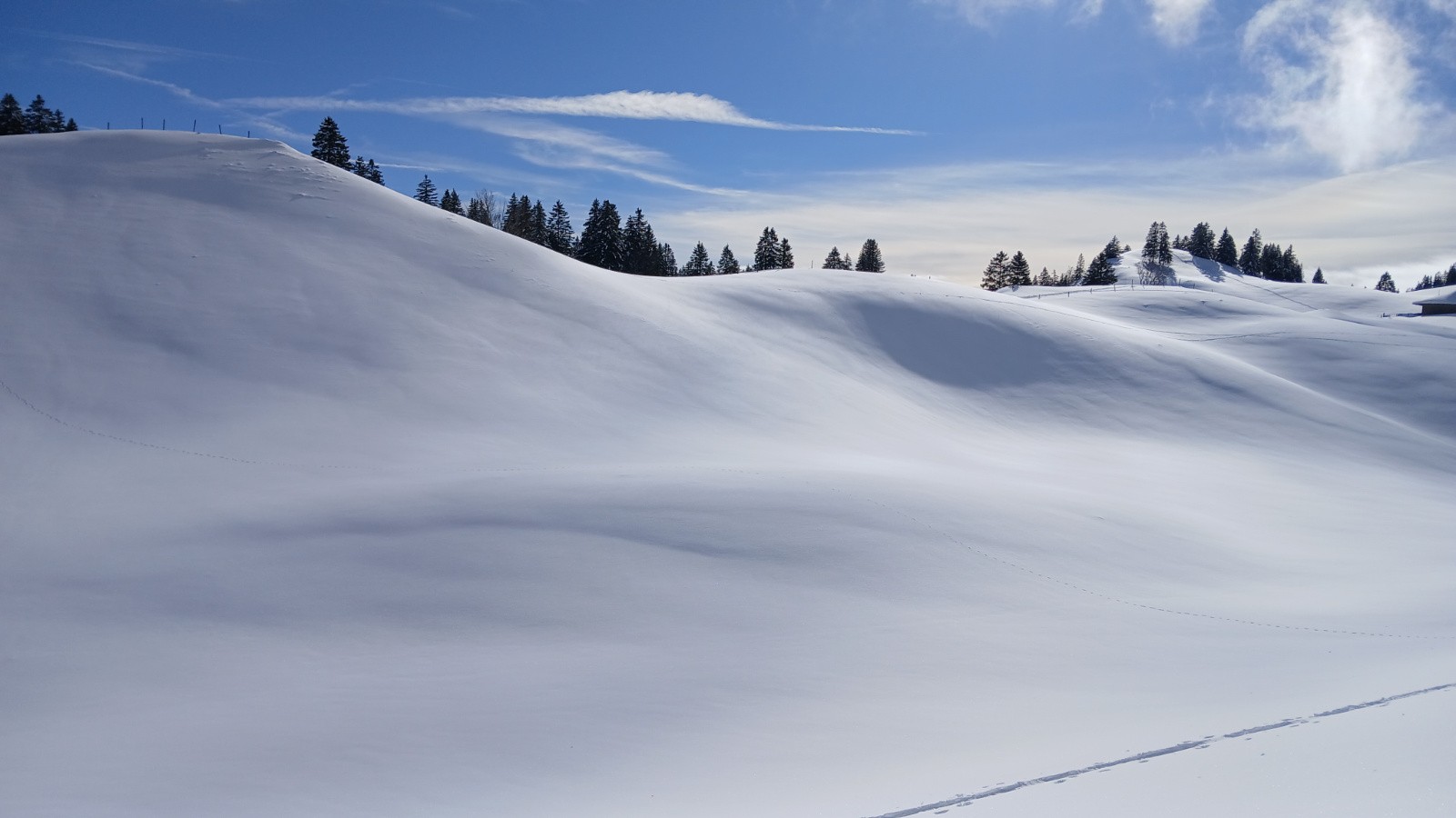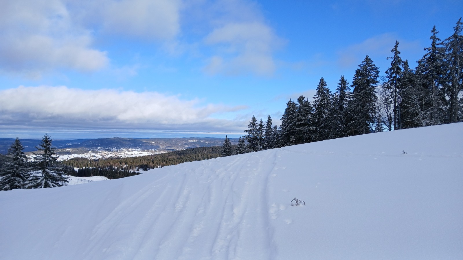 Descente sur l'envers de la Dole très agréable. Curieusement peu pratiquée: la plupart des randonneurs en raquettes ou à ski restent sur le versant des remontées mécaniques. Pas du grand ski mais j'ai personne vu (comme on dit dans le Jura !), peu de traces, bonne neige et pas de vent. Superbe vue sur le Léman et l’envers de la Dole.
