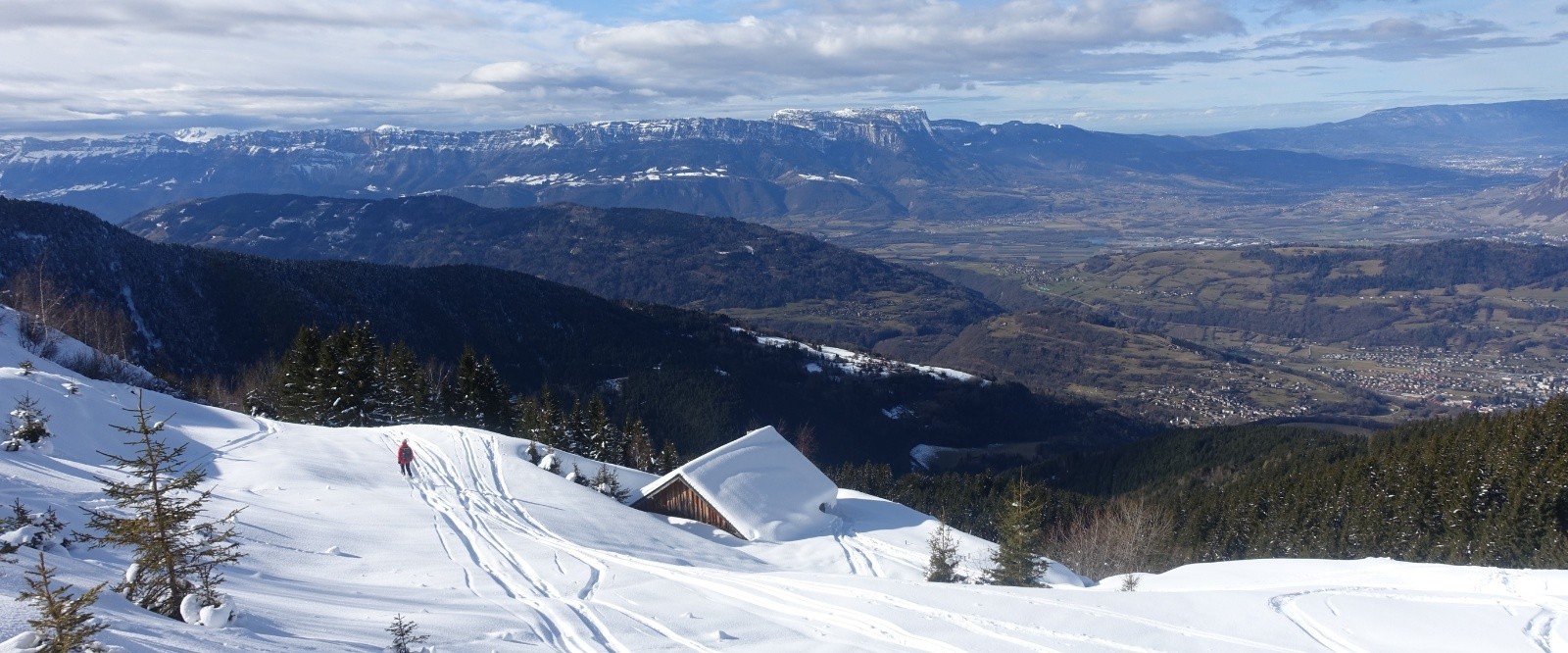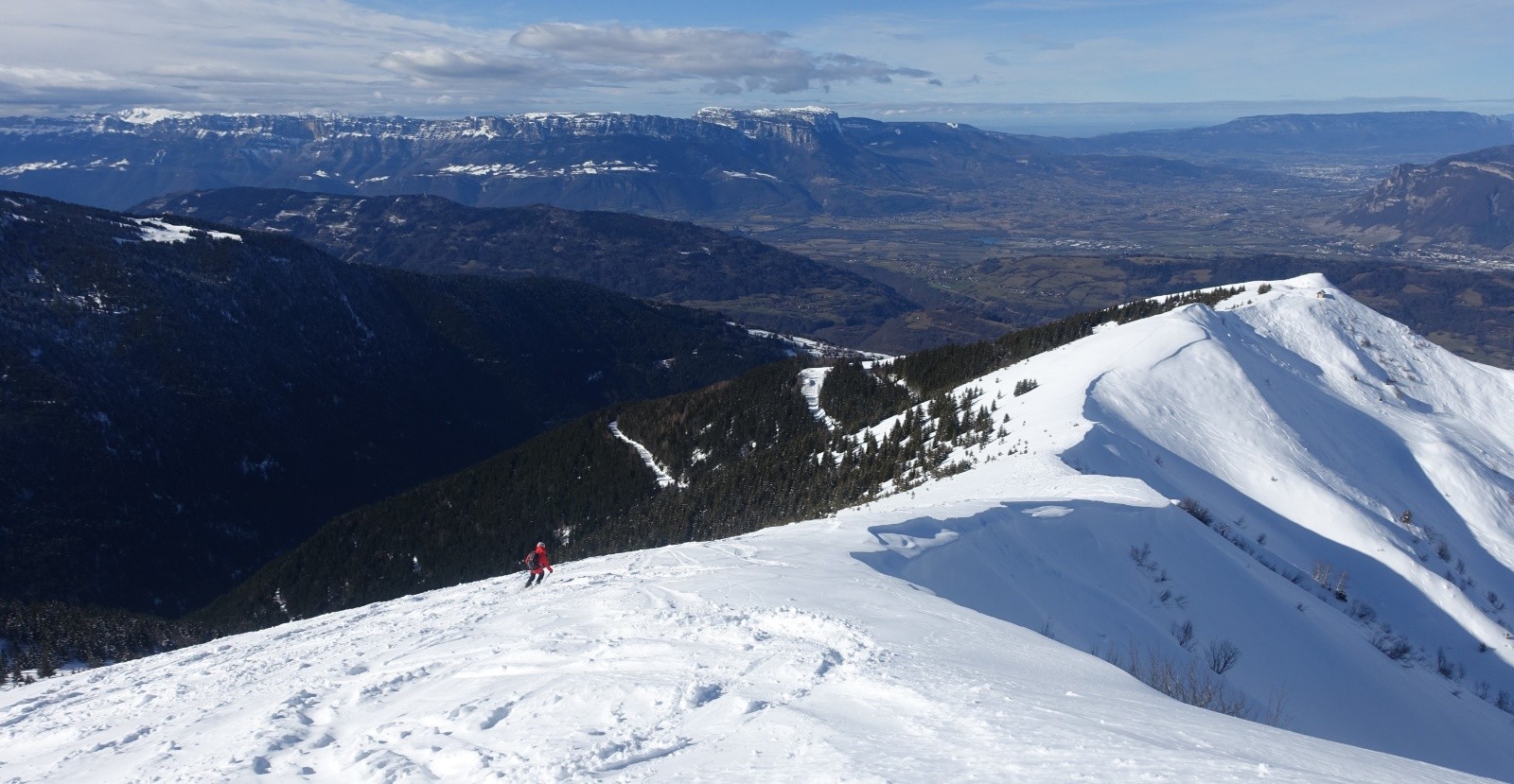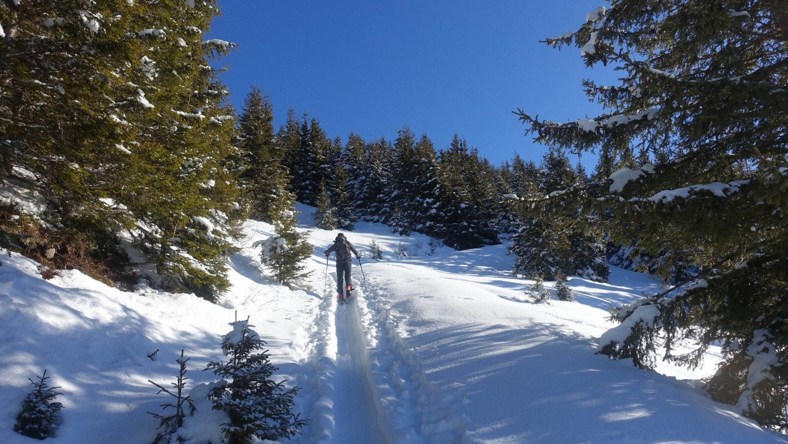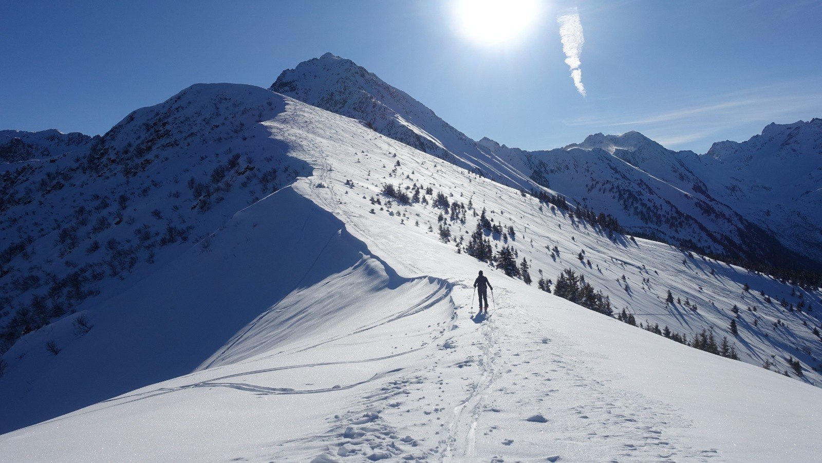 Partis par le chemin bien enneigé qui coupe les lacets de la longue route, il est très agréable avec sa pente soutenue mais confortable; nous n'avons qu'a suivre la trace de montée qui nous mène gentiment aux chalets du milieu, puis nous passons par la piste NO qui est bien labourée mais avec encore de la place (mais il y a du y avoir pas mal de monde dans le secteur ce we). il n'y a pas foule dans le secteur aujourd’hui , vu seulement 4 personnes de toute la journée et encore deux d'entre elles en bas du vallon à plus de 500m et les deux autres à notre retour à la voiture; nous gagnons la crête où le soleil nous réchauffe agréablement, nous nous attendions à avoir plus de vent, juste un léger sur la longue crête.