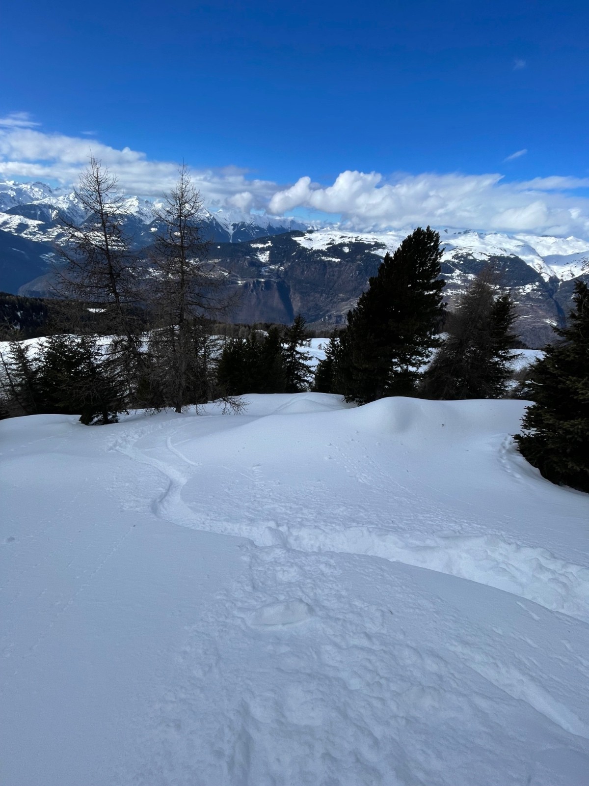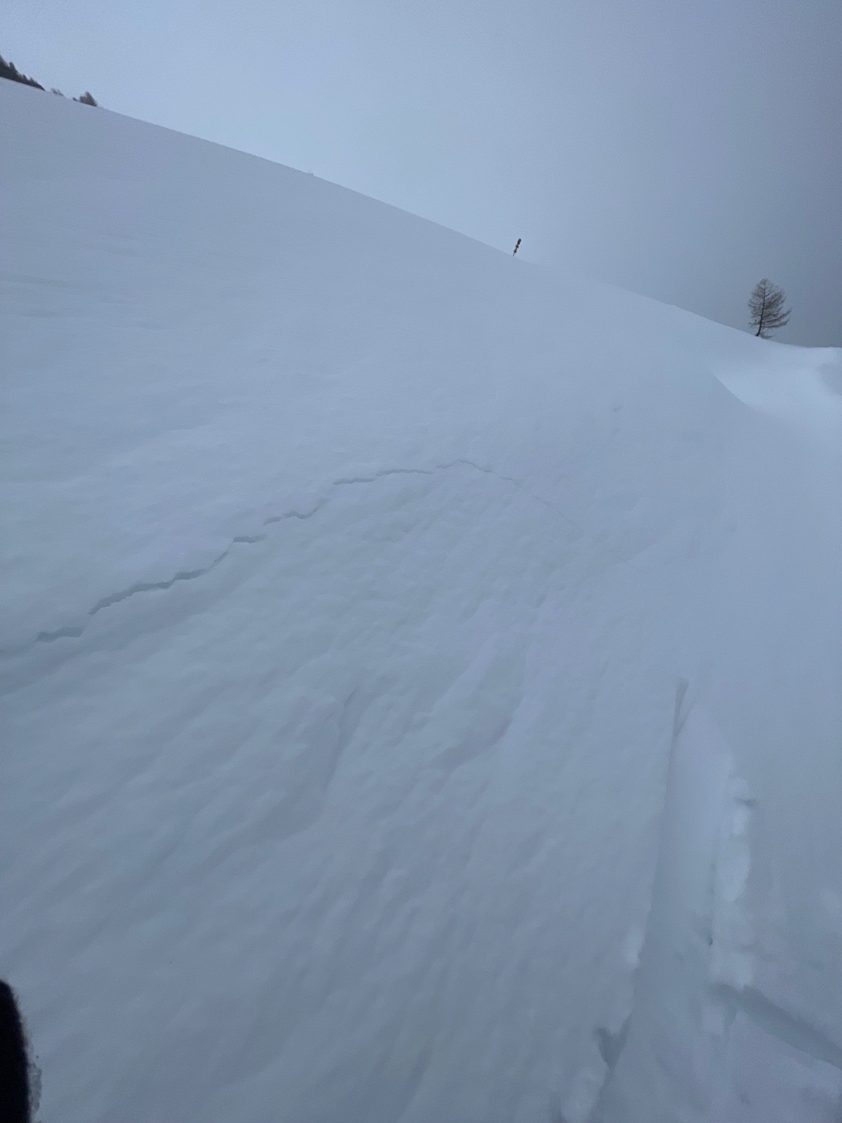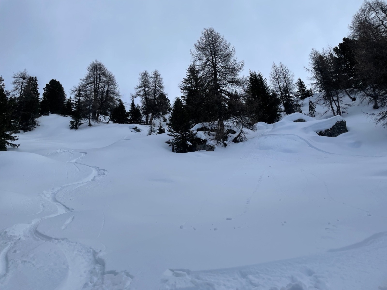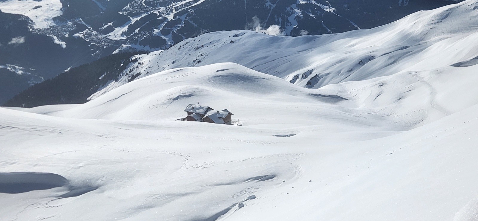Conditions pour le ski : Dans les prairies du bas petite couche de poudre sur fond dur. Elle sera humide à notre retour mais encore bien skiable. La forêt est maintenant assez enneigée pour ne pas prendre les sentiers trafolées à la descente. 10/15 cm de neige récente sur fond dur rendent les sous bois agréable. Dès la sortie du bois vers 1800m le travail du vent se fait sentir avec une neige plus irrégulière et bien cartonnée par endroit. En visant bien il y avait encore moyen de trouver de la poudre dense pour se faufiler à la descente. La combe sous le col Jovet est ravagée par le vent avec croupes pelées, combe remplies, et quelques plaques mi dures derrières chaque rupture de pente. La face Nord Ouest du dou de Moutiers plus protégée est beaucoup plus tentante en poudre densifiée par le vent MAIS de rapides sondages confirment que les couches fragiles persistantes sont bien là enfouies à 50/70 cm sous la neige frittée par le vent. On l'a vu ces jours derniers, ces conditions entraînent des accidents quotidiennement. Nous on ne jouera évidemment pas à la roulette russe aujourd'hui . On traverse toute crête le sommet pour rejoindre la croupe moins expo qui nous ramène vers le chalet de la Côte.