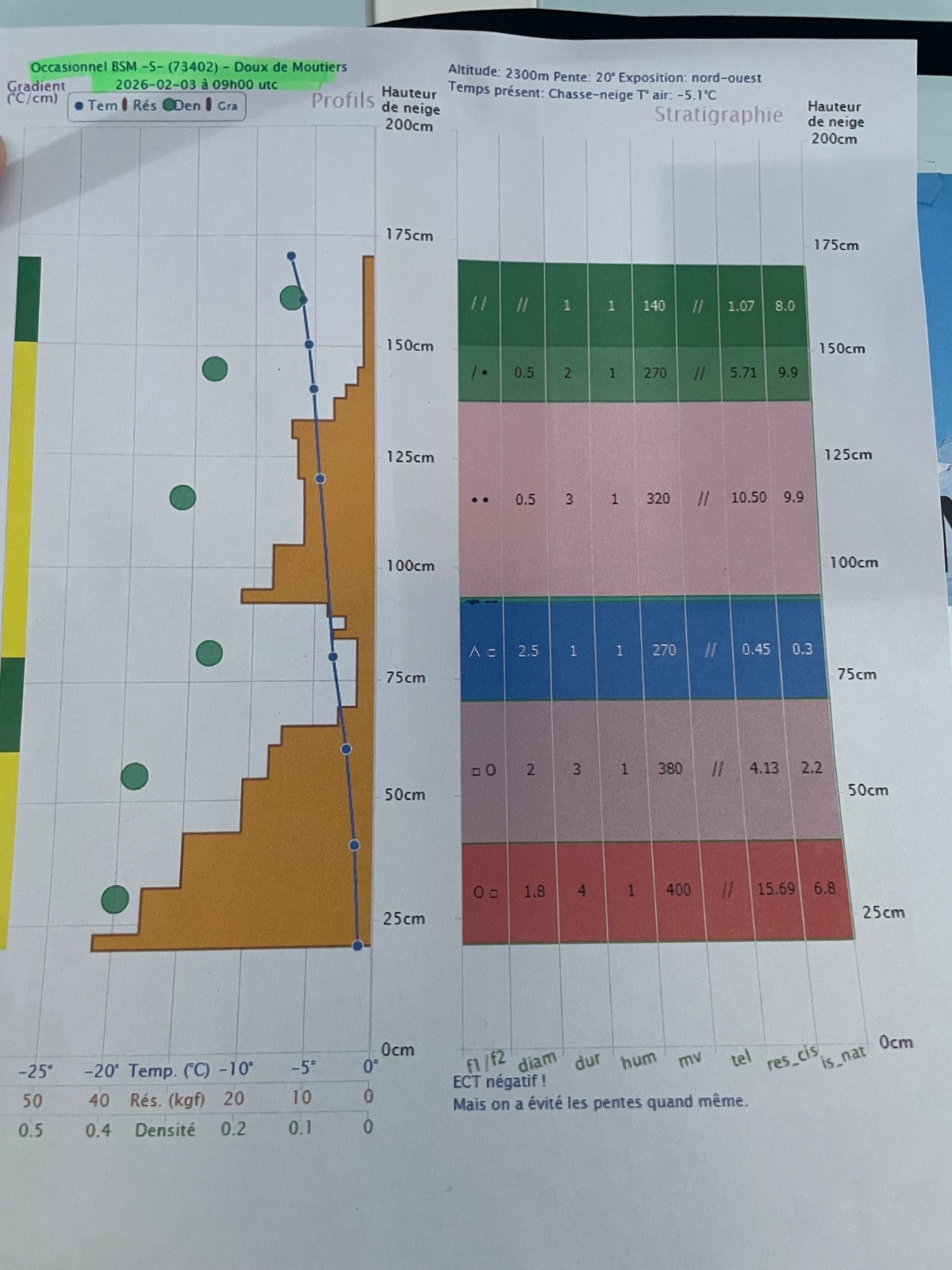 Conditions nivo et activité avalancheuse : comme nous le montre notre sondage fait vers 2300m dans la descente, le profil de plaque est sans surprise bien présent avec une petite couche de surface pour cacher le tout. Cependant notre test de propagation ECT est négatif à l'endroit du sondage mais on connaît les limites de ces tests. On sait qu'il aurait très bien pu, avec ce manteau, être positif quelques mètres plus loin. Surtout que, pas fou, on s'est mis à l'abri des grandes pentes pour nos 1h30 de mesure.