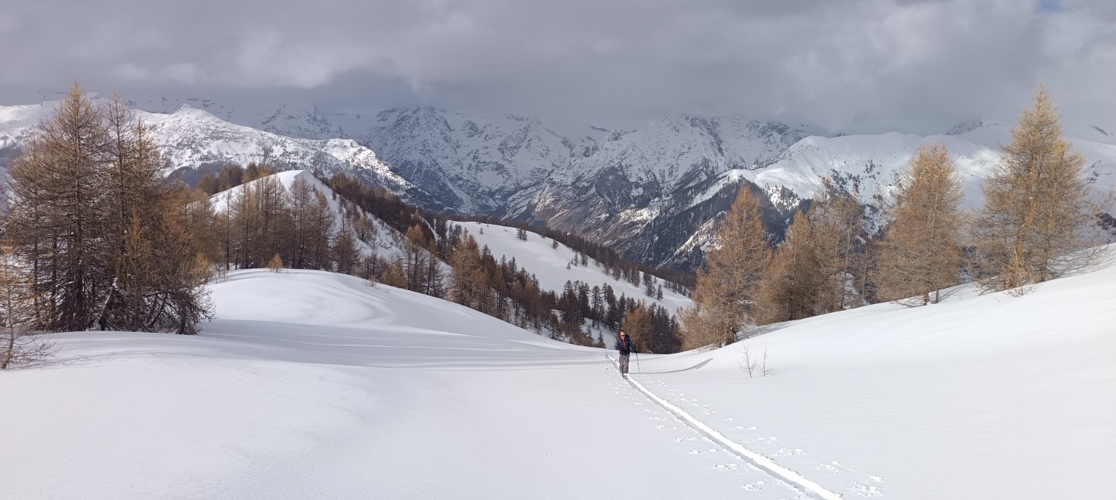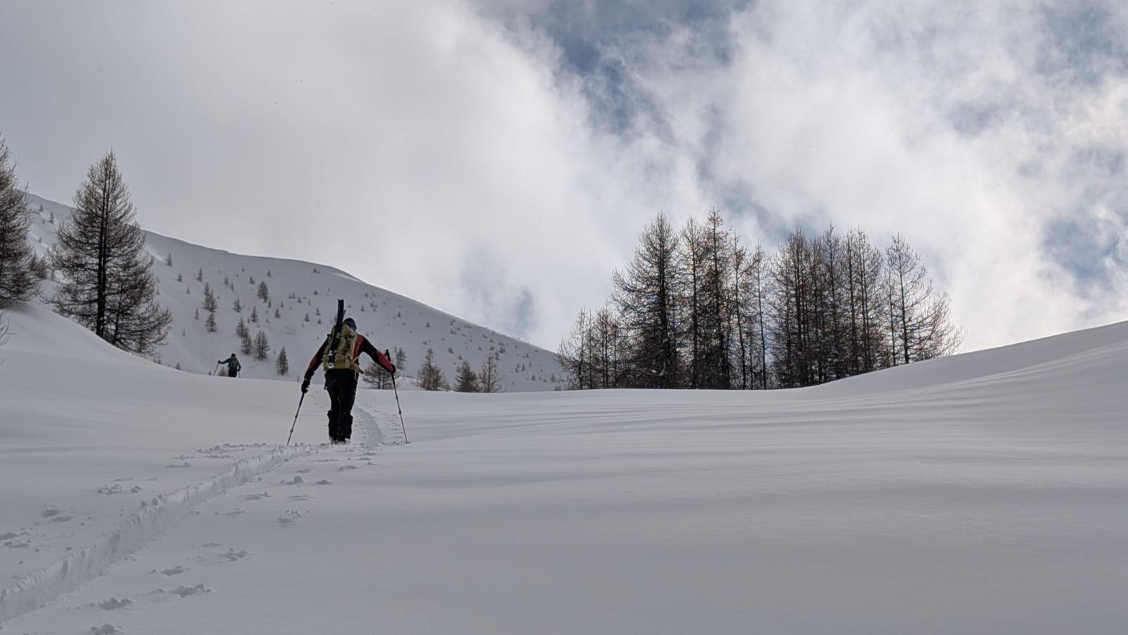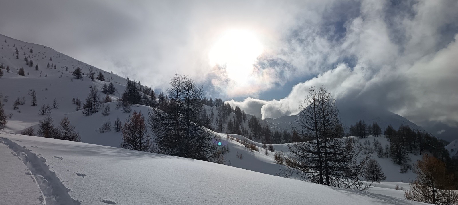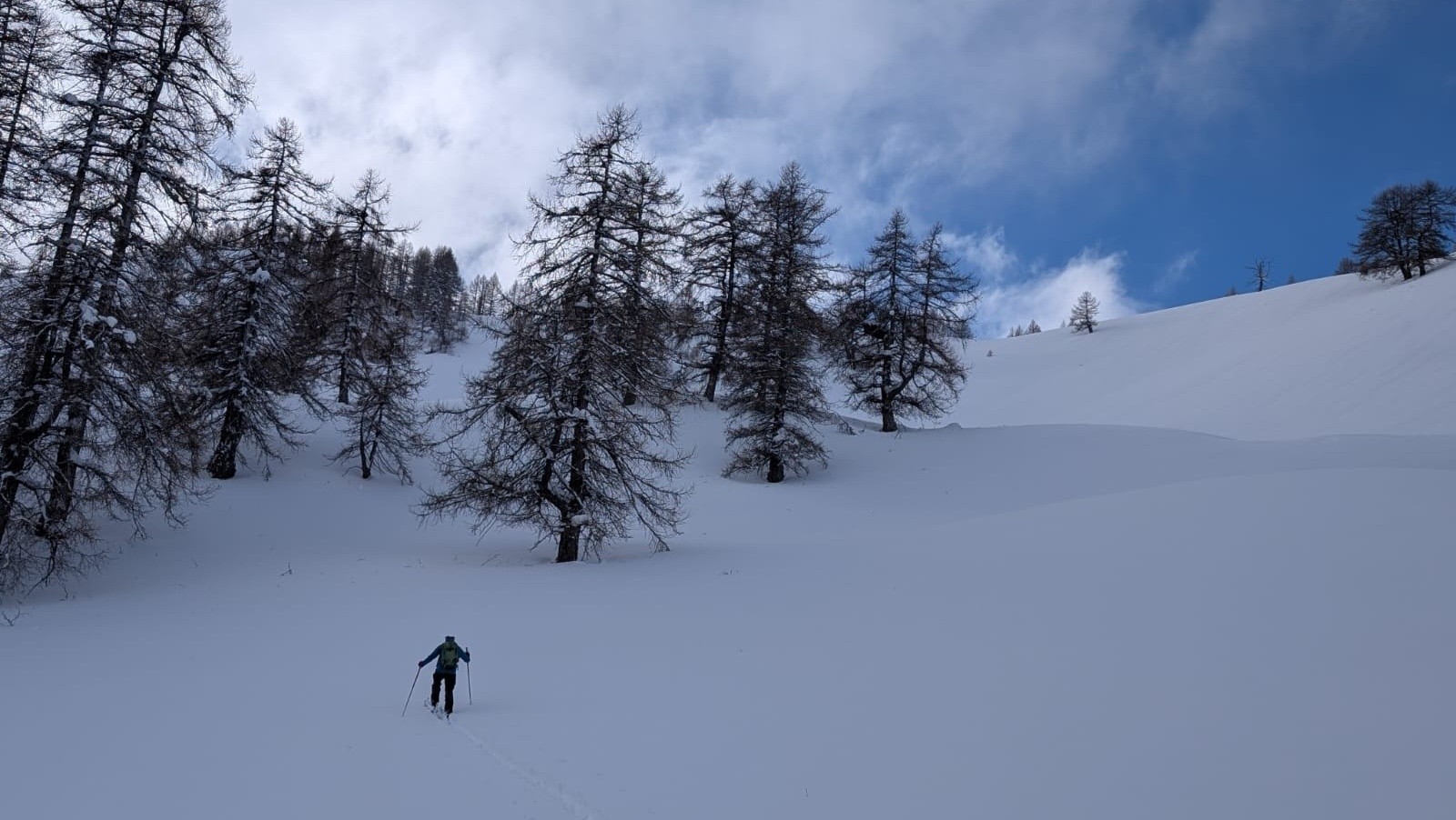 Premier soupoudrage vers 1600m, plus de 10 cms de fraîche vers 1800m et dès 1900m l'enneigement est conséquent et les anciennes traces totalement recouvertes, on commence à brasser mais c'est très beau et peu pentu après la forêt.