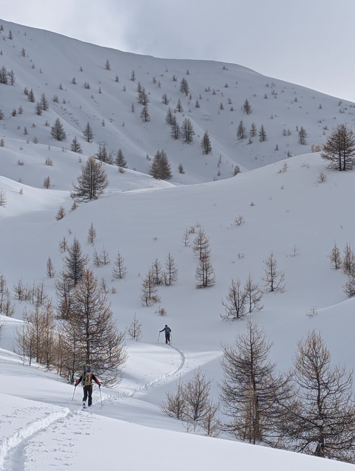 La descente est excellente sur le haut, ça manque un peu de pente mais on est là pour ça. Pas mal de traces en forêt mais ça ne dérange pas trop, elles sont partiellement recouvertes par la dernière chute et la neige est bien souple.