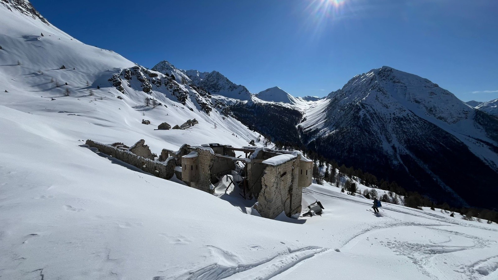 La balade dans la forêt est magique avec cette belle épaisseur de neige sur les arbres. Et puis le col des acles mérite vraiment une visite car c’est très jolie. Après une pause sur les ruines du fort, nous attaquons la descente sur les chalets qui nous aura permis de goûter à différentes neiges (voir conditions neiges) en nous rappelant que le ski toutes neiges est la base du ski de rando.