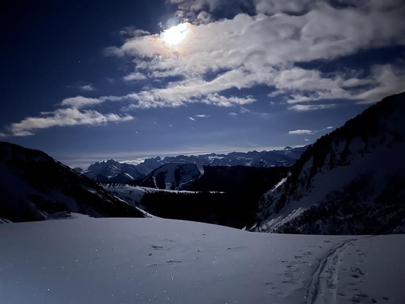 J'arrive à 8:45 au parking de Bonnavaz et y a personne! Bizarre! Ah bon, c'est 8:45 du soir :) Départ un peu tardif, le taf me retient jusqu'à 19:30 au leu de 18h :( J'essaie de profiter de la (presque) pleine lune et du créneau météo. Super bonne visibilité avec la lune. Bon enneigement sur la route et en général (que vers le sommet encore quelques cailloux). Super pano, tranquillité, quelques ratracks s'activent dans les stations de ski lointaines. Niveau neige un peu bof, heureusement que j'ai pris les gros skis de freeride, c'est lourd, mais ça skie bien. J'ai shunté les derniers 10-15m, la flemme de se concentrer (pas de couteaux et pas envie de taper des marches...). Bonne sortie pour prendre l'air après le taf.