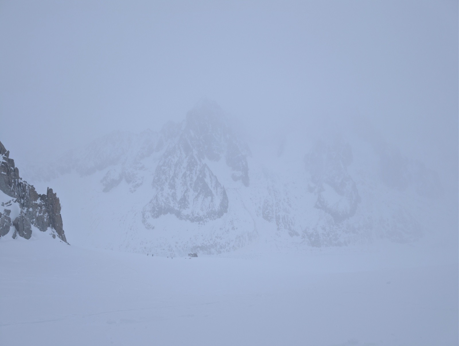 Au col, la visibilité est très mauvaise mais la neige plutôt bonne. Difficile de se situer niveau relief tant c'est jour blanc et cette poudre transportée par le vent.