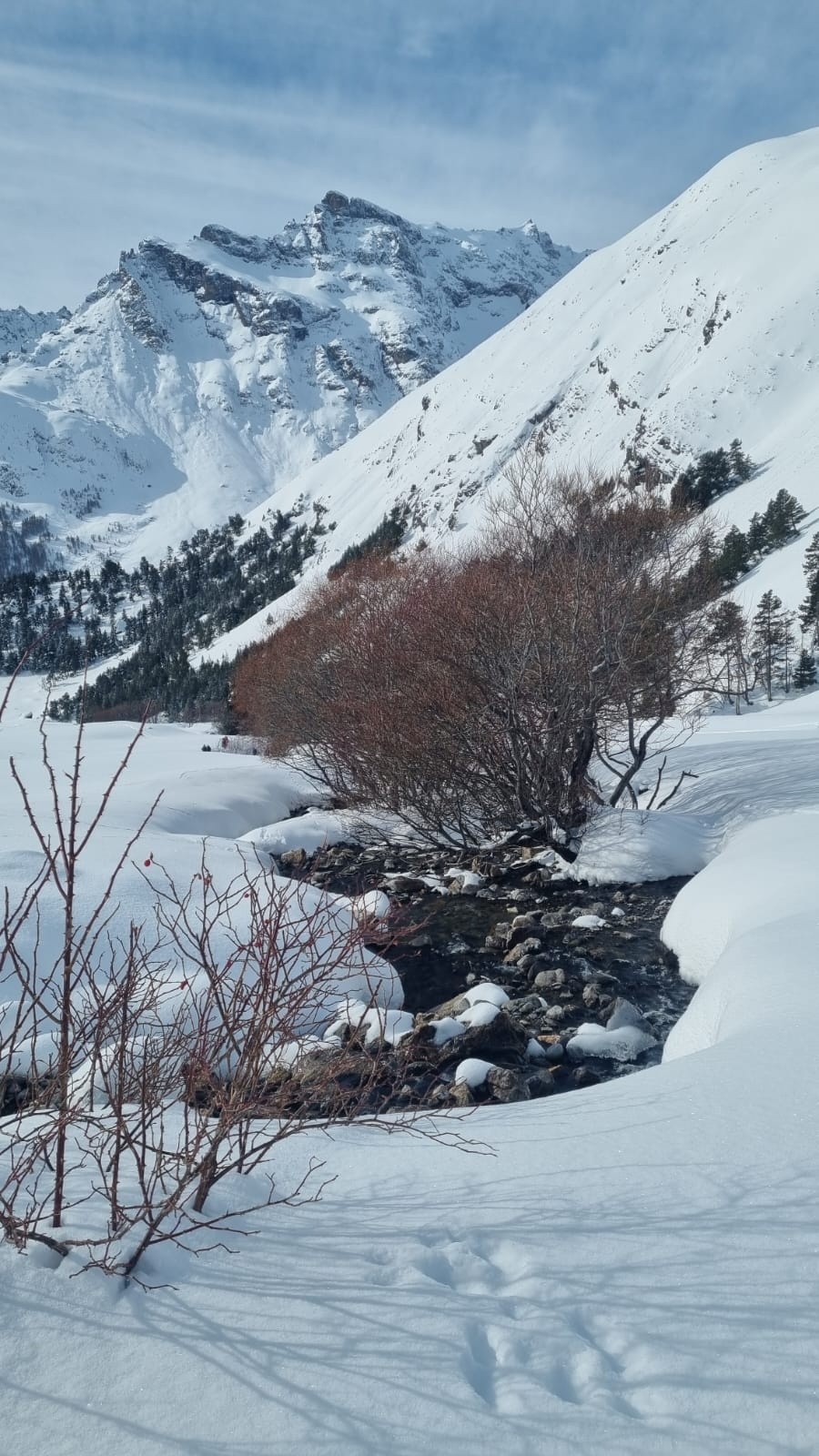 Pas de voiture aujourd’hui. On part avec Agnes du Lauzet skis aux pieds dans une belle ambiance avec un paquet de neige de partout (sur les toits des chalets, les bords des chemins, les ponts, le ruisseau…). Il fait frais mais les températures vont vite remontées.