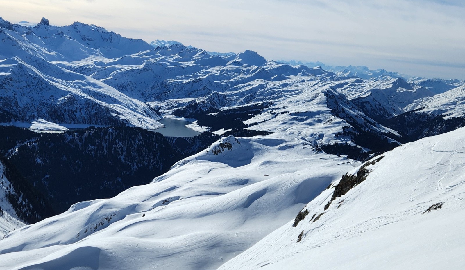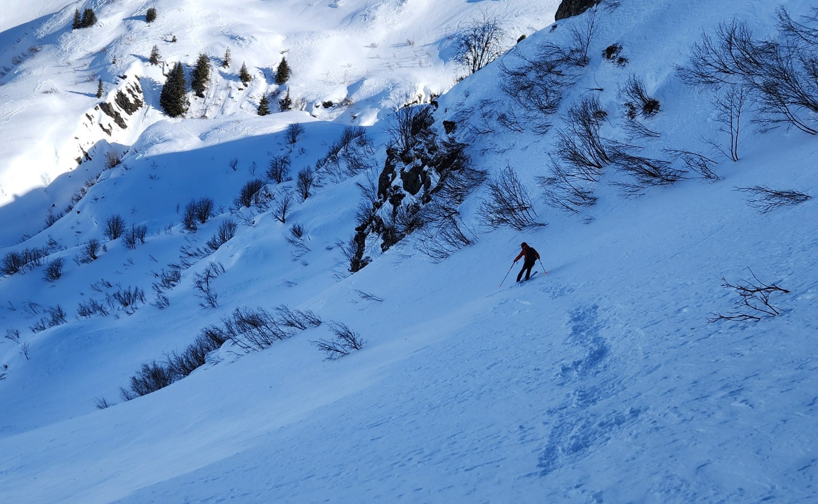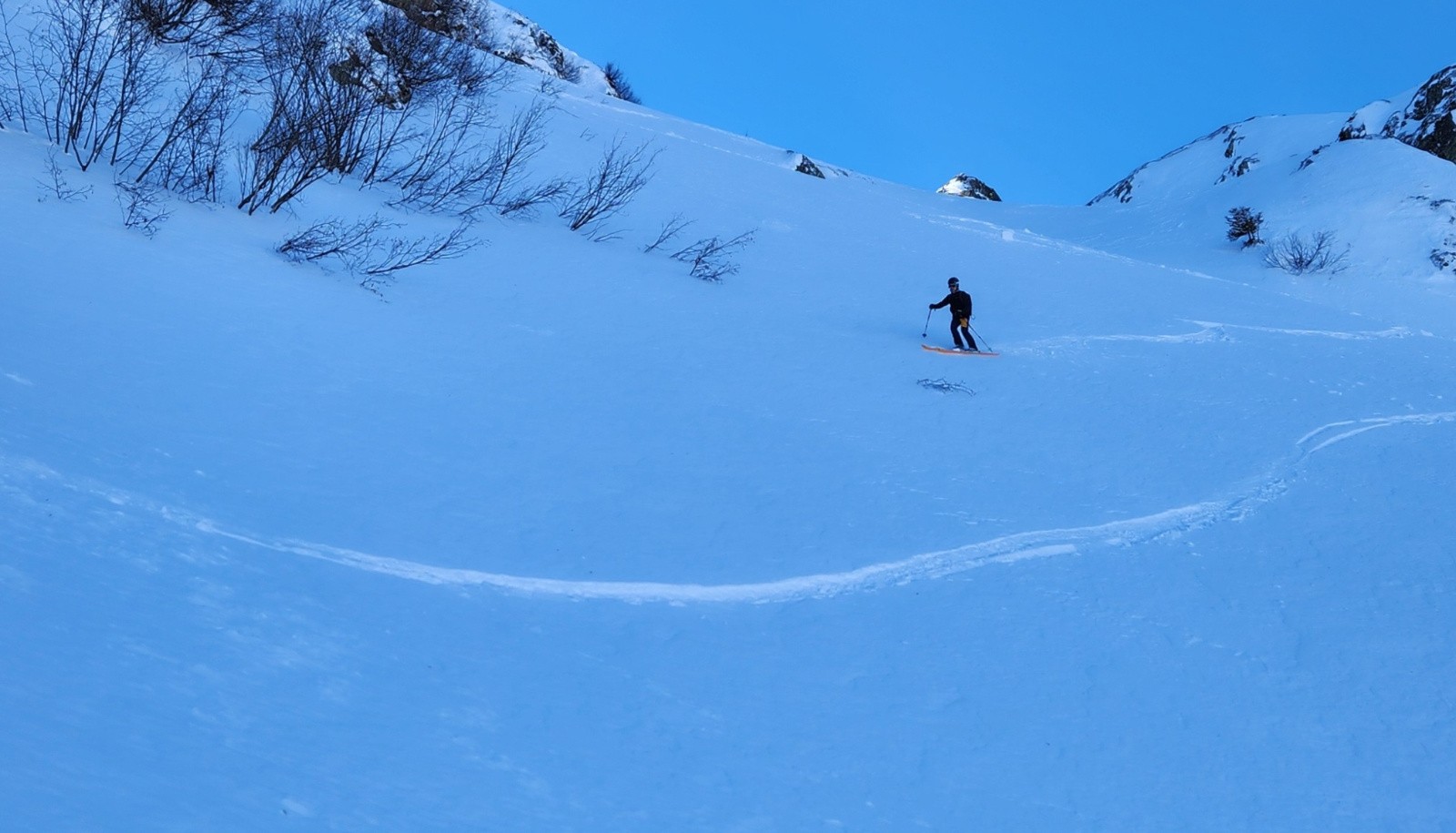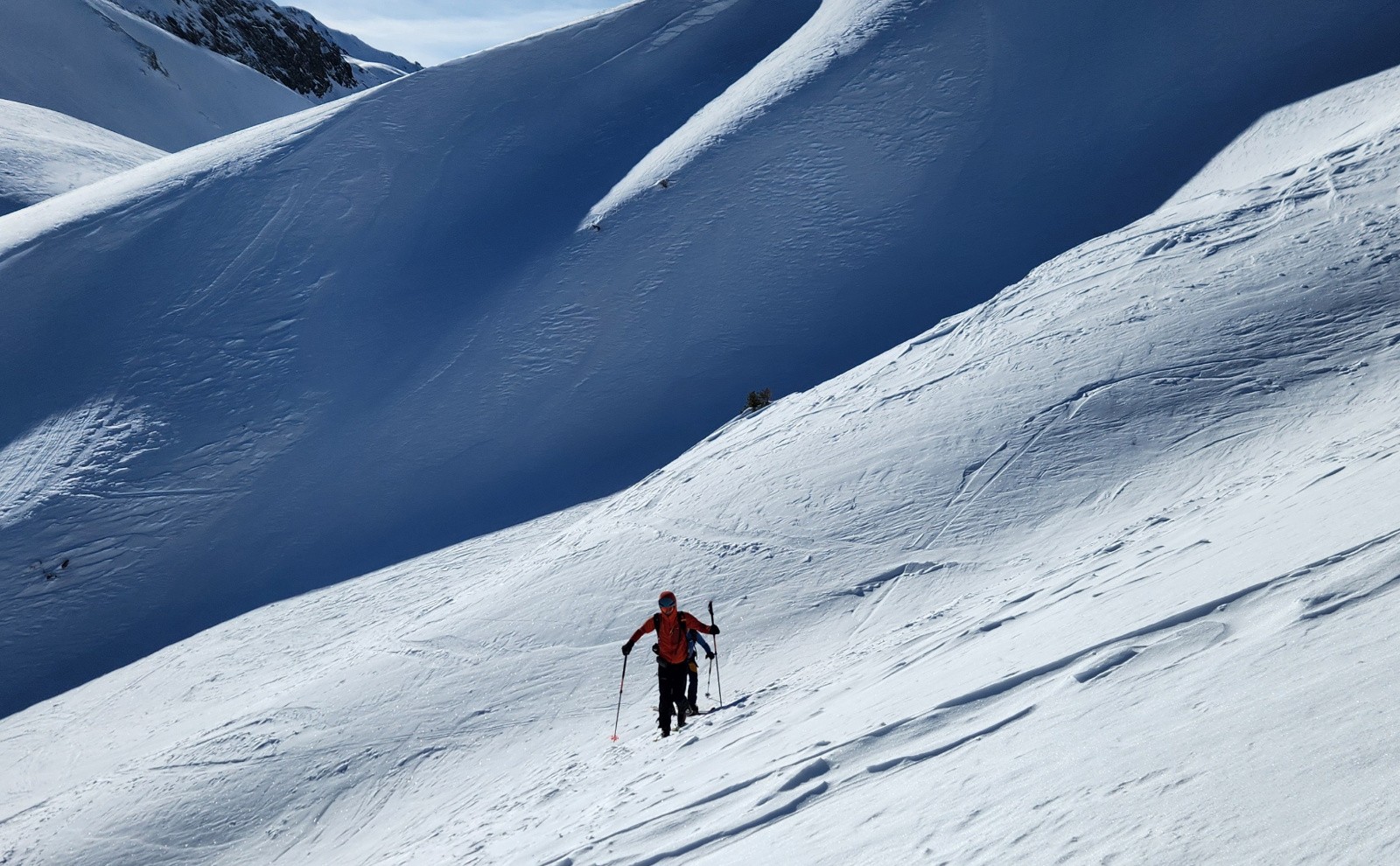 Conditions pour le ski : En haut, neige dure travaillée par le vent avec vaguelette mais finalement assez bien skiables, au milieu croute dure ou pas assez piégeuse, poudre dans les arcostes et neige légèrement croutée dans le dernier champs.