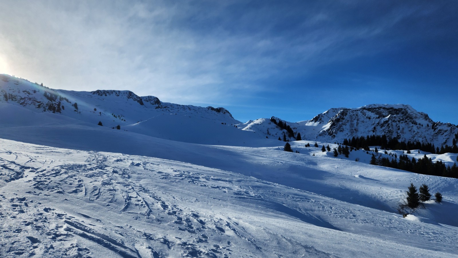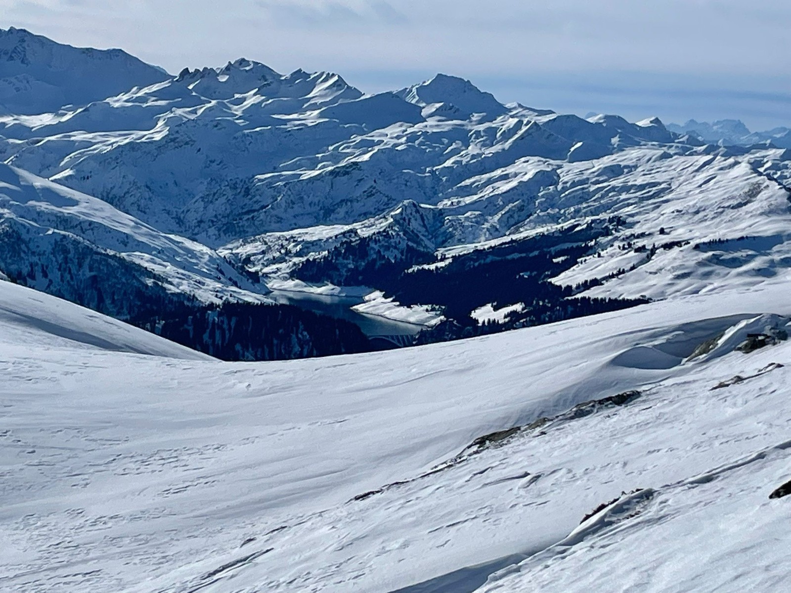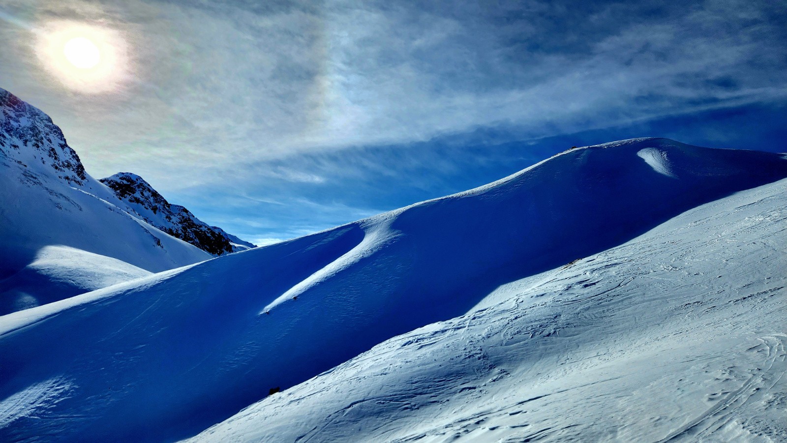 Conditions pour le ski : En haut, neige dure travaillée par le vent avec vaguelette mais finalement assez bien skiables, au milieu croute dure ou pas assez piégeuse, poudre dans les arcostes et neige légèrement croutée dans le dernier champs.