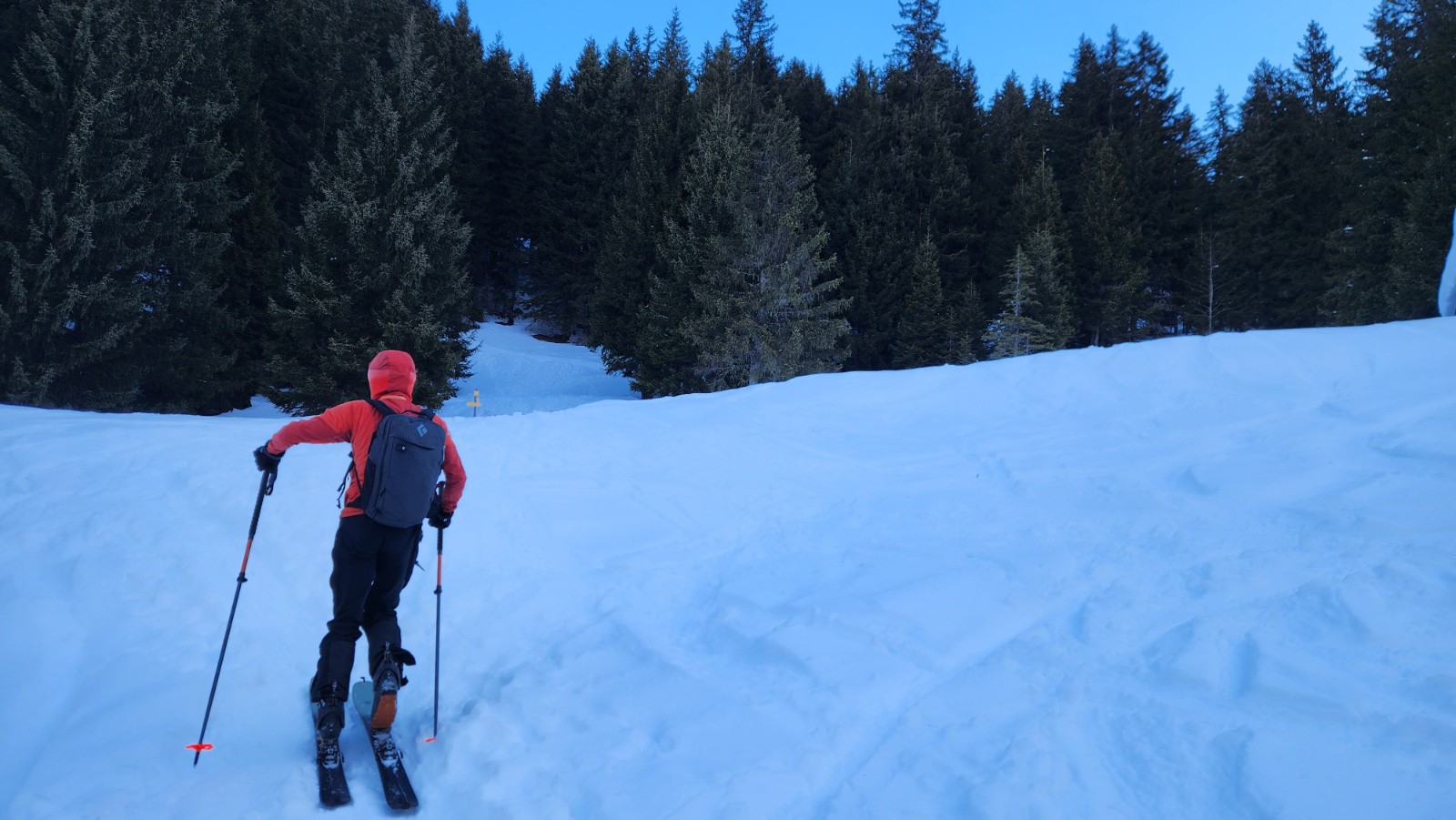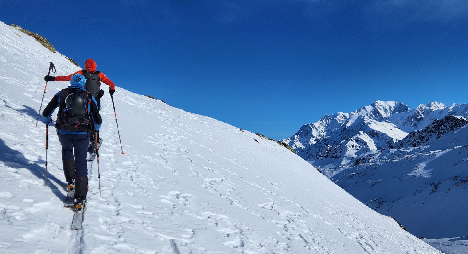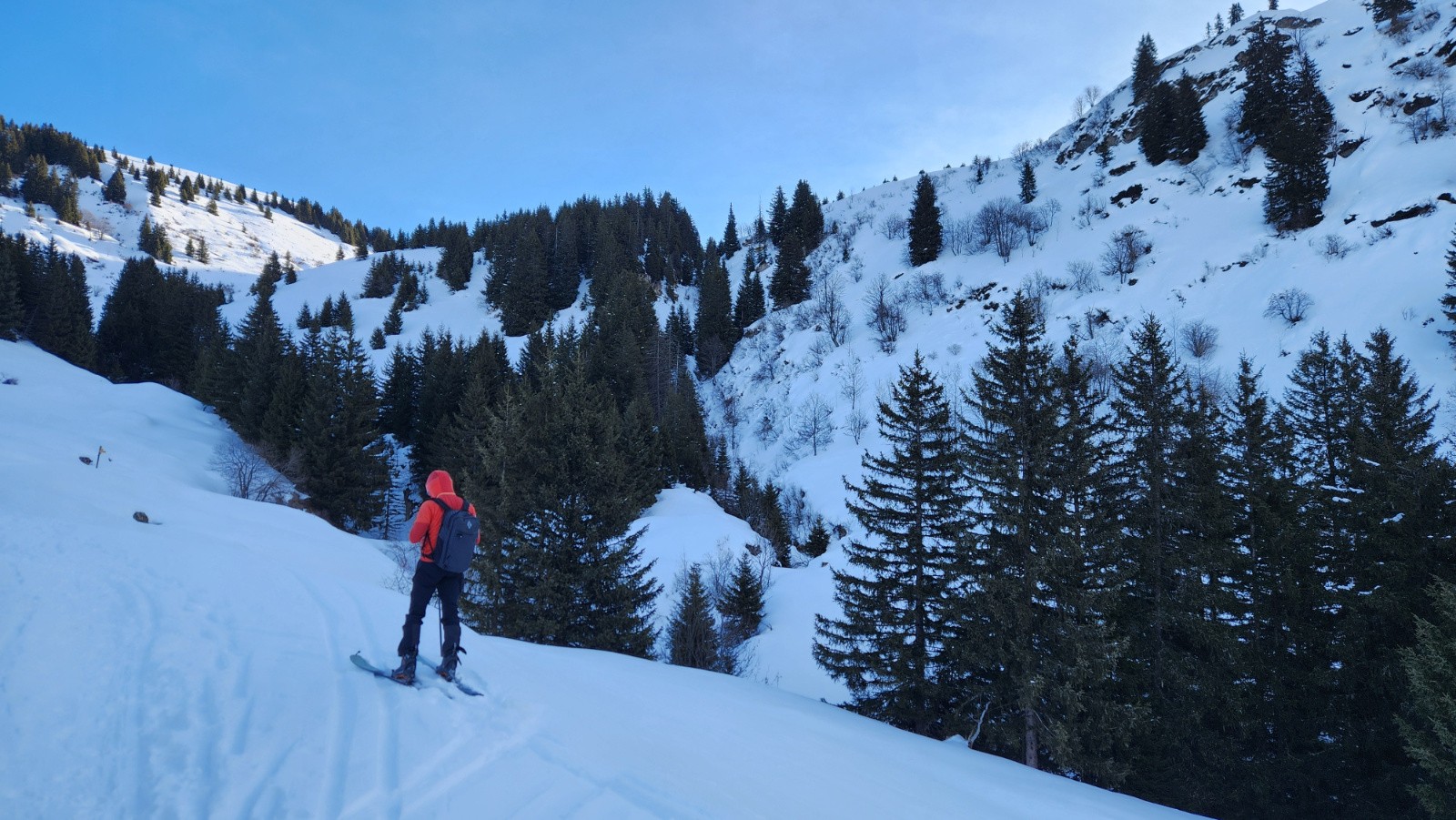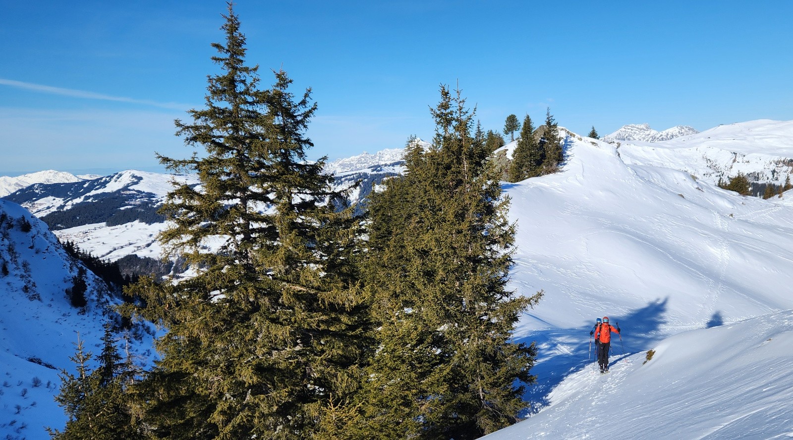 Conditions pour le ski : En haut, neige dure travaillée par le vent avec vaguelette mais finalement assez bien skiables, au milieu croute dure ou pas assez piégeuse, poudre dans les arcostes et neige légèrement croutée dans le dernier champs.