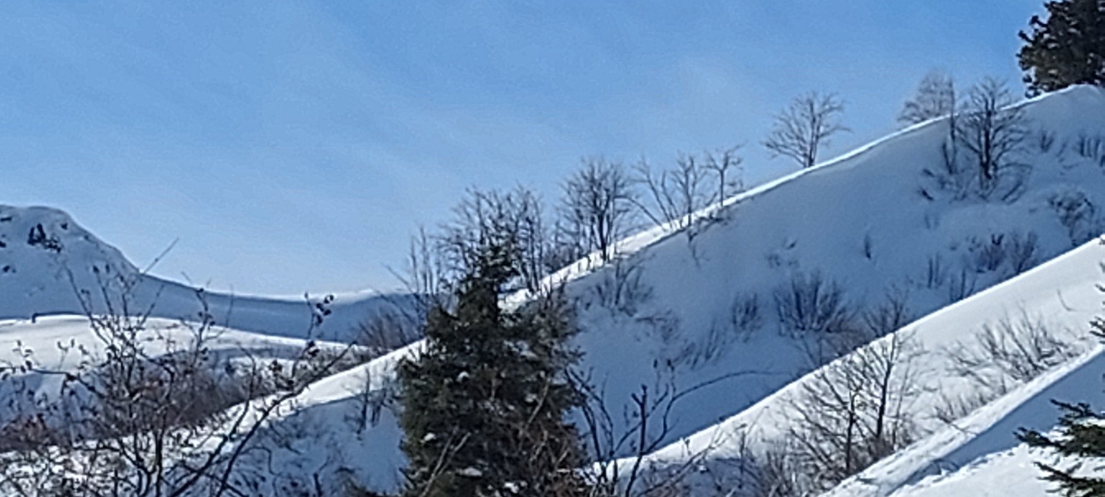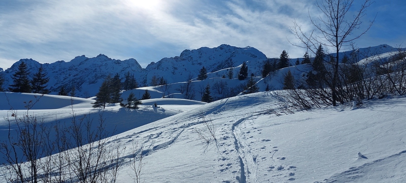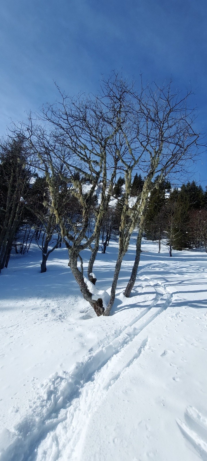 Météo/températures : grand beau se voilant tranquillement à partir de 13h environ, autour de 0°C au départ (7°C au retour), un filet de vent par moments vers les crêtes, doux dans les combes en remontant