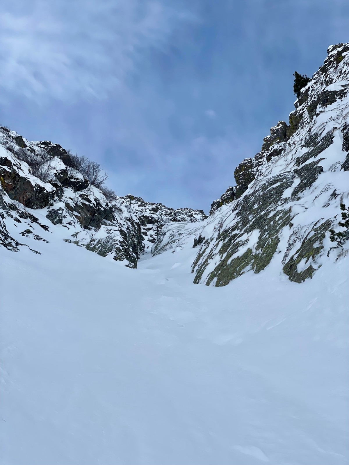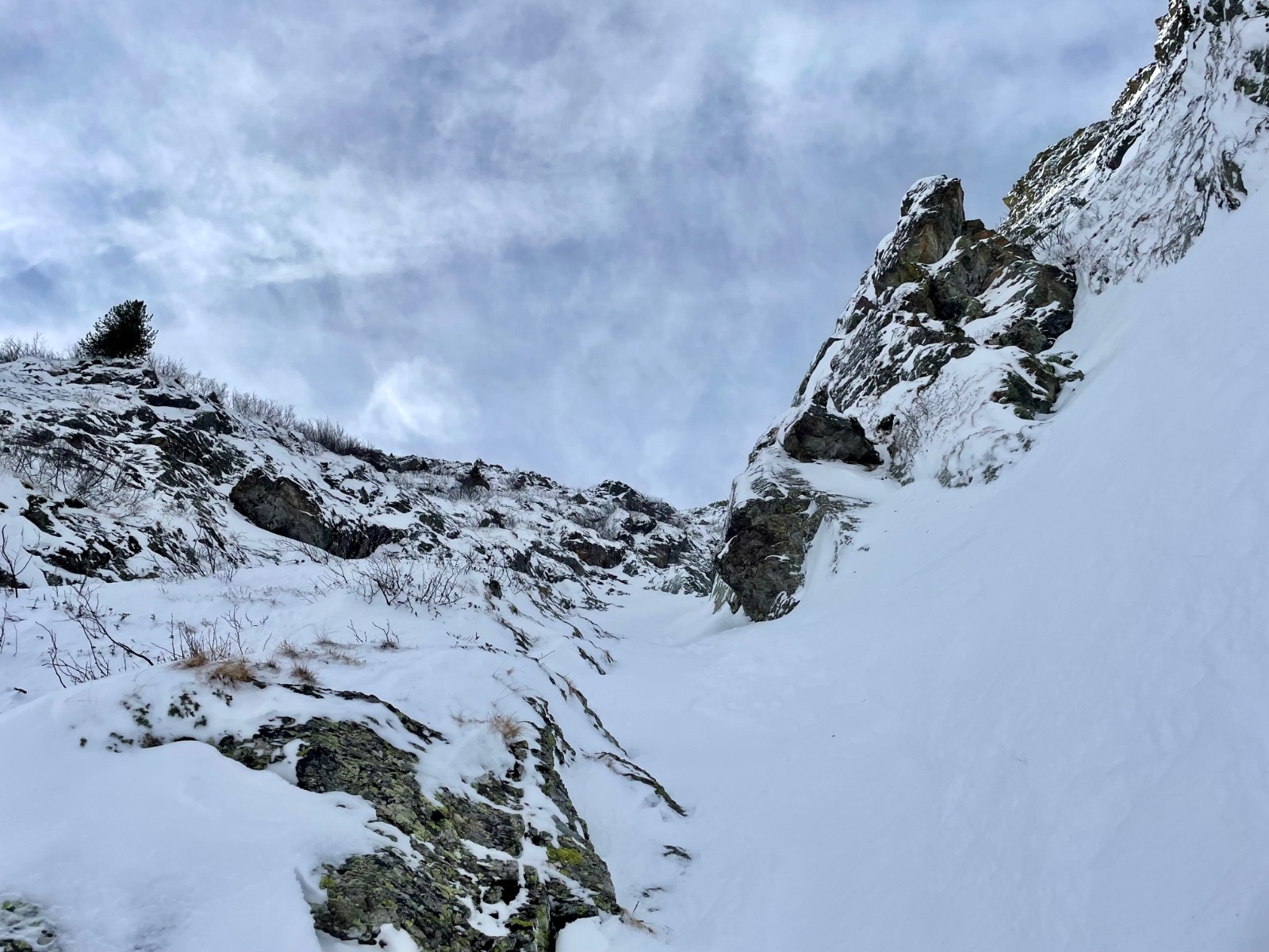 Couloir en neige variable mais à tendance froide, travaillée par le vent vers le haut (pas sorti au sommet pour le coup).