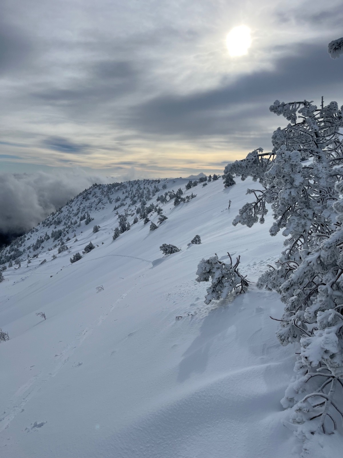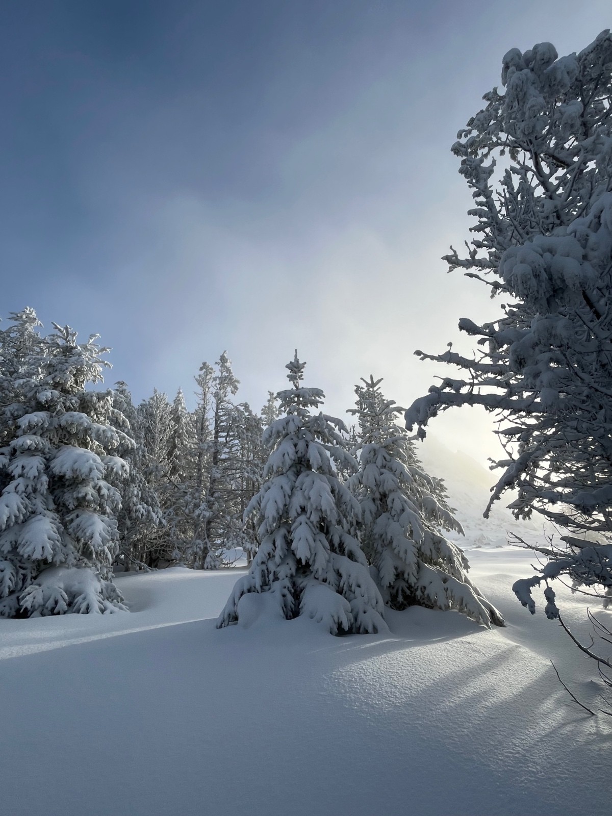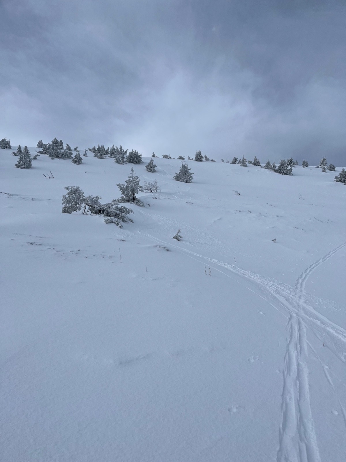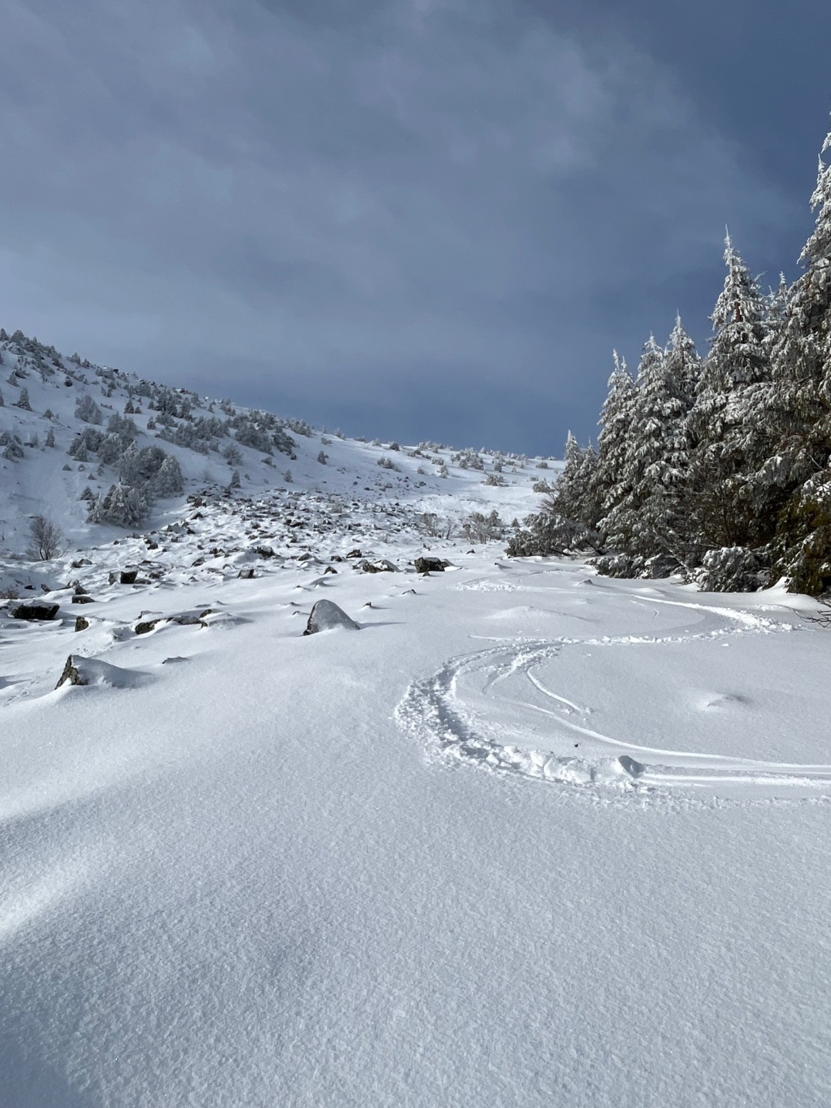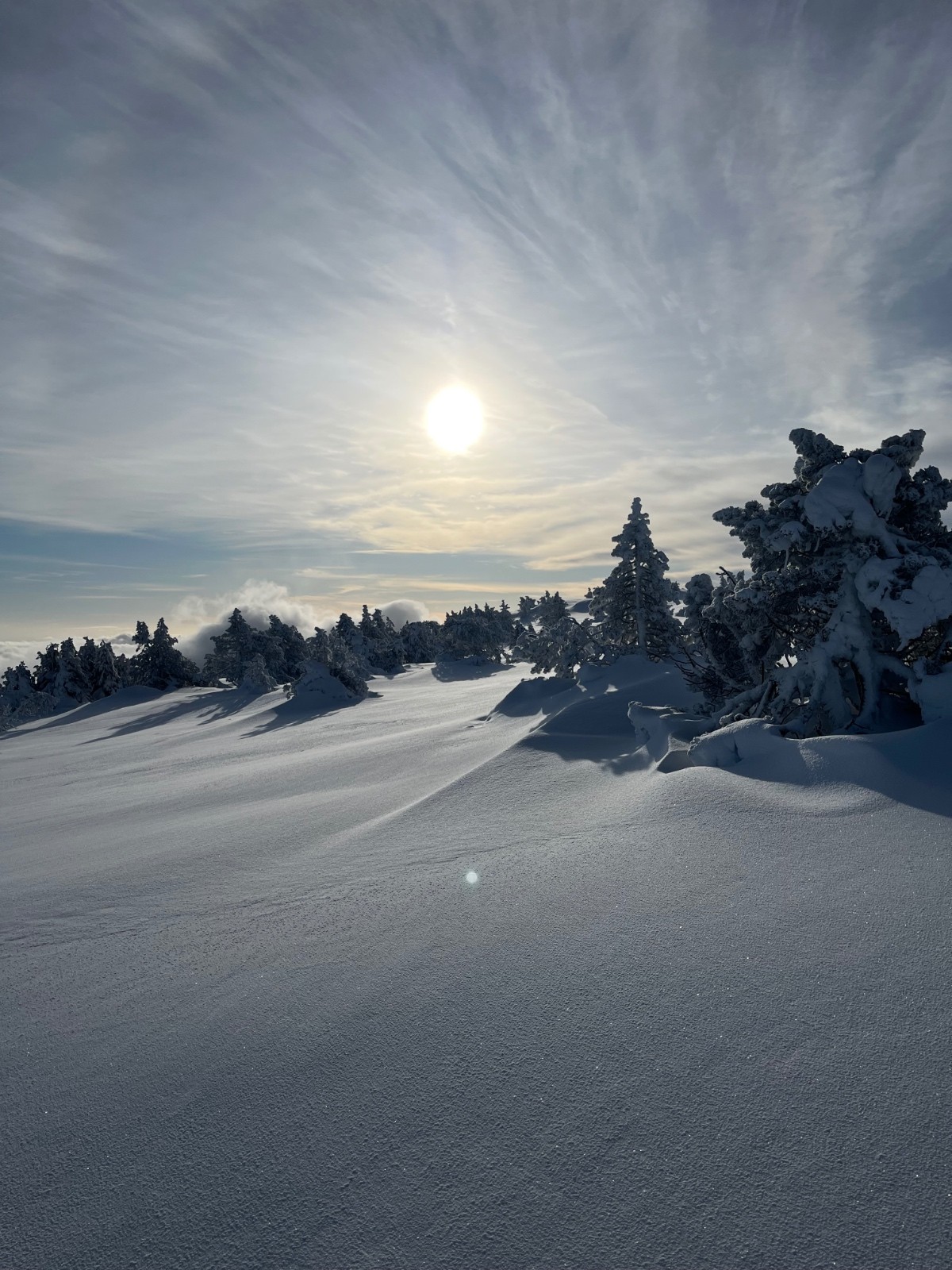 Conditions pour le ski : Le vent a bien travaillé la veille laissant une neige (nouvelle) tassée mais très skiable, malgré les températures très douces (on s’attendait à de le croute, mais que nenni 🙃)