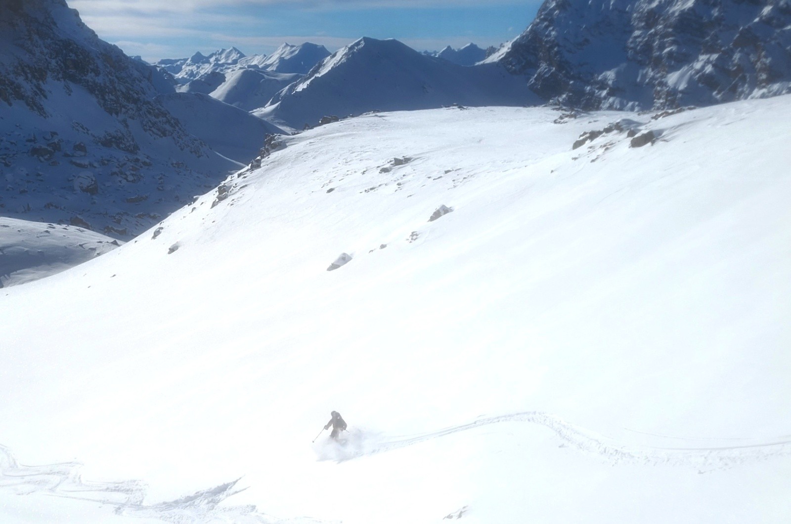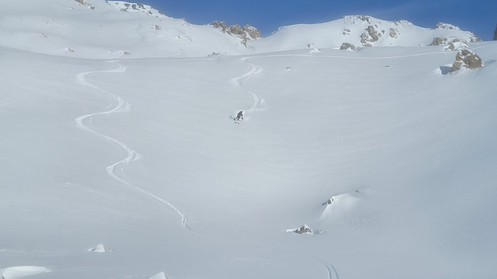 Descente superbe jusqu'au vallon de Plate Lombarde. On craignait des requins entre 2700 et 2500 car très rocheux... on est passé sans encombre, dans une neige toute douce.