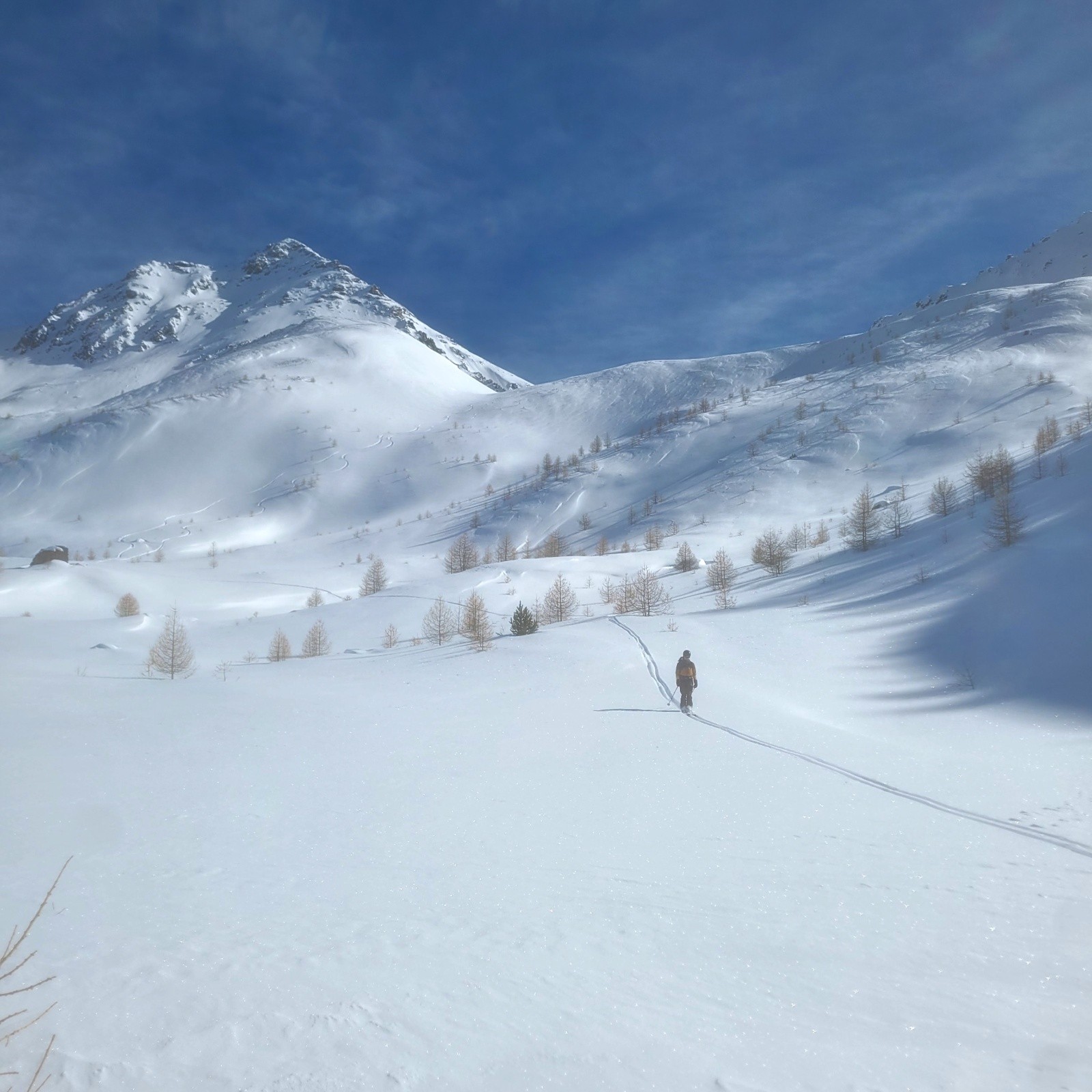 Montée au col de Plate lombarde (on trace). Clairement mieux à faire en montée qu'en descente vue la caillasse qui affleure. Sommet de Plate Lombarde par le NE. Couteaux mis car pas confort: neige en sucre semoule qui n'accrochait pas sur du dur.