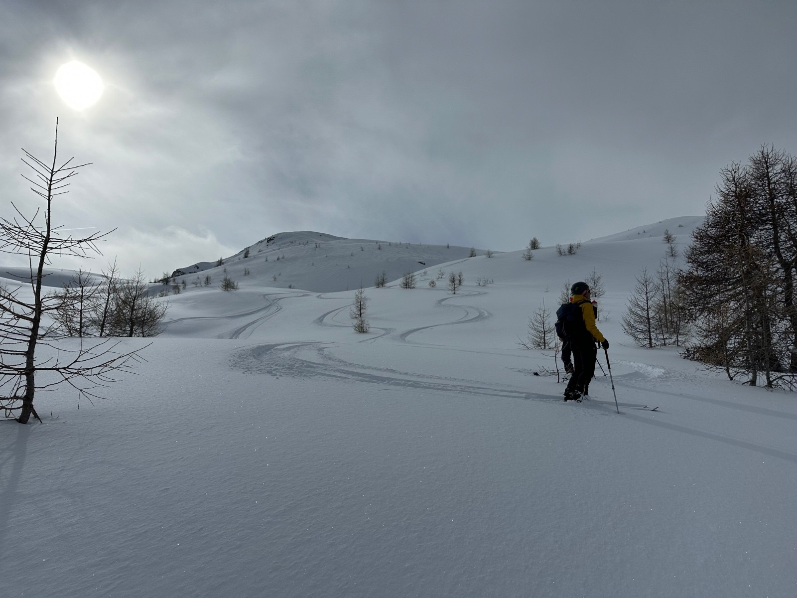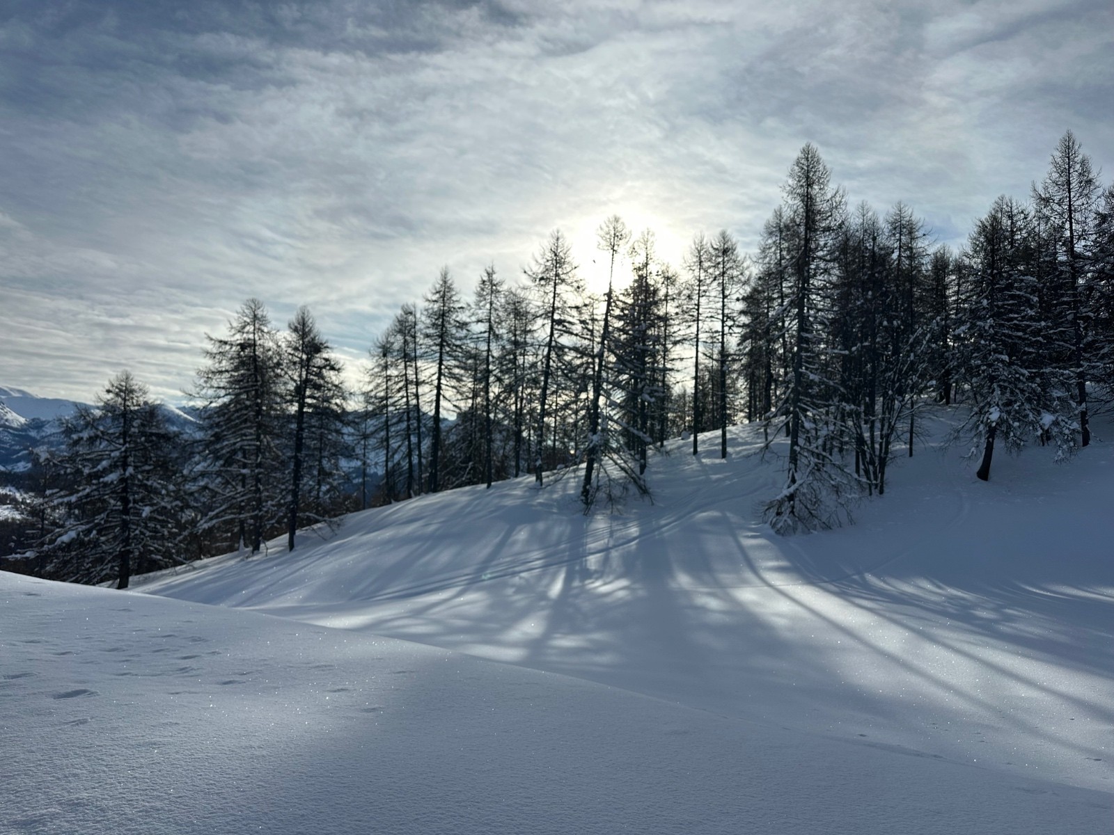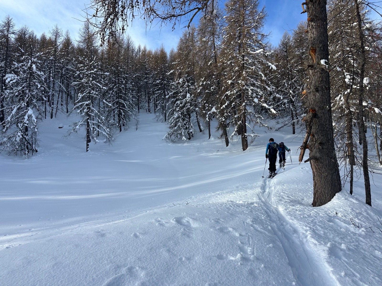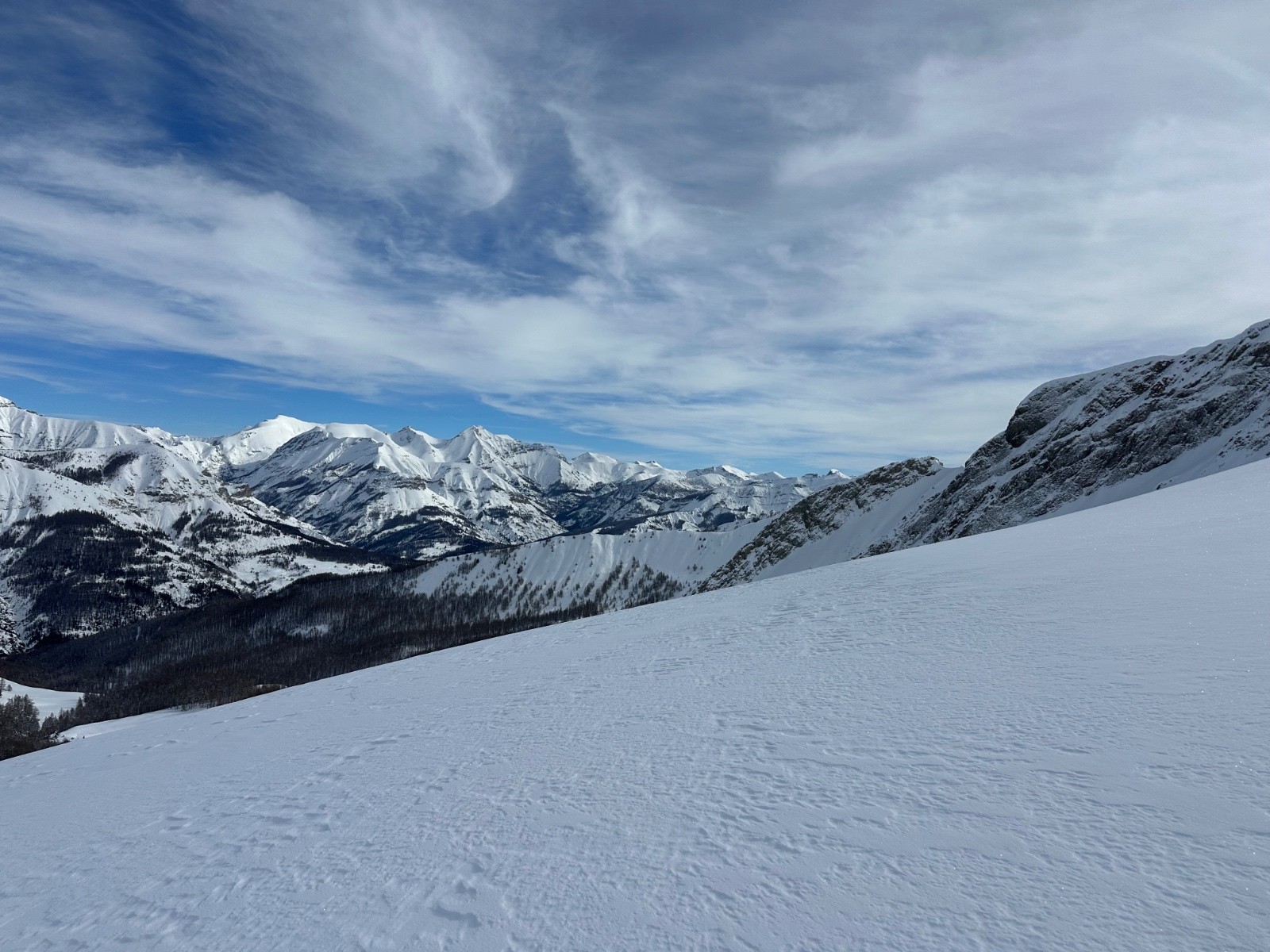 Conditions pour le ski : excellente. La neige est restée froide et poudreuse. À peine quelques crousties sous les arbres. Et un peu de croûte au plus bas.