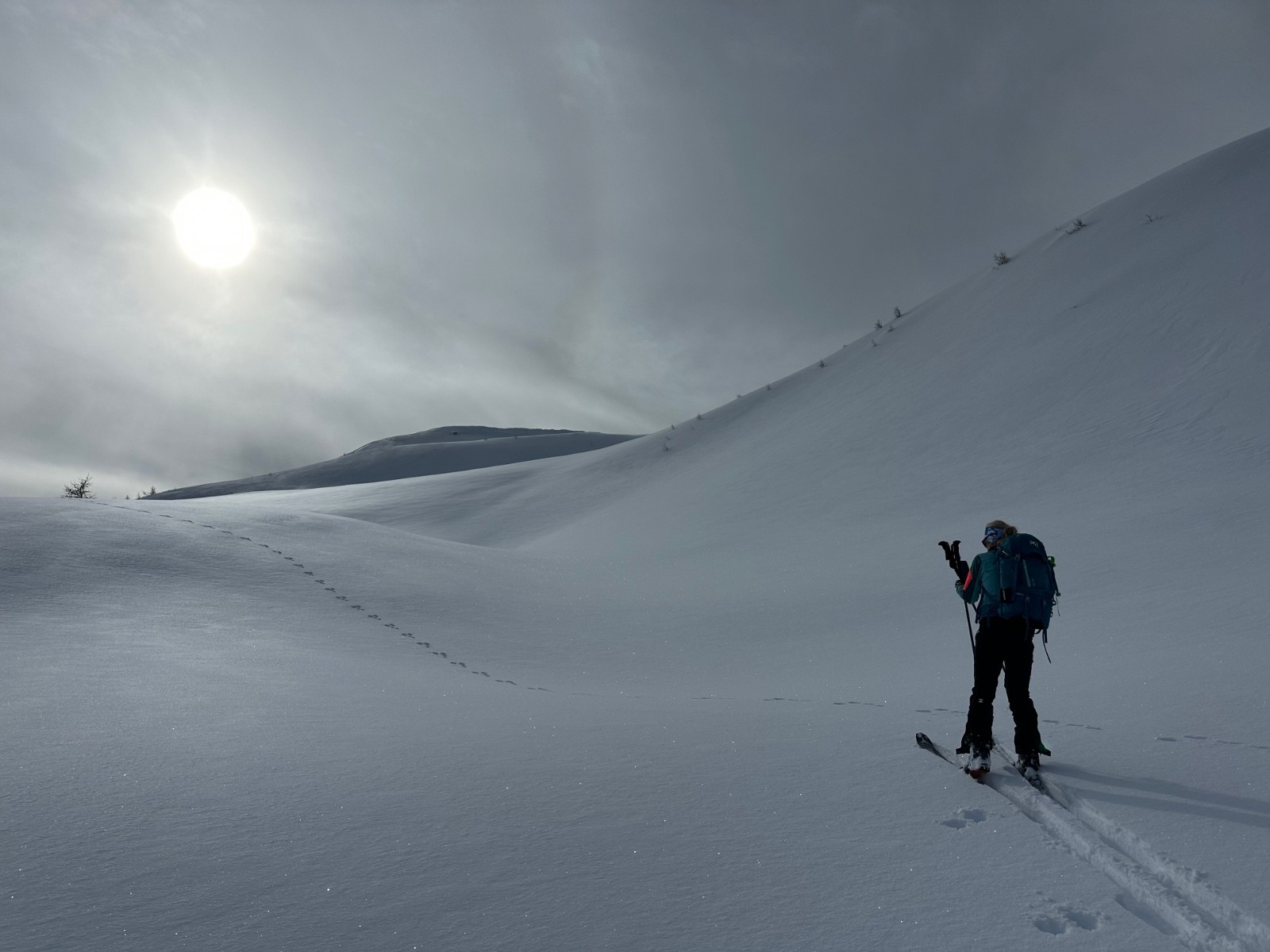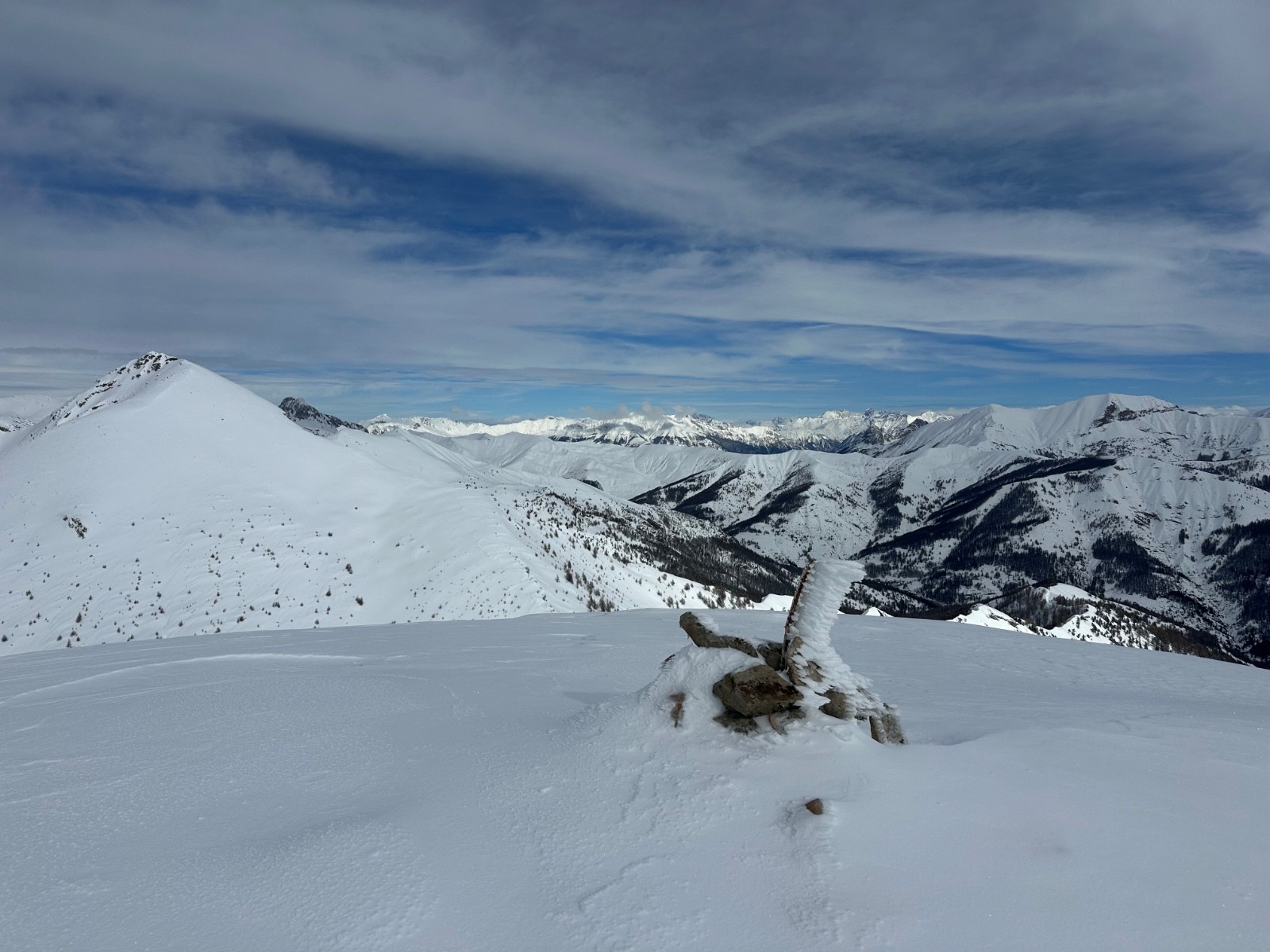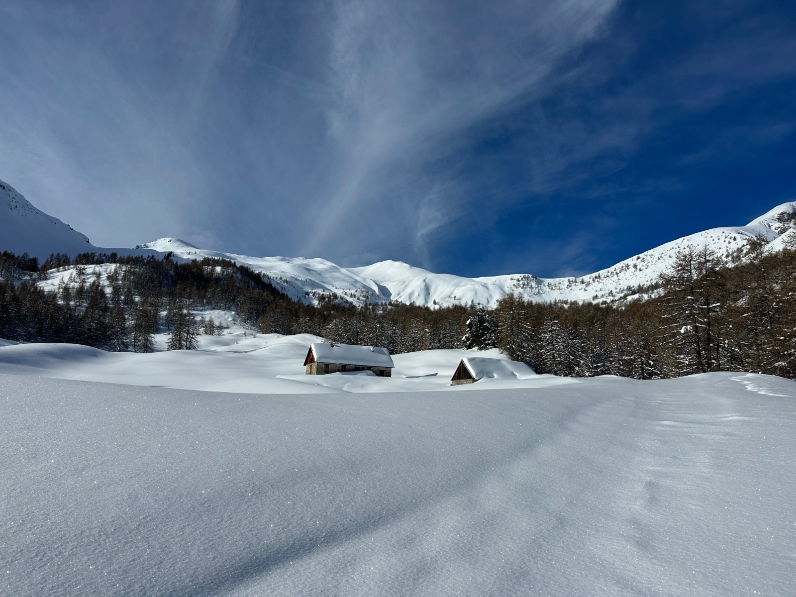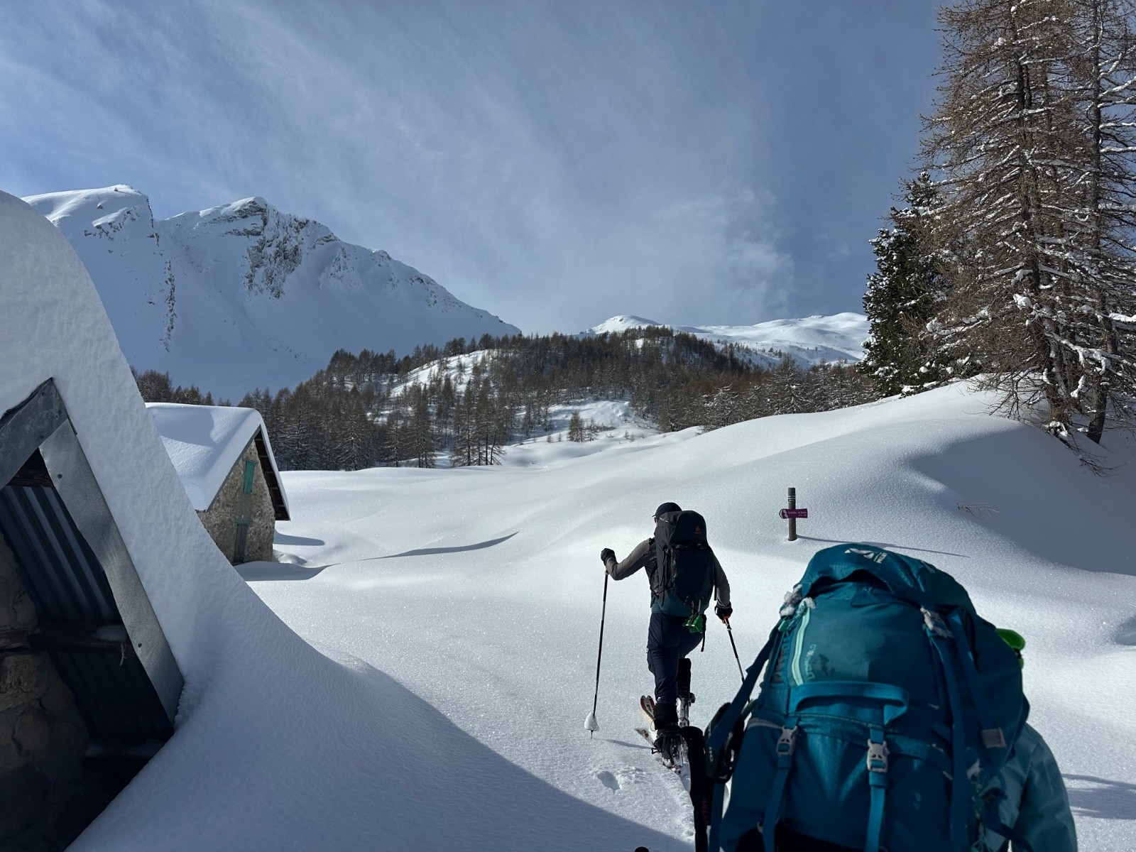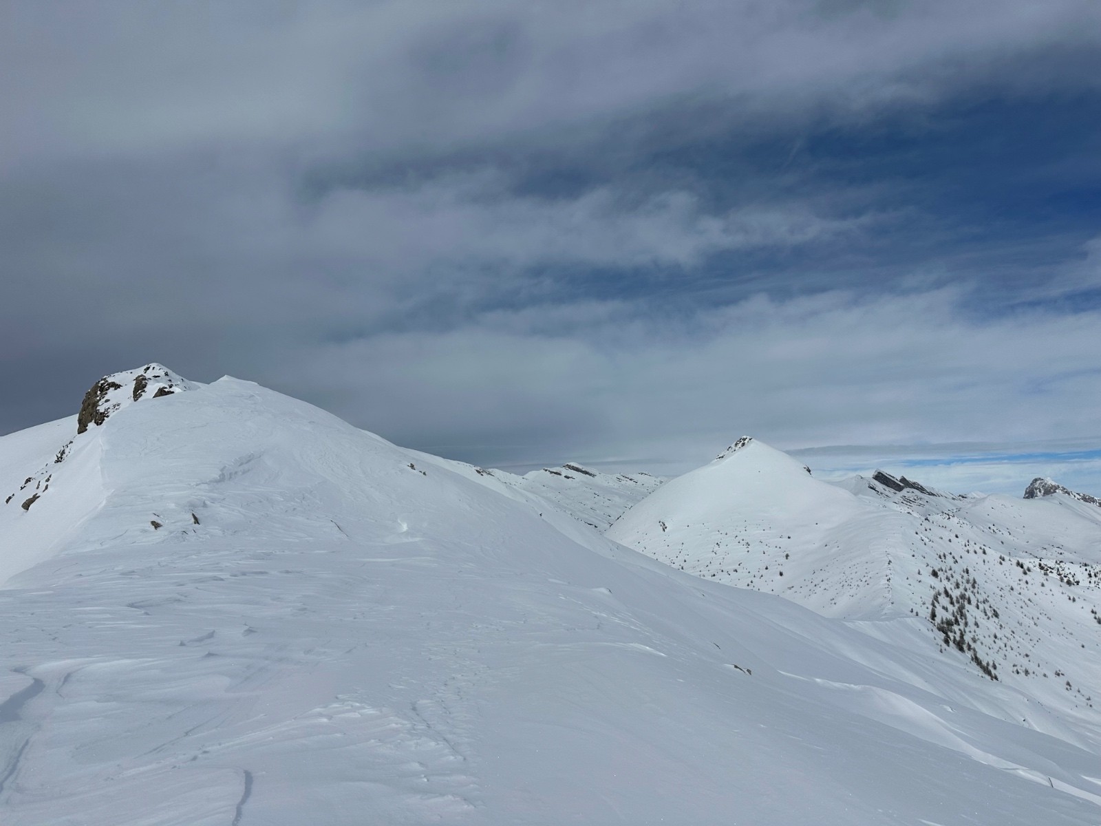 Conditions pour le ski : excellente. La neige est restée froide et poudreuse. À peine quelques crousties sous les arbres. Et un peu de croûte au plus bas.