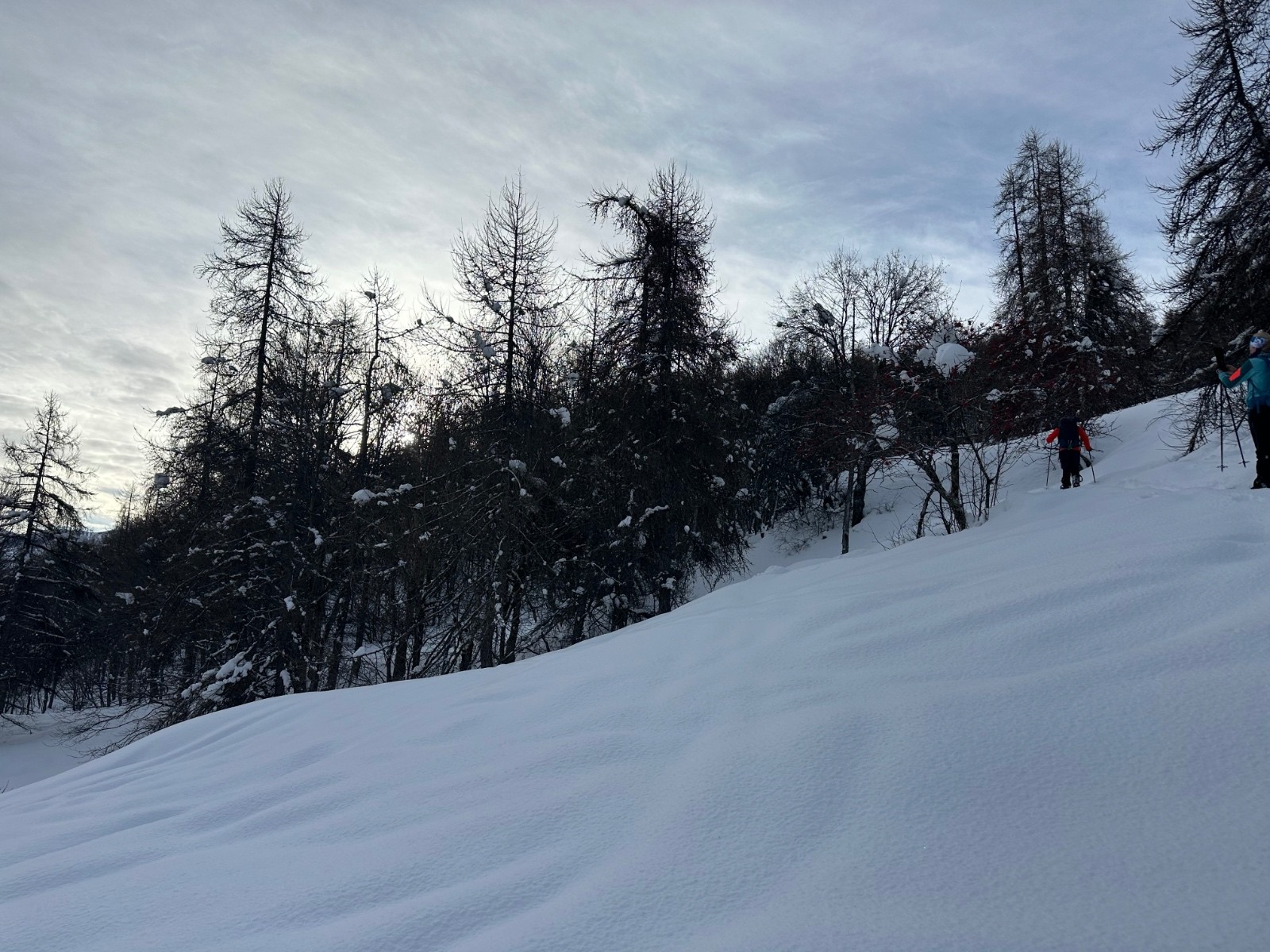Conditions nivo et activité avalancheuse : manteau bien stabilisé sur le parcours, les quelques pentes de 30 traversées ou skiées n’ont rien montrer. Pas de purges ou de traces d’avalanches y comprend dans le raide.