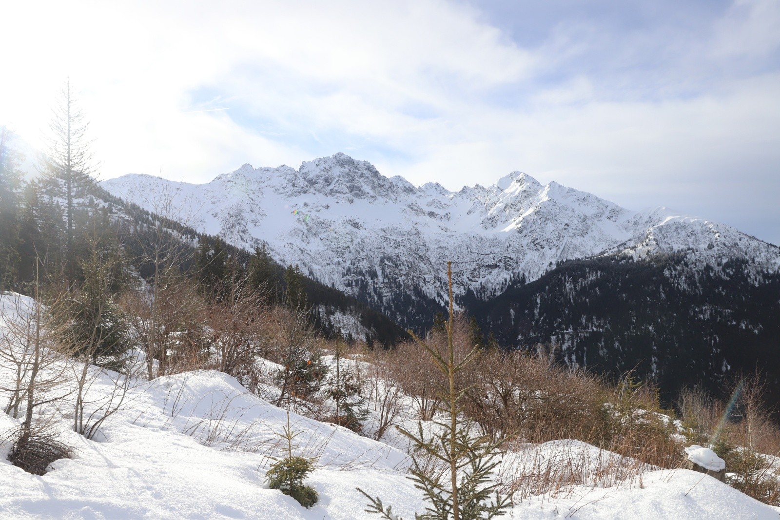 Nous visons la Montagne du Pré de l'Arc, malheureusement le pied de l'arête présente un enneigement déficitaire ainsi qu'une végétation bien dense ce qui ralentit encore notre progression.