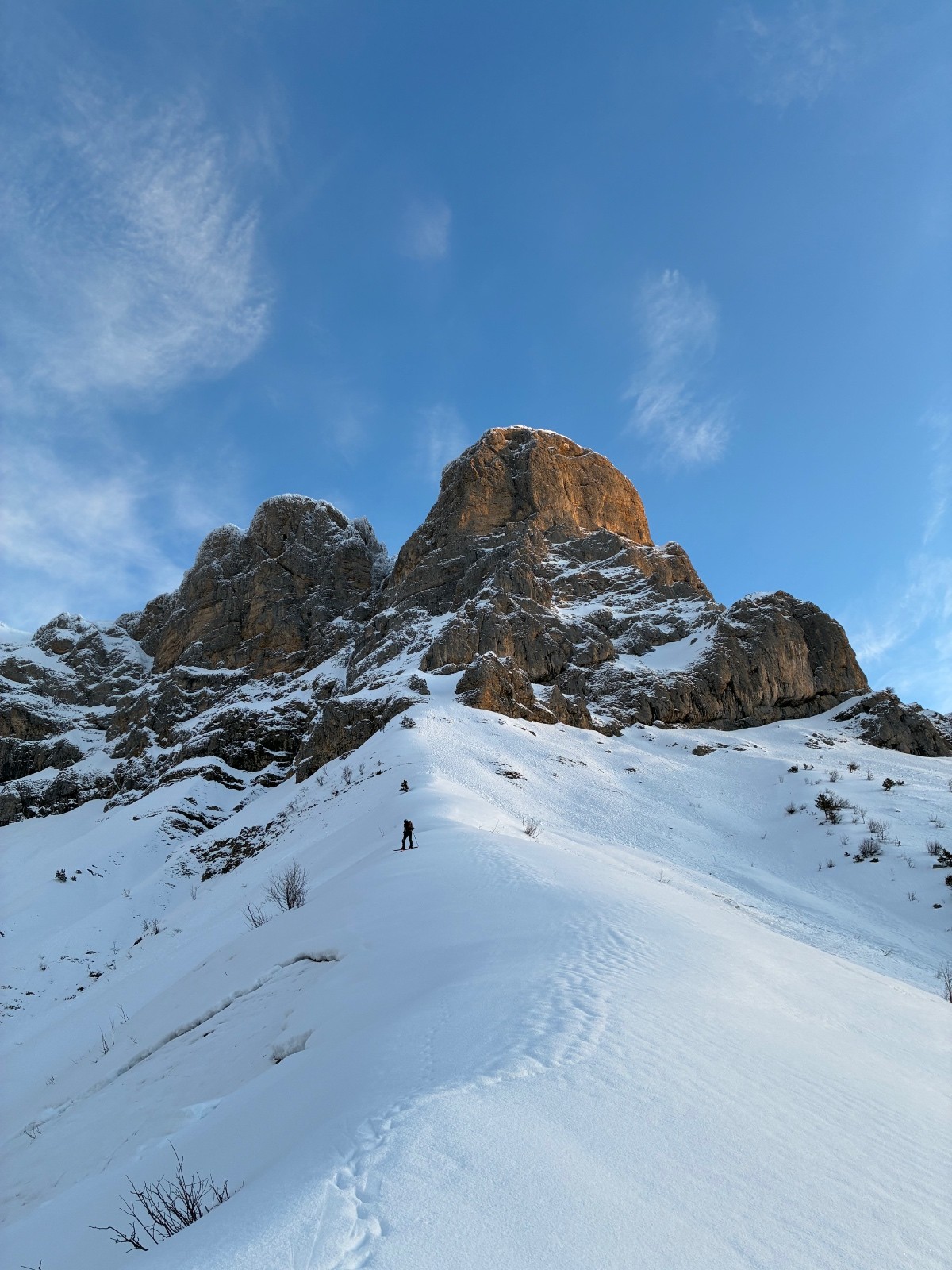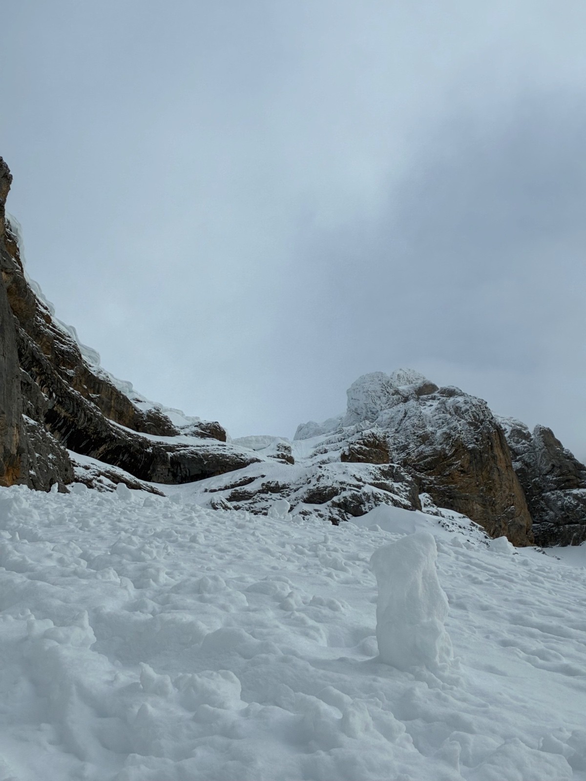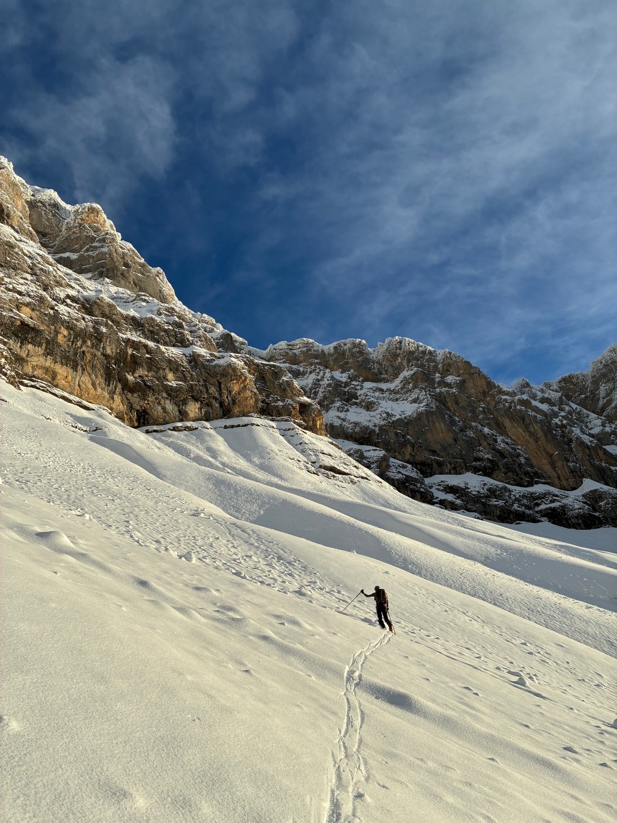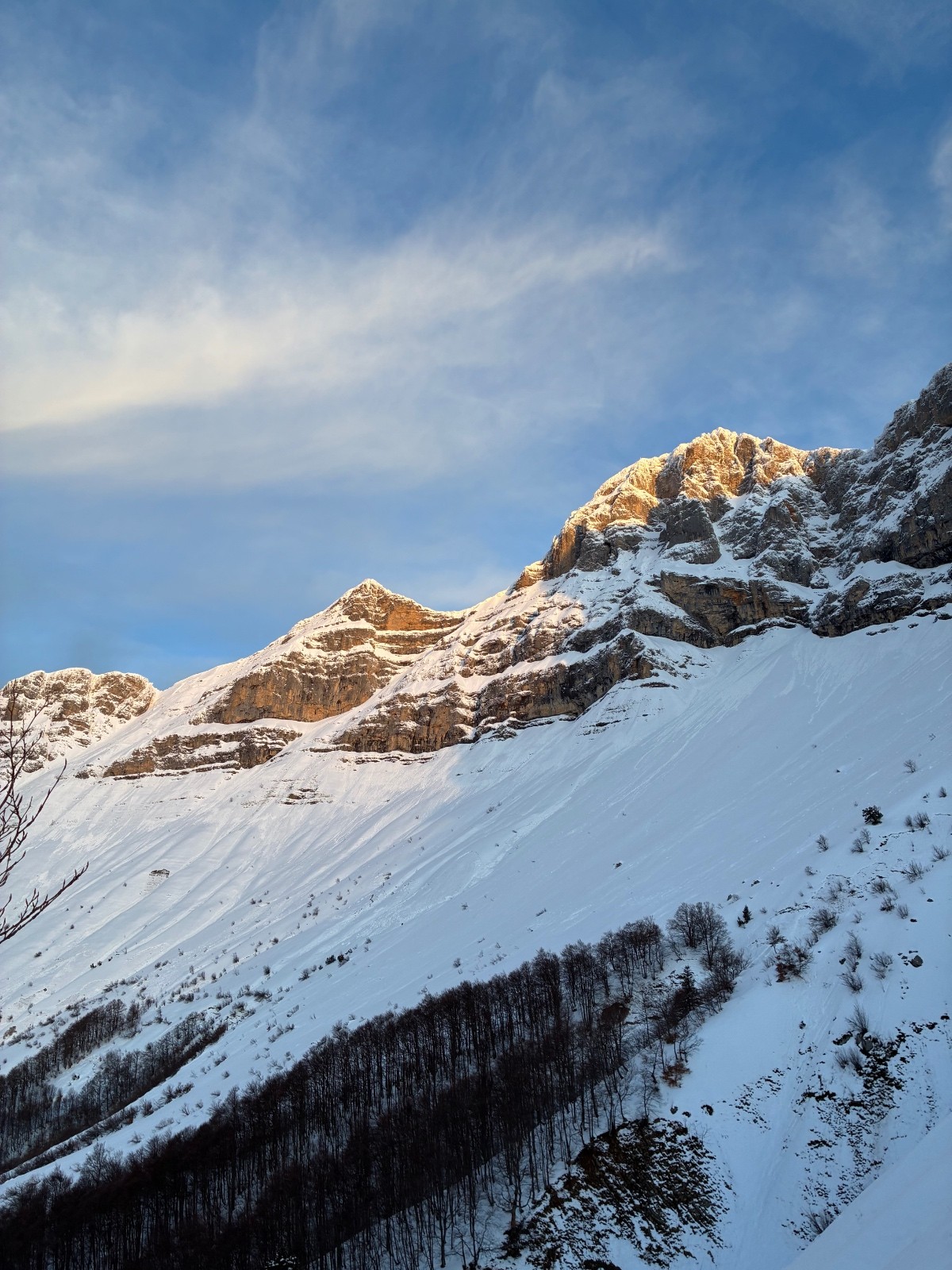 Skiabilité mauvaise en début de matinée, croûte de 10cm sur toute la face, fond mou, un peu meilleur dans la forêt.