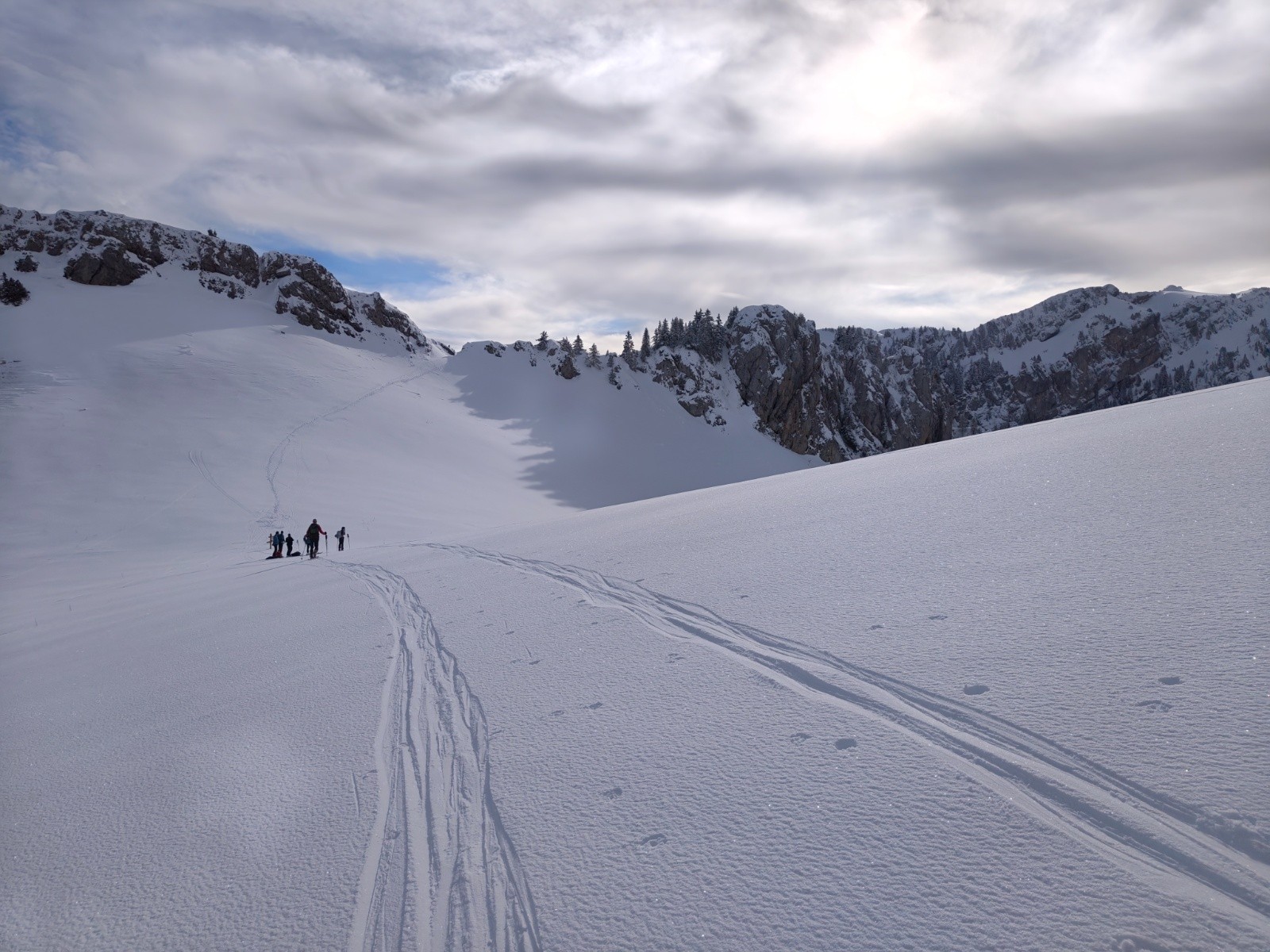 Conditions un peu moins pires que ce à quoi je m'attendais avec la pluie d'hier. Sommet bon, légère couche de neige fraîche sur fond dur, puis crouté sur la majeure partie de la descente. Forêt et border final agréablement transfo, bien skiable malgré quelques requins .