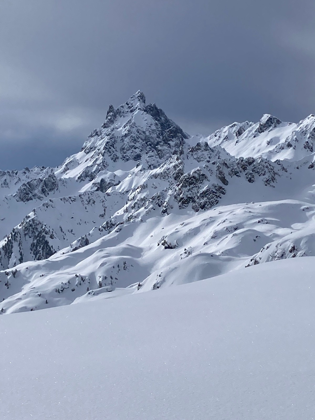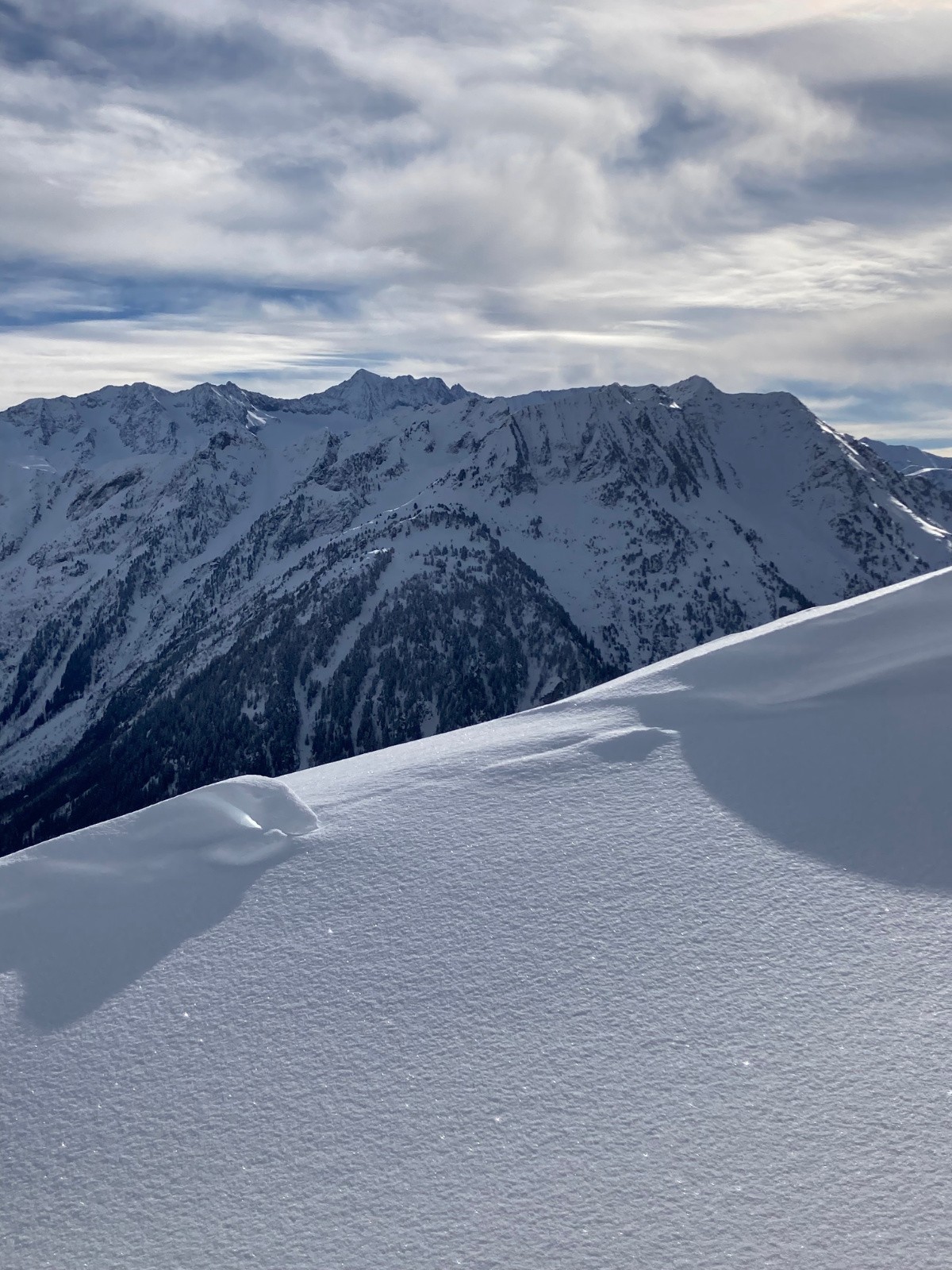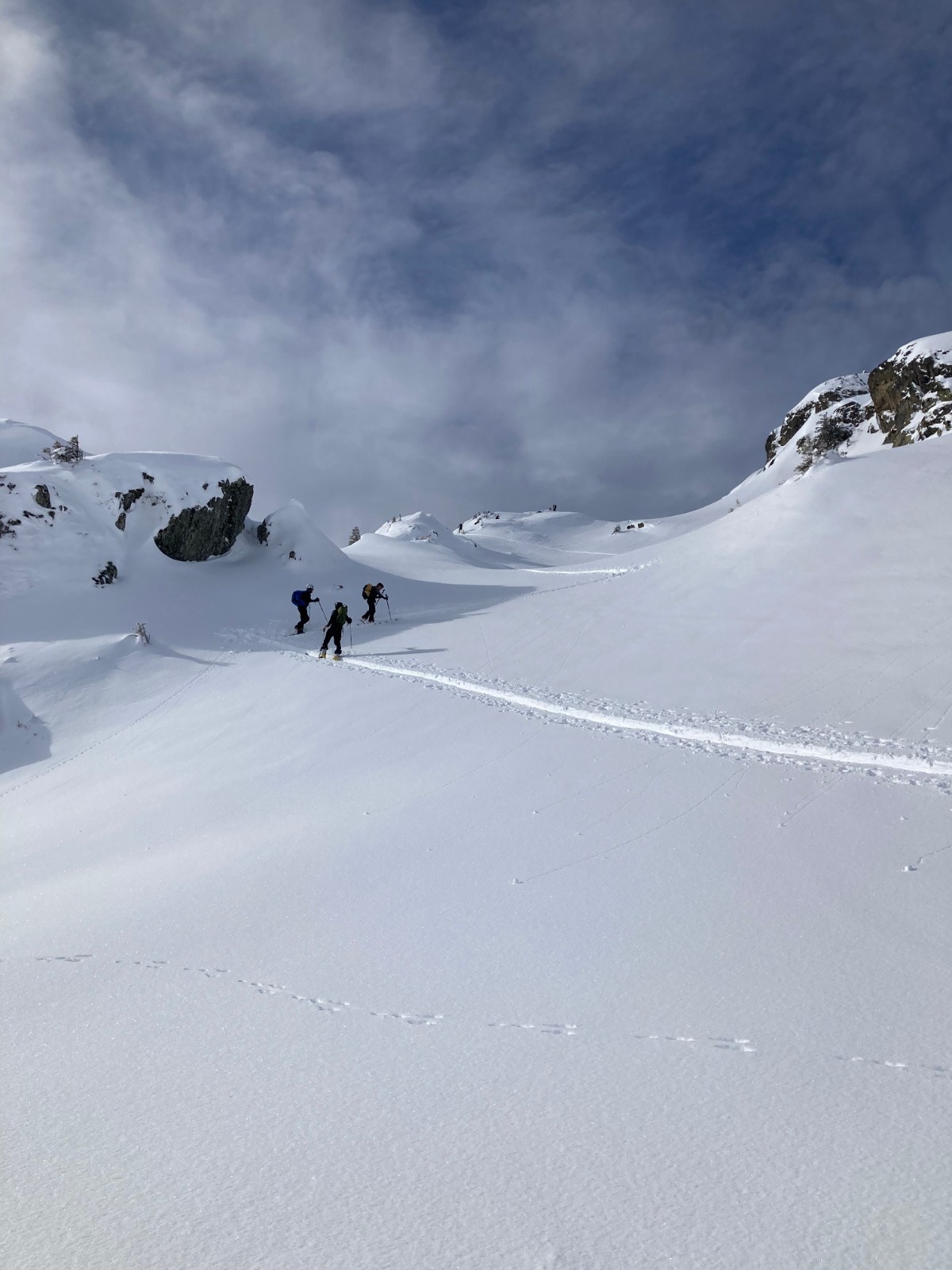 Conditions nivo et activité avalancheuse : Neige dure jusqu'à 1600m environ ; neige poudreuse densifiée dans la montée au Pas de la Coche et dans le cirque nord sous le Sifflet ; neige en cours d'humidification sur le passage au Sud entre Pas de la Coche et Sifflet. La neige commence à crouter sur les versants ensoleillés