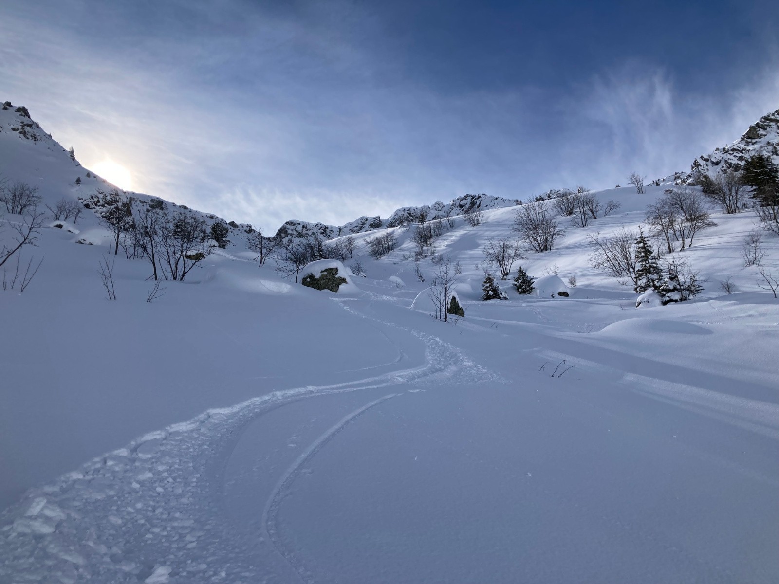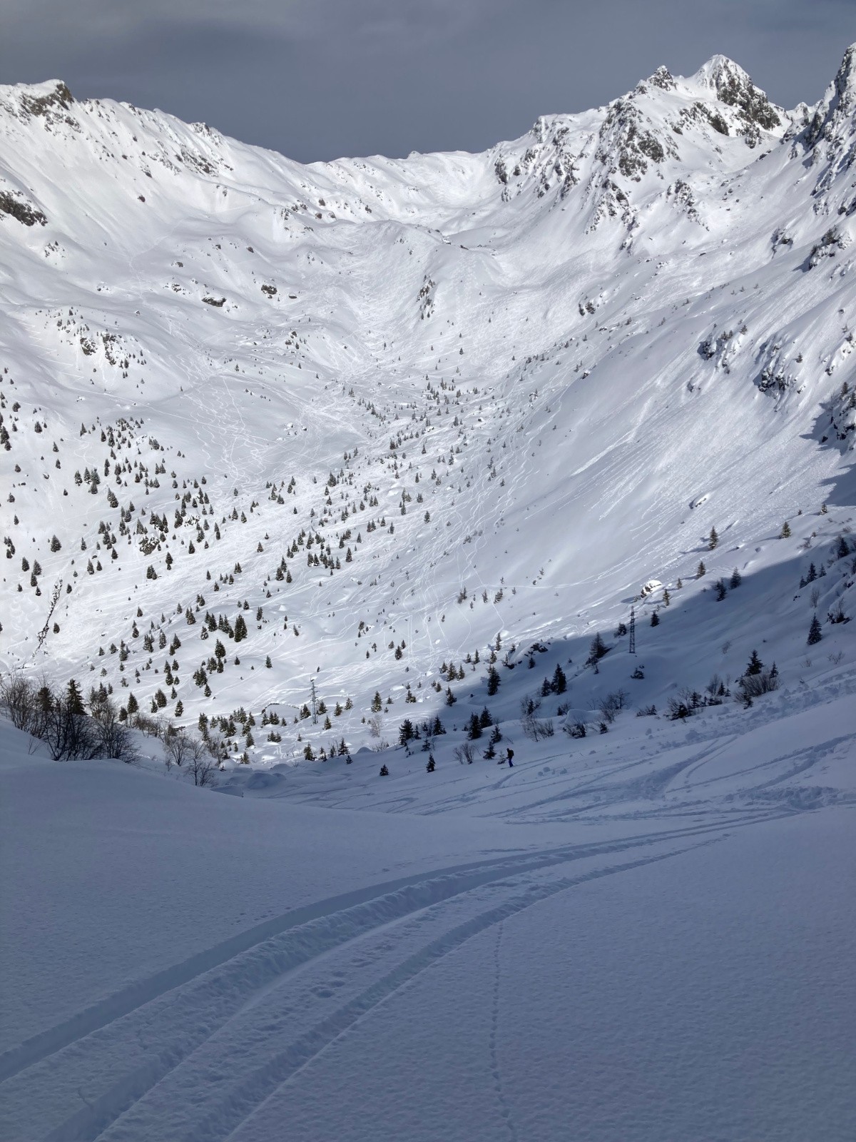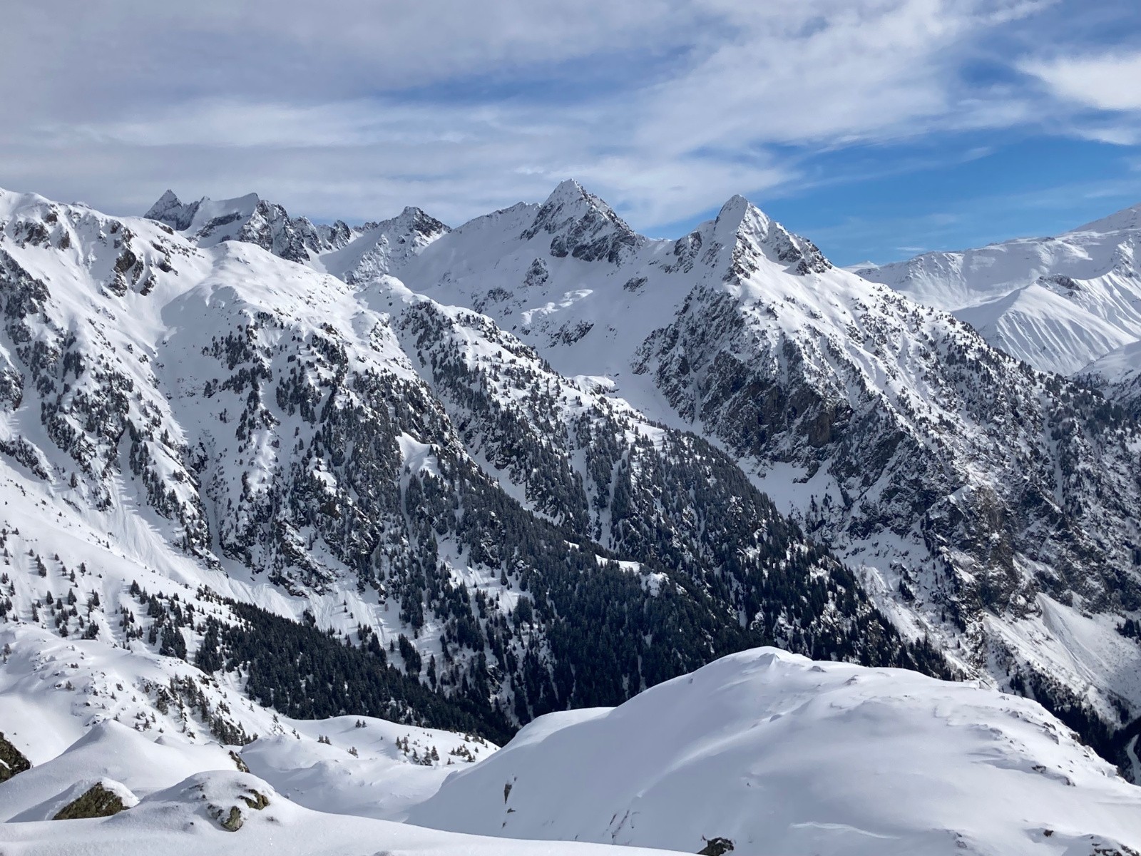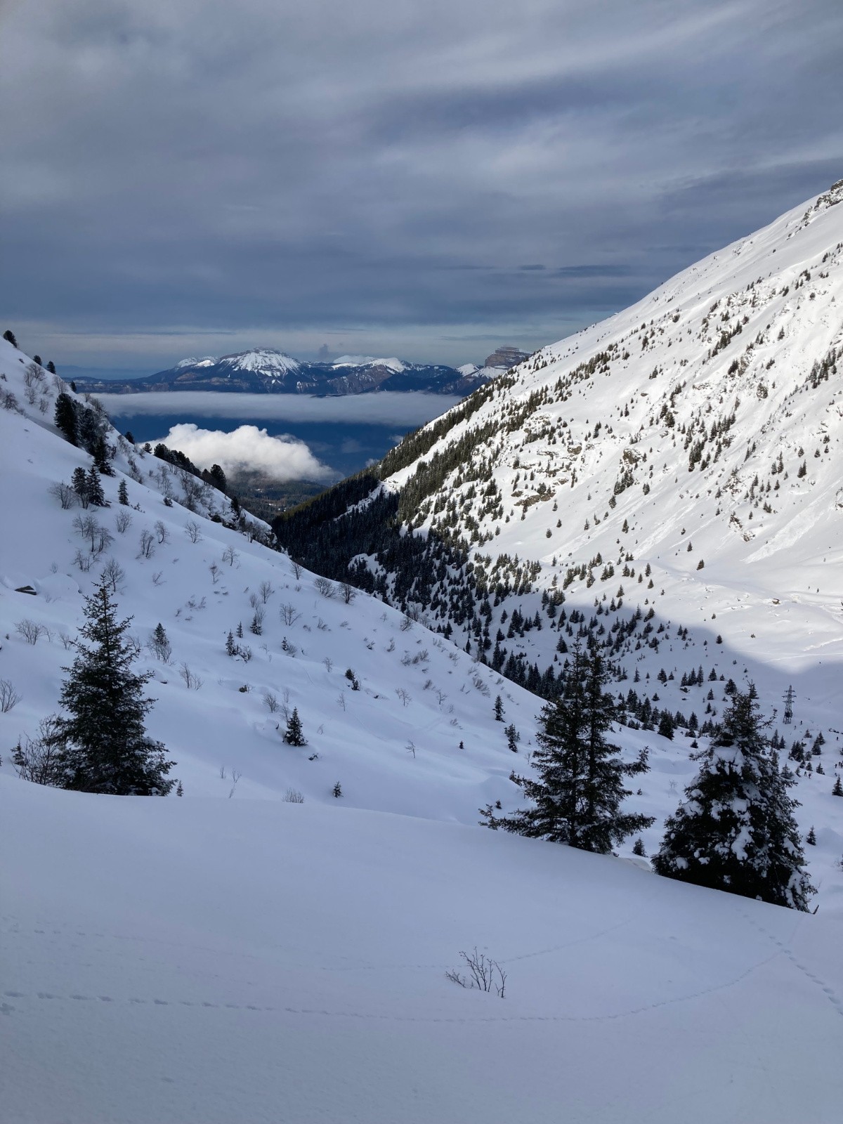 Conditions nivo et activité avalancheuse : Neige dure jusqu'à 1600m environ ; neige poudreuse densifiée dans la montée au Pas de la Coche et dans le cirque nord sous le Sifflet ; neige en cours d'humidification sur le passage au Sud entre Pas de la Coche et Sifflet. La neige commence à crouter sur les versants ensoleillés