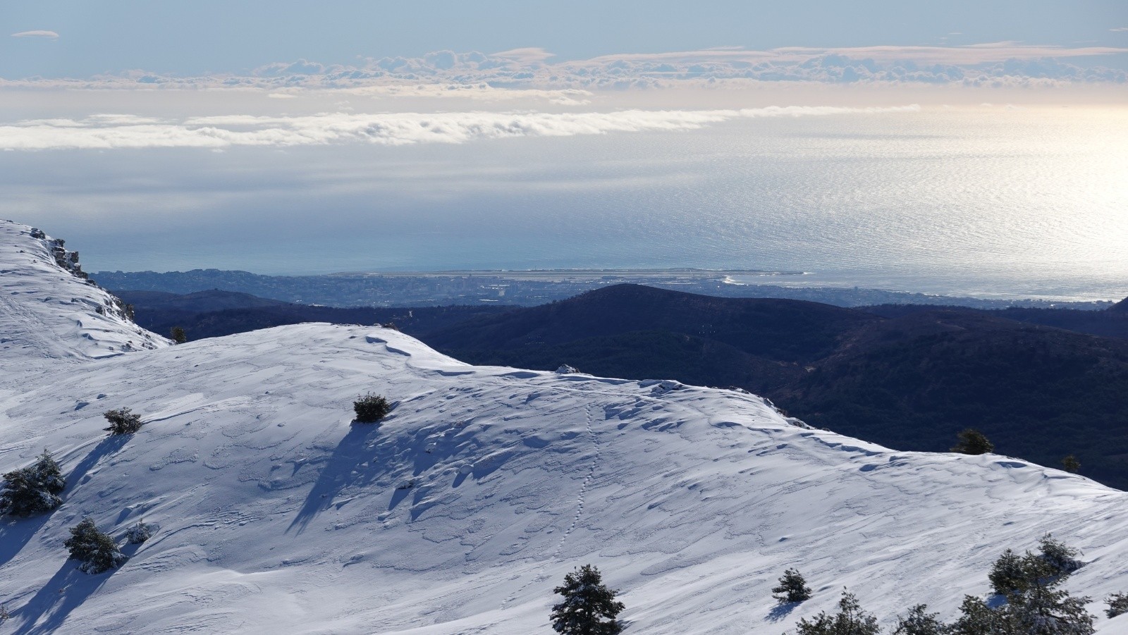 Départ à 9h45 avec un thermomètre affichant 3°C, dans une ambiance déjà agréable et une première montée tranquille dans cette neige fraîche humide d’environ 10 à 15 cm d'épaisseur, travaillée par le vent qui formait parfois de petites congères et des zones plus compactes. Au sommet de cette première Cime, un vent frais désagréable mais toujours cette vue panoramique caractéristique du secteur, avec la côte méditerranéenne en contrebas et, au nord, le massif du Mercantour bien enneigé qui barre l’horizon. Les Préalpes de Grasse quand la neige est présente proposent ces magnifiques contrastes entre mer et montagne qui donnent cette atmosphère très particulière, presque printanière mais encore pleinement hivernale en altitude. D'ailleurs, même un vendredi, il n'y a qu'à voir la fréquentation du secteur avec toujours beaucoup de skieurs de randonnées et de raquetteurs. Malgré cette texture un peu lourde, le ski est resté correct dans l’ensemble pour la première descente. Repeautage pour une seconde ascension avec un vent qui s'est calmé et du coup une ambiance bien printanière au sommet de cette seconde Cime.