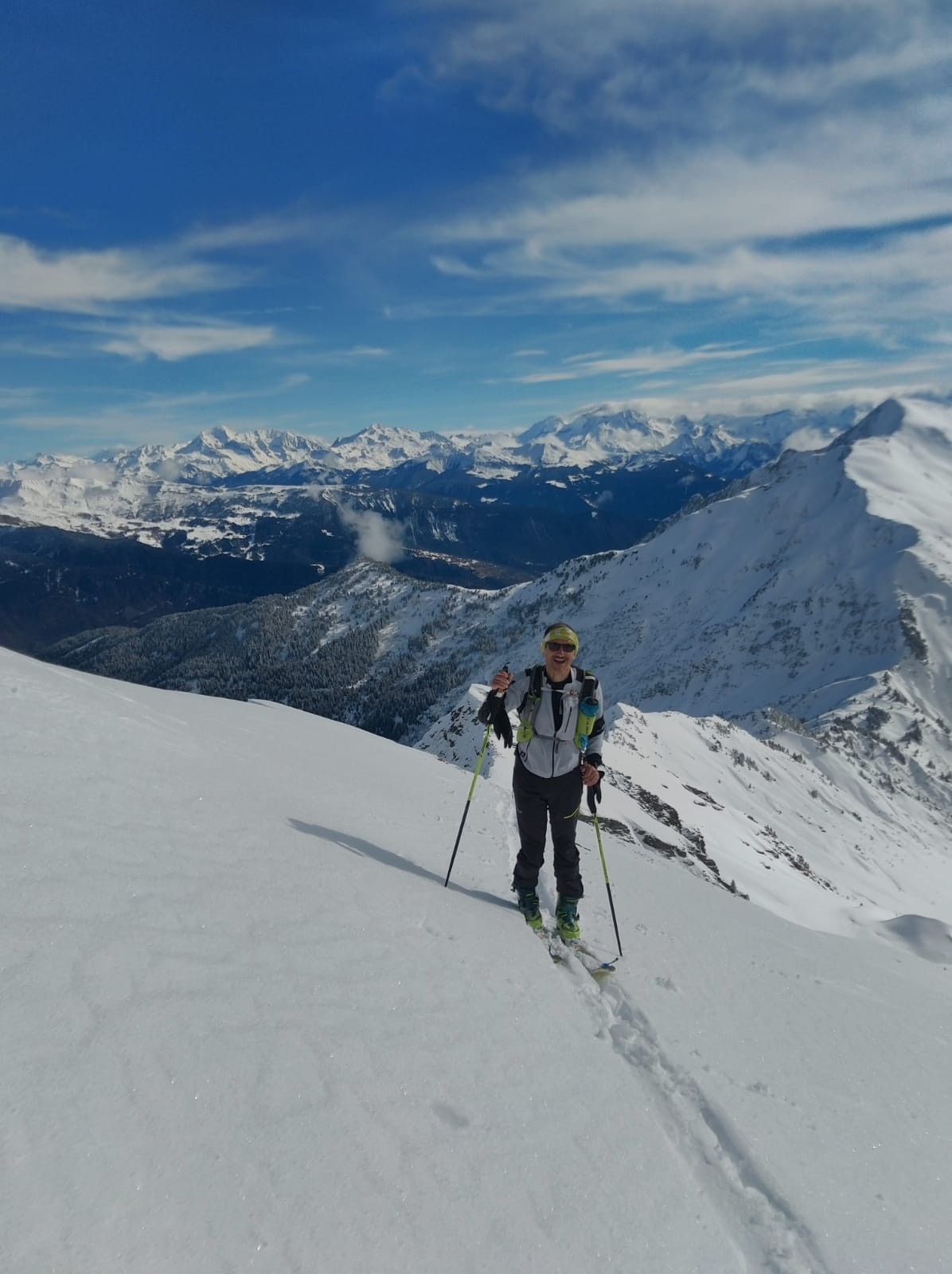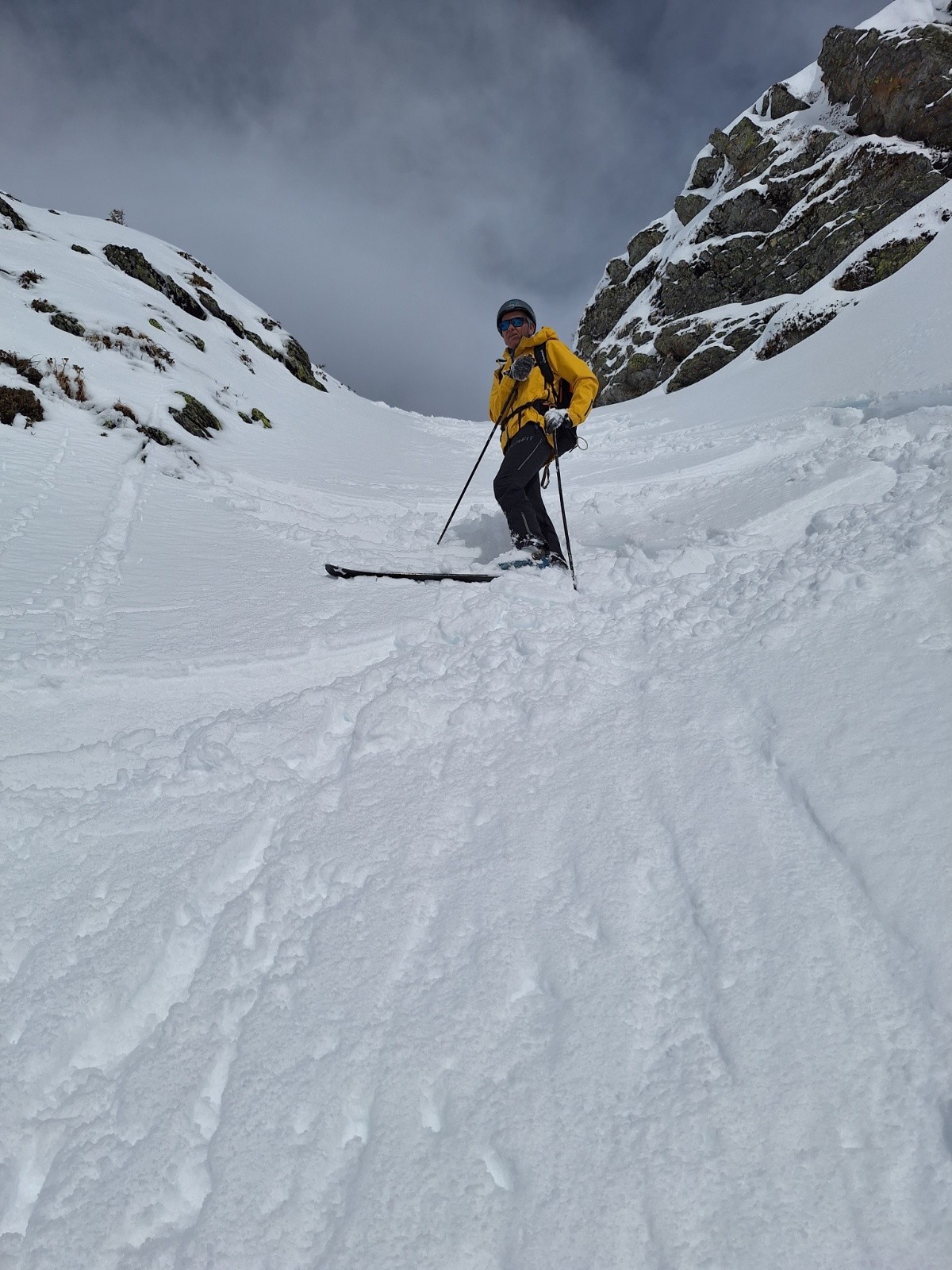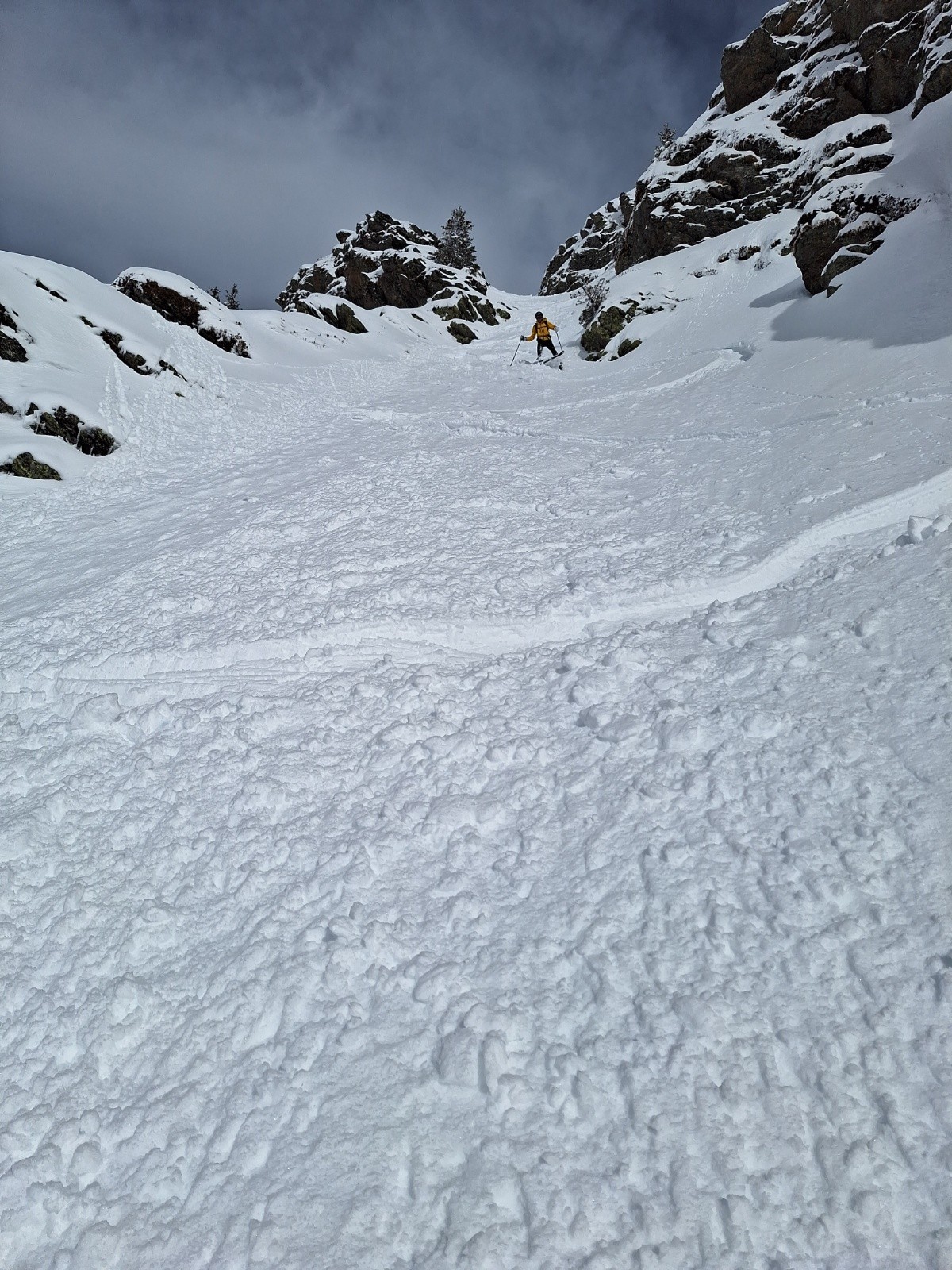 Avant cela la montée a été laborieuse, en raison d'une neige très lourde a tracer et surtout collante sur les 2 faces du ski. La bonne contrepartie, dans la pente finale a 40 °, c'est qu'elle colle bien aussi à la sous couche mi dure, qui pourtant repose elle même, dans un sandwich douteux, sur une 3iem couche molle.