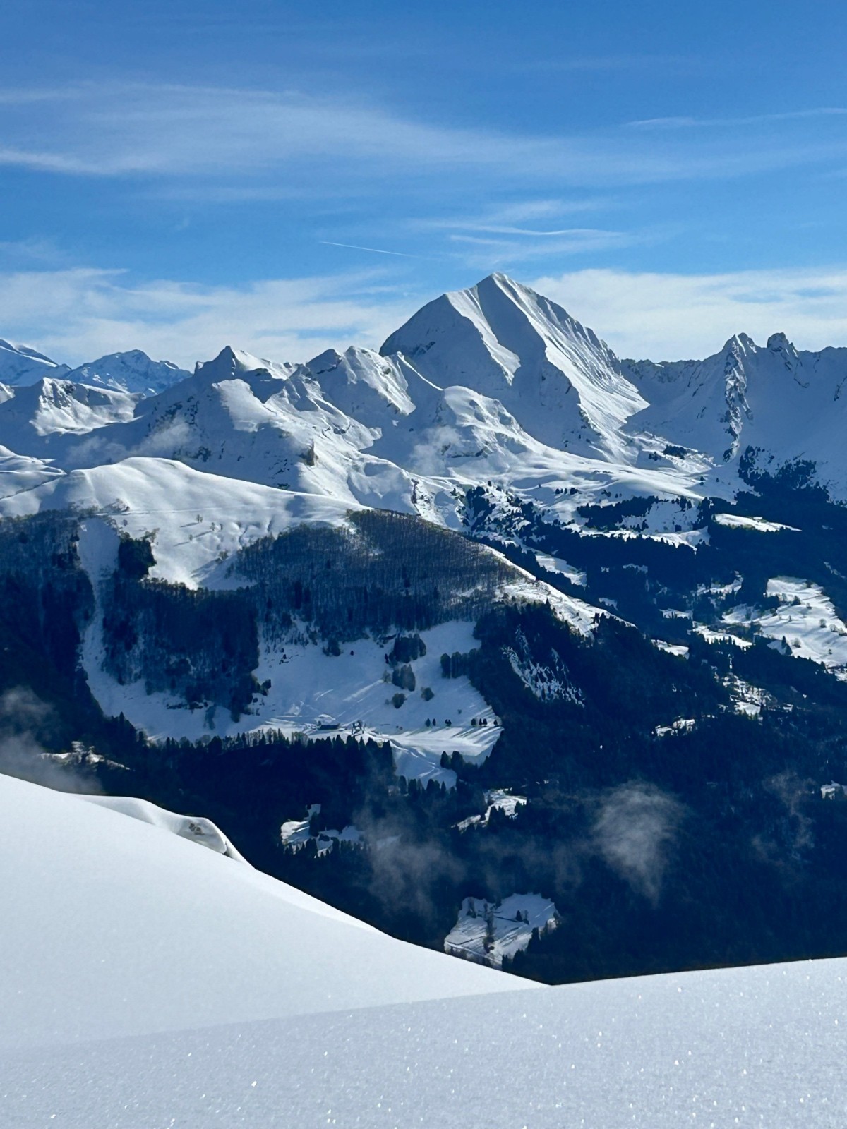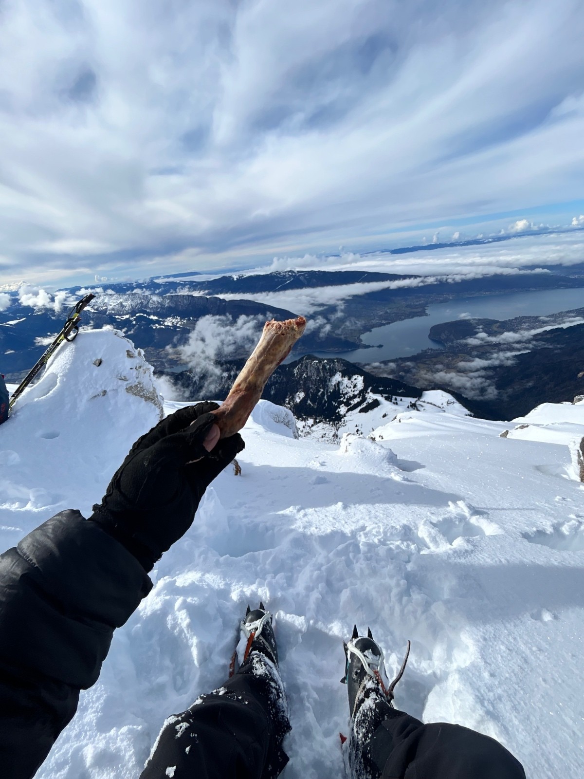 Une fois sorti de la forêt on rattrape le peloton (on est parti tard). On dépasse 3 mecs qui montaient avec leurs chaussures en mode descente …. Ils en chiaient (normal). Je leur ai rien dit 😂. Au pied du mur final, c’est lunaire. 20 personnes à la queuleuleu, sans tellement de distances. Si ça part, au moins nous 4 on pourra en sortir quelques uns. On a décidé de tracer complètement à gauche pour être loin de la foule. Le petit couloir / ressaut sommital y’a des bouchons. Le hilary step de la yaute (ou alors c’est le petit passage sur l’arête des bosses avant d’arriver au MB le hilary step?). Entre ceux qui veulent pas mettre les crampons mais qui se mettent au taquet, ceux qui montent, ceux qui descendent, les à l’aise, les pas à l’aise... Finalement on y sera arrivé en haut ! Heureusement que je pratique l’alpinisme assidûment et que mes comparses sont des montagnards aguerris sinon c’était mal barré pour nous l’affaire. Au sommet on reste longtemps. On profite. On décide de redescendre le ressaut, entre temps je chope un onglet d’enc**é en attendant qu’une personne arrête de remplir son pantalon ortovox tout neuf (ça sentait snowleader annecy et autre chose). 25 minutes plus tard c’est notre tour ! On retourne aux skis. La descente c’est bien bien bon, bonne poudre encore froide sur les 2/3. Une section un peu croûté mais encore bien skiable. La forêt c’est béton donc selon votre niveau ça va de sanglier féroce à sanglier désemparé !
