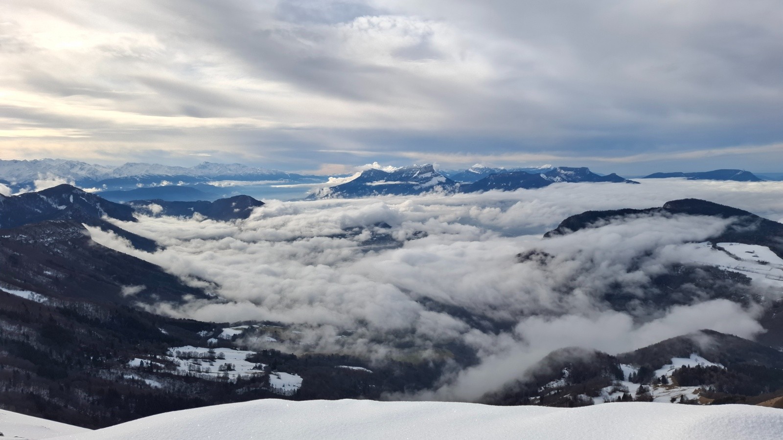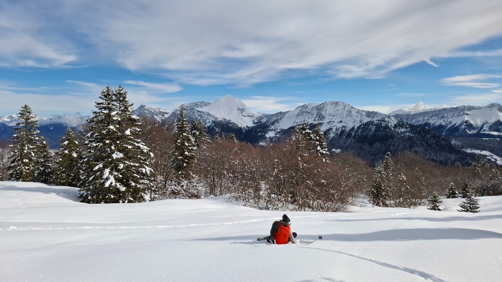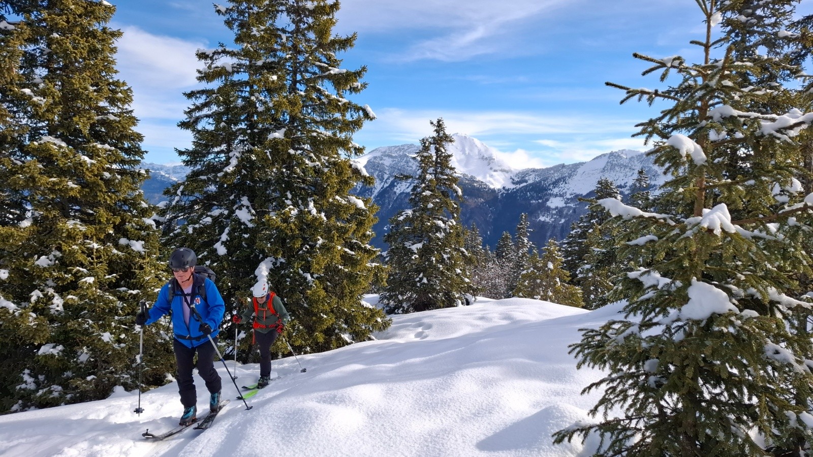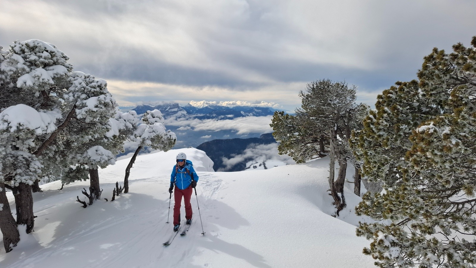 On attaque tranquillou par l'itinéraire de la crête, bcp de monde en rando mais y a la place, arrivés à la plate-forme de pic-nic on décide de faire une petite descente hors piste dans les petits sapins en longeantla falaise, c'est croûté portant à condition d'y aller molo 😆, on s'arrête quand la croute casse, mais pas pour le casse croute ! Trop tôt ! On reprend la crête jusqu'au sommet cette fois, et là on casse la croute, c'est l'heure !
