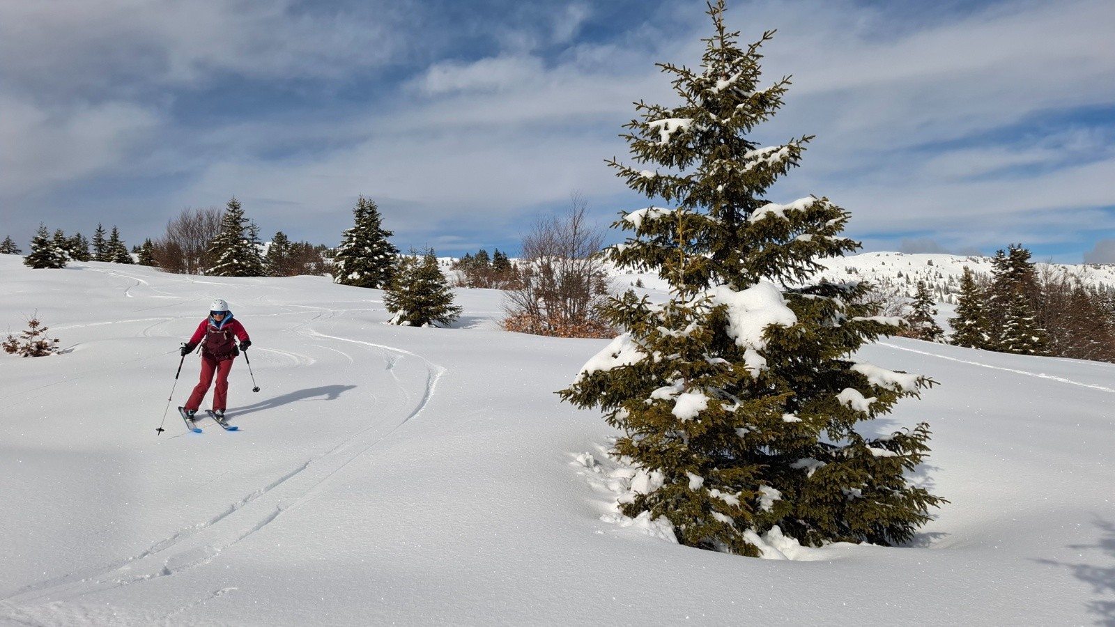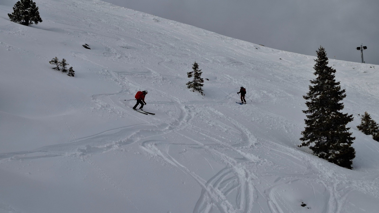 Il fait bon, pas de vent, le soleil arrive à percer. On attaque la descente en hors piste longeant le mur du golet, poudre dense pas trop trafolée, et la piste bleue jusqu'à la station, très bonne neige.